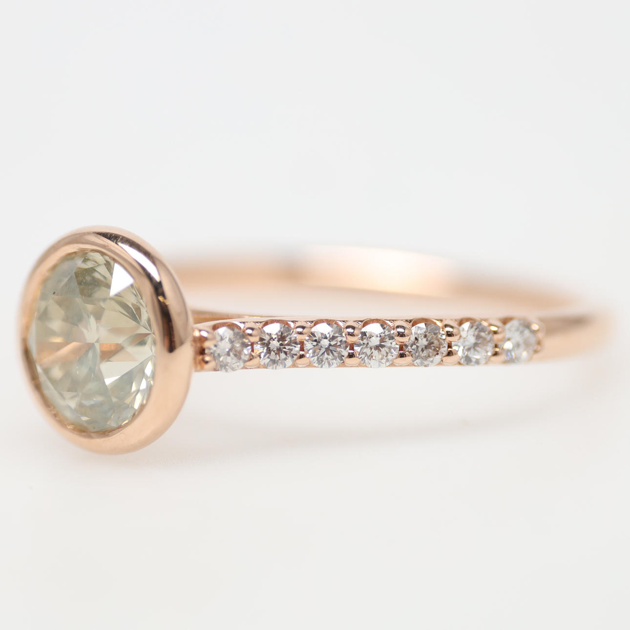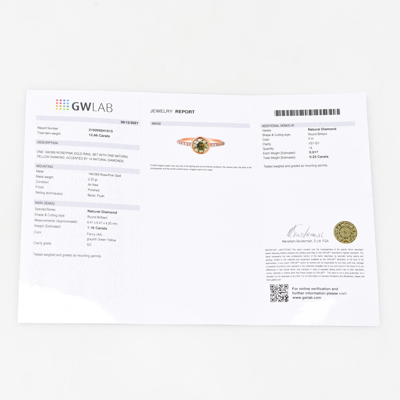 House of R&D. infattad gul diamant, brilliantslipad, 1,16 ct. Fancy (AA) grayish green yellow. SI2.