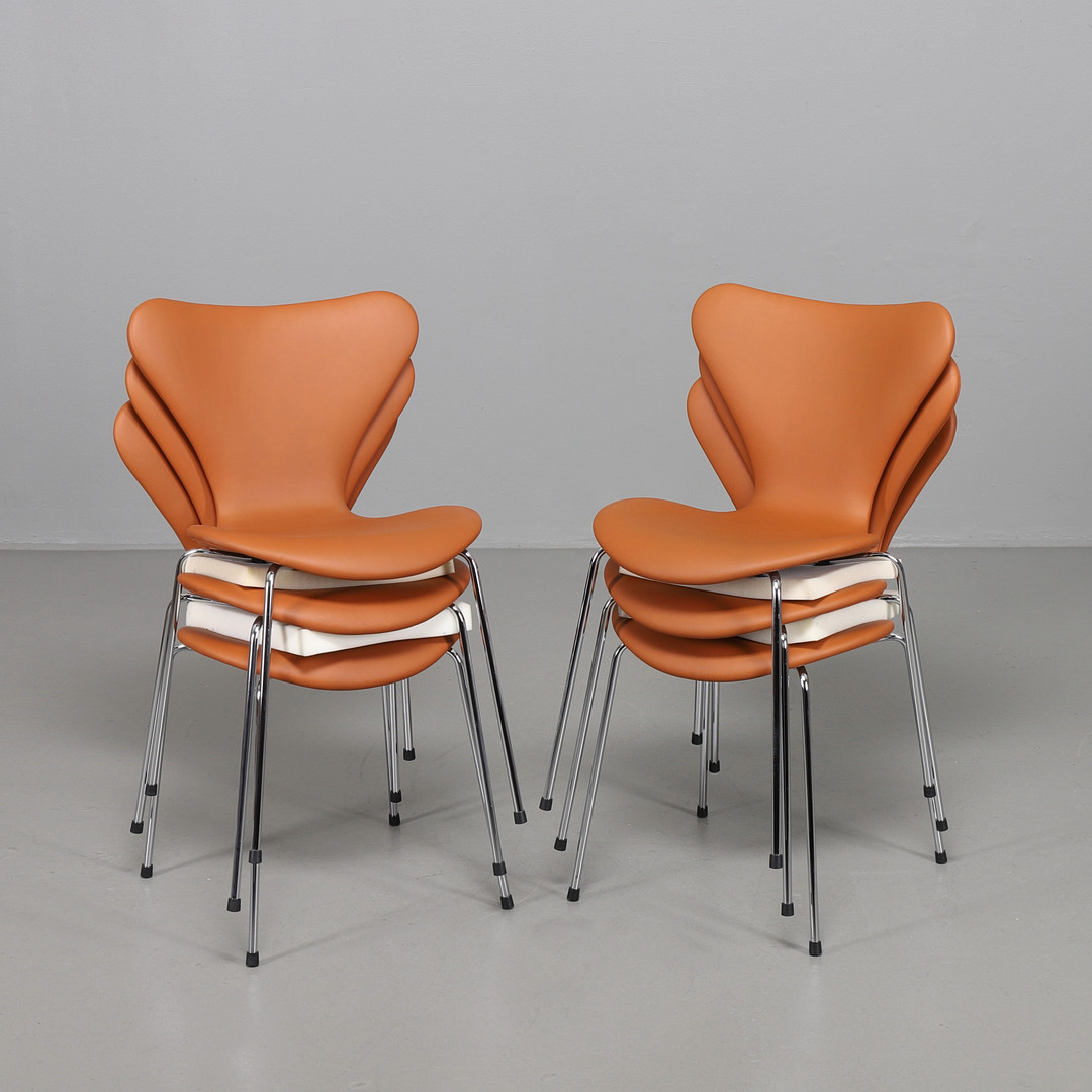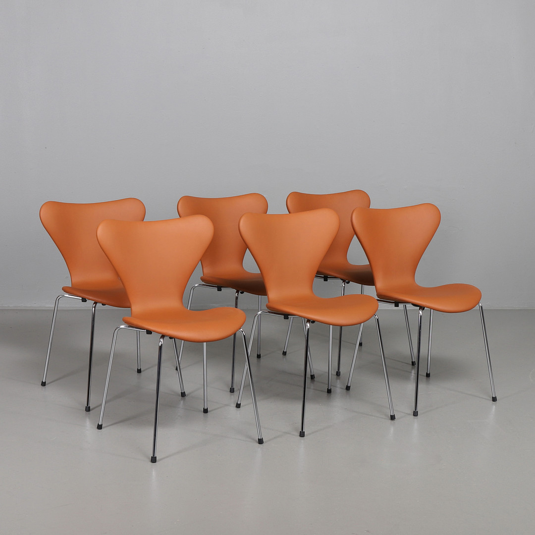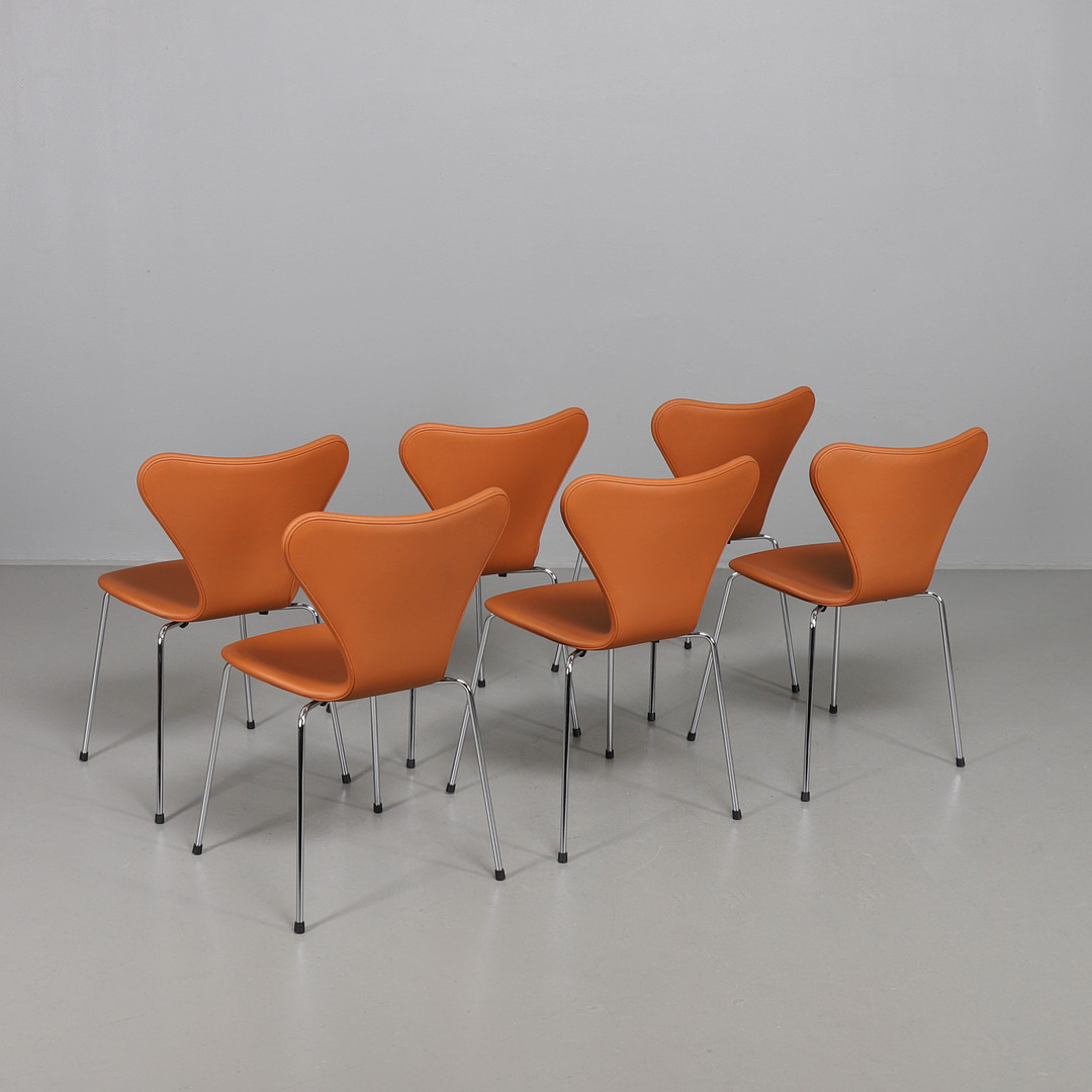 2241931. ARNE JACOBSEN. Sjuanstolar, 6 st i Elegance walnutsläder.