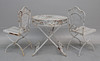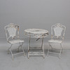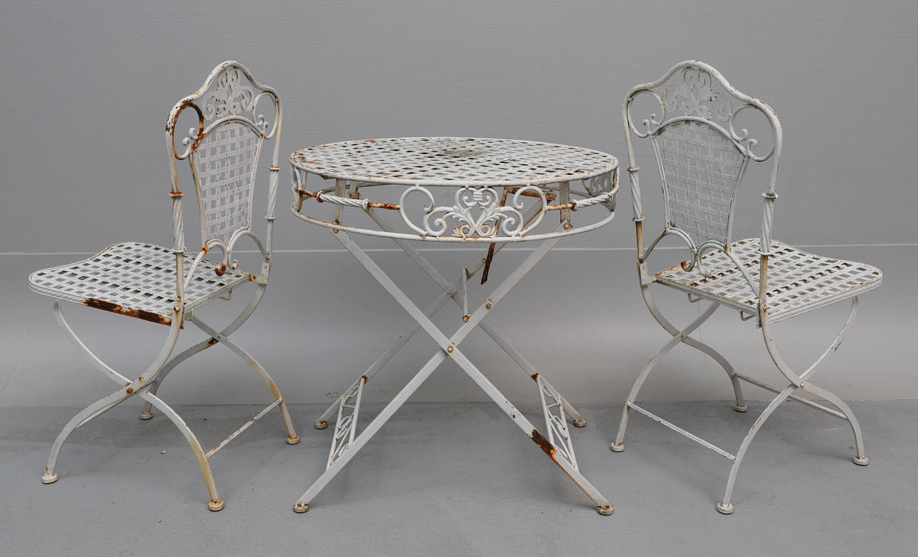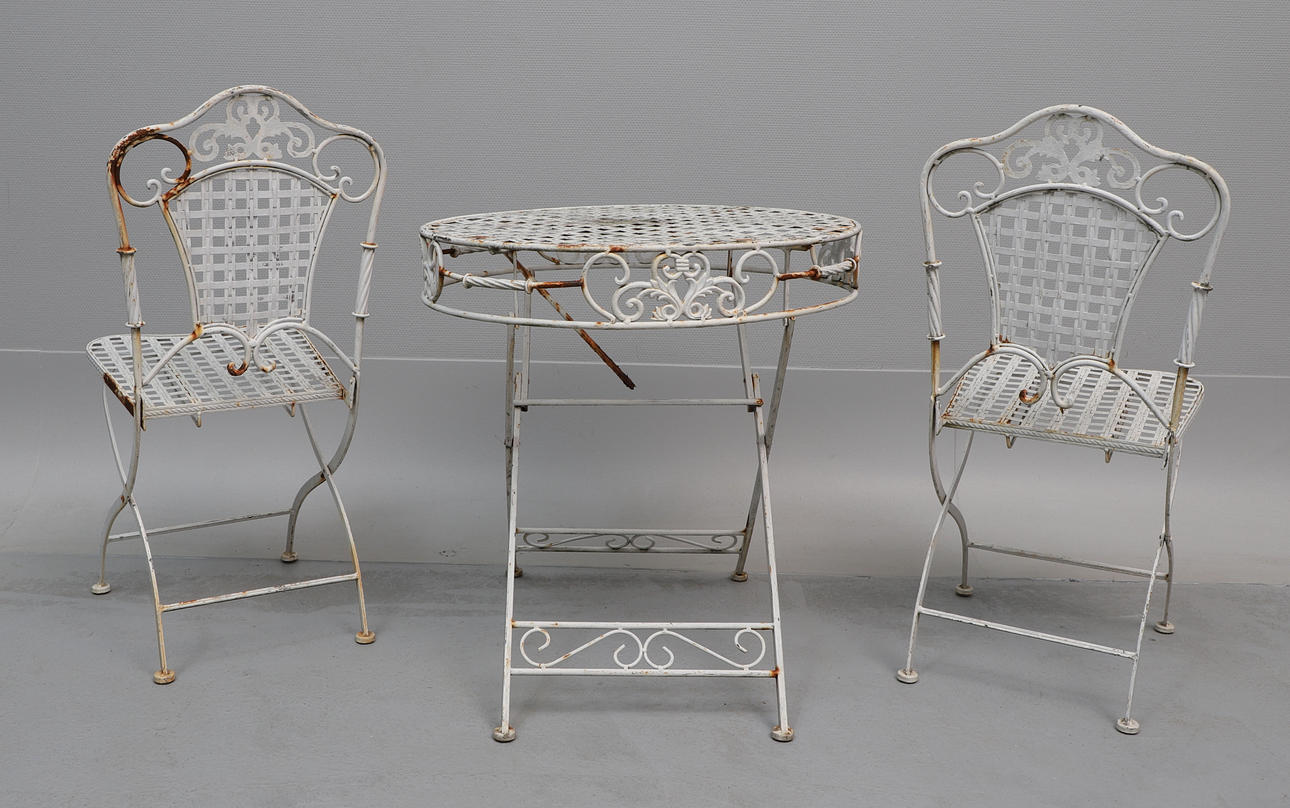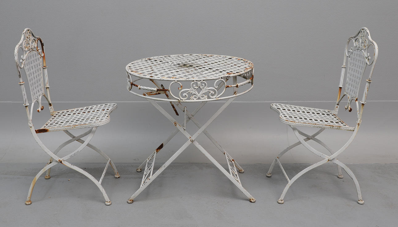 Bord, ca 69.5 cm i diameter, ca 71 cm högt. stolar, 2 st, rygghöjd ca 92 cm, sitthöjd ca 46.5 cm, bredd ca 38.5 cm. Hoppfällbart.