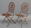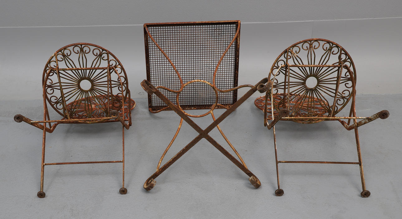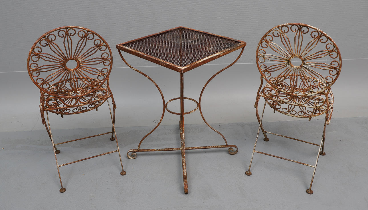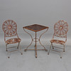 Stolar, 2 st, rygghöjd ca 93 cm, sitthöjd ca 46.5 cm, bredd ca 41.5 cm, hopfällbara. Bord, ca 50.5x50 cm, höjd ca 76 cm.