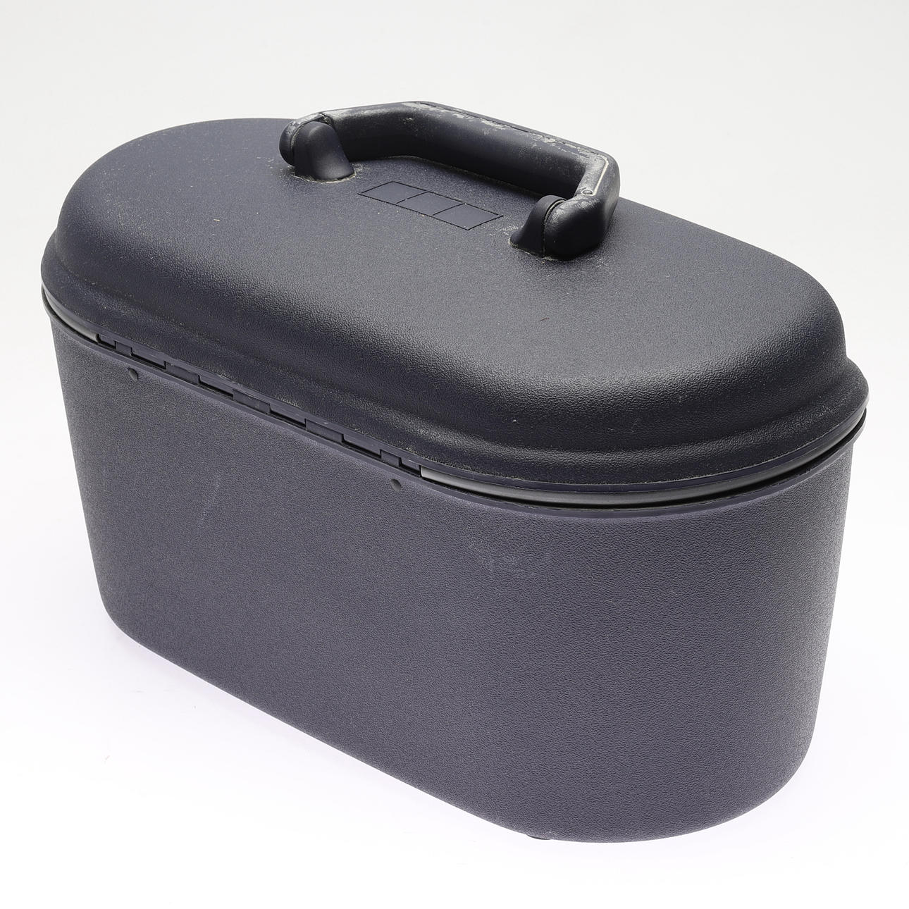 Plast. Invändig tygficka och inredning med spegel. Bredd ca 37. Djup ca 21. Höjd ca 24 cm.