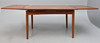 den rektangulära toppen med lätt böjda sidor och ändar, på runda avsmalnande ben 122,5 cm bred x 85 cm djup x 72.5 cm hög, 216cm bred när den förlängs.