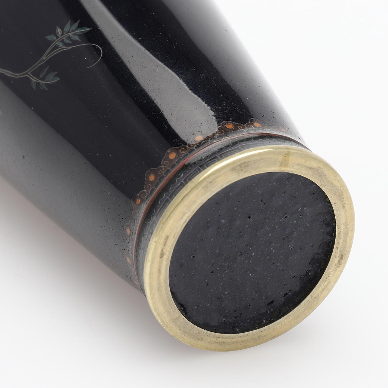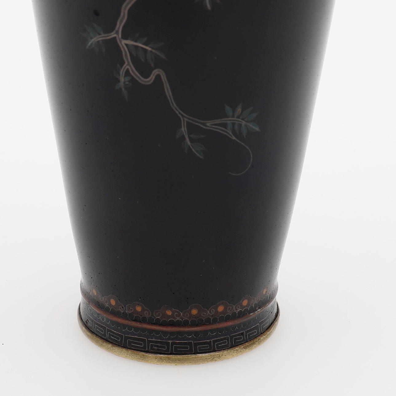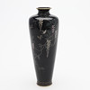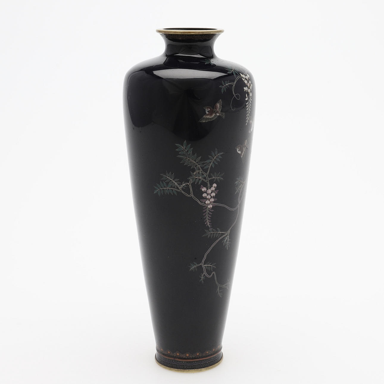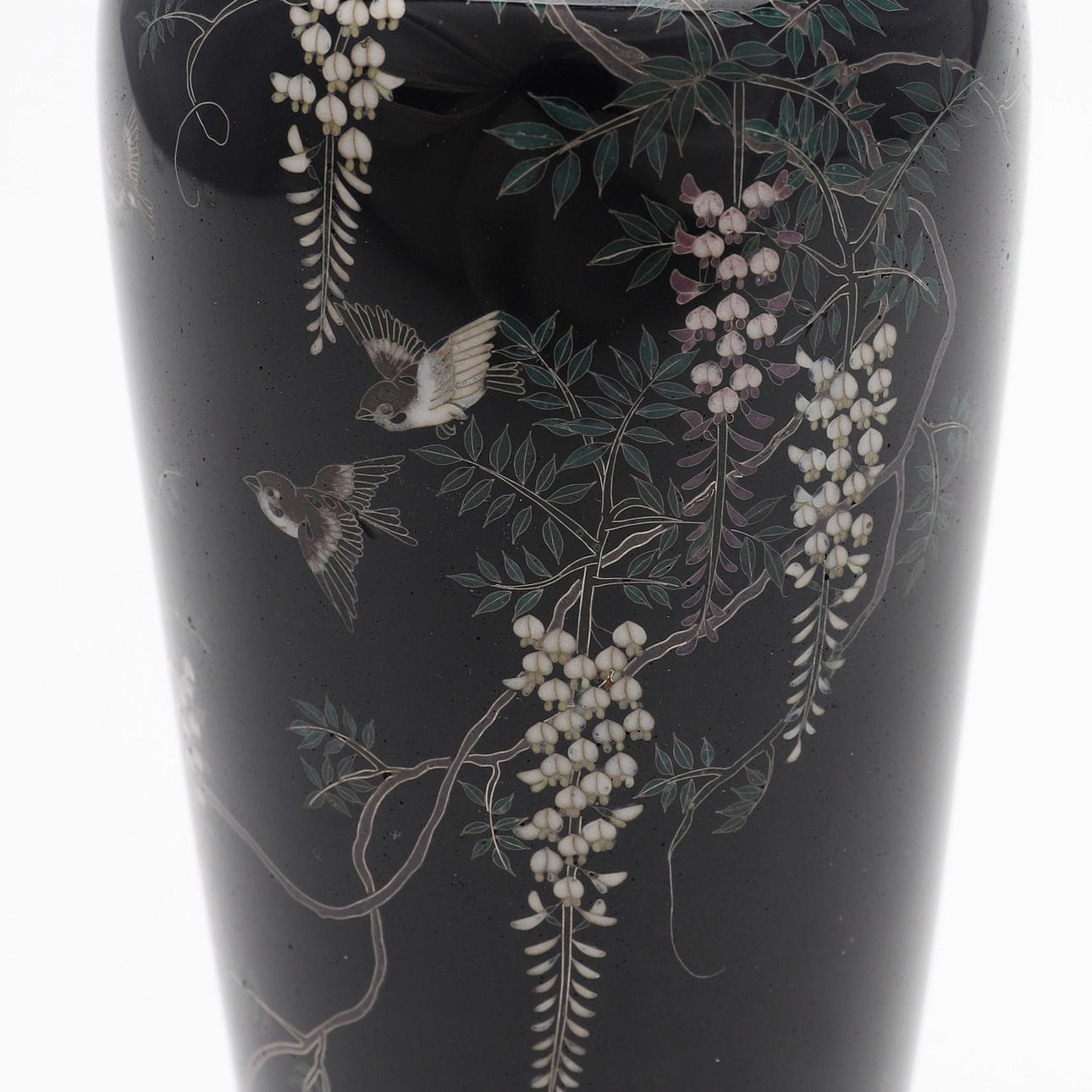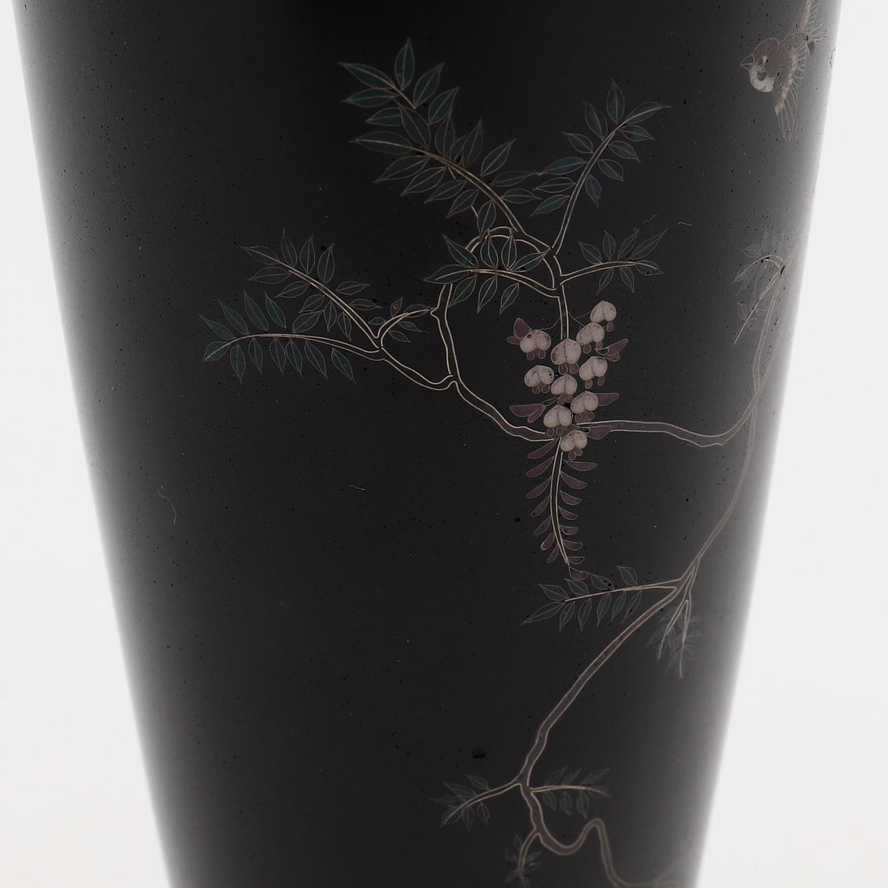 Mörkblå emalj och silvertråd med inläggningar visande växtlighet och fåglar i färger, Japan, höjd 18 cm.