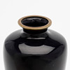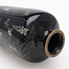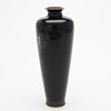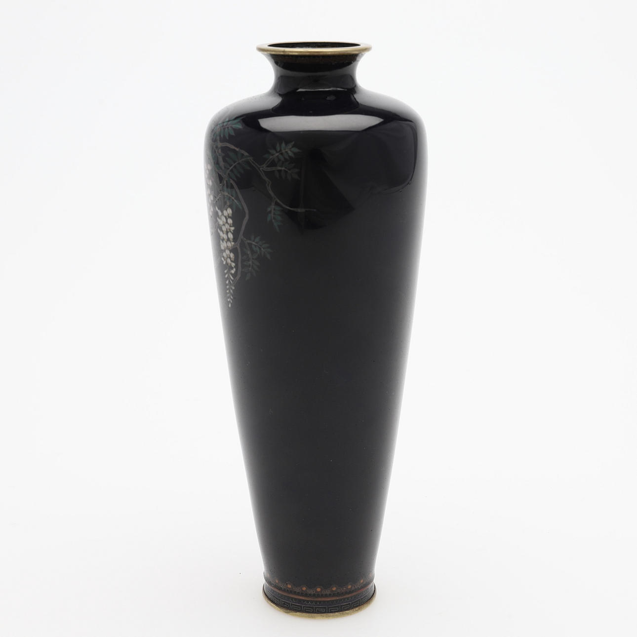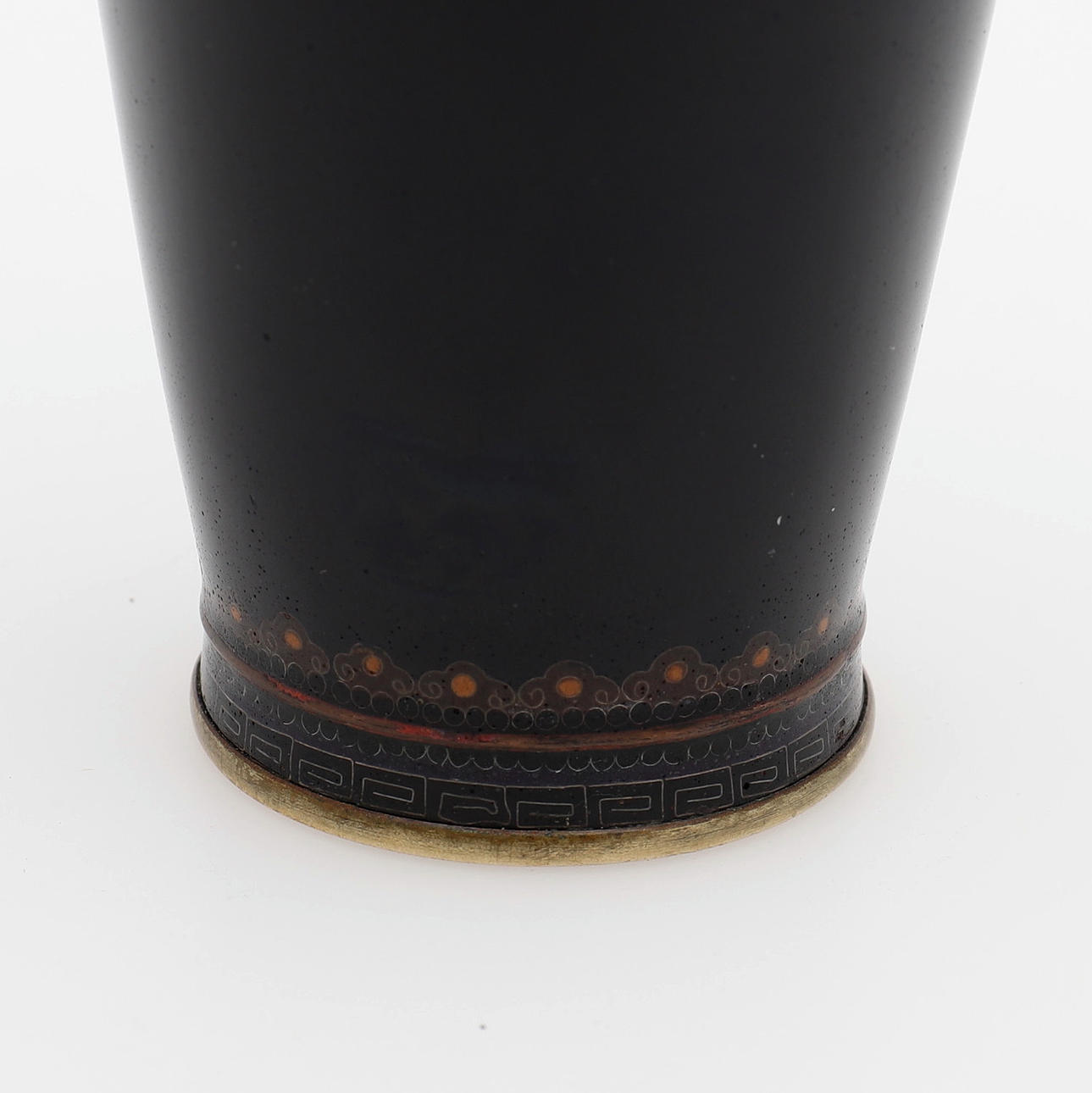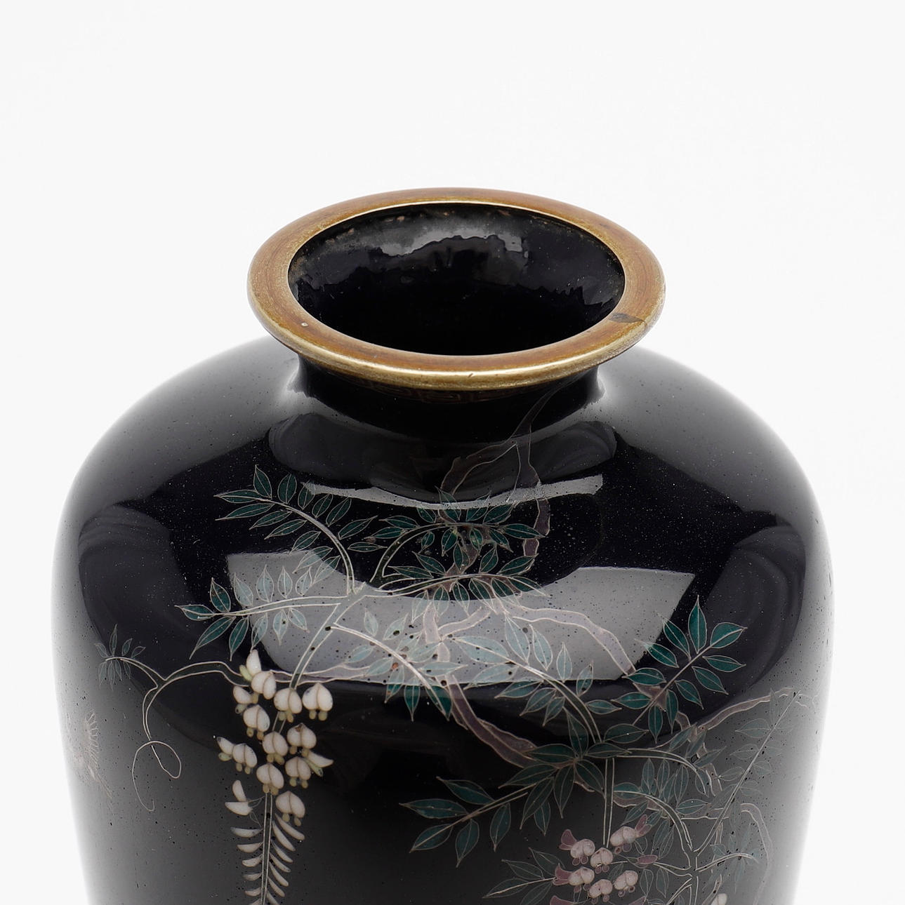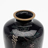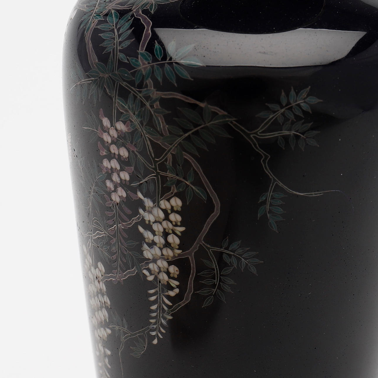 Mörkblå emalj och silvertråd med inläggningar visande växtlighet och fåglar i färger, Japan, höjd 18 cm.