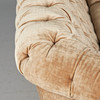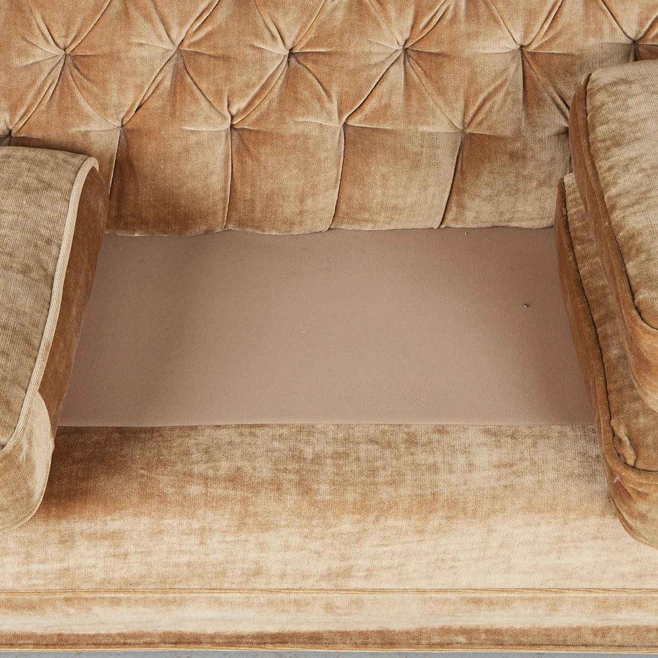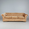 3-sits soffa/soffa, trä, velour. Tre-sits soffa med stoppad ram klädd i beige velour på fyra träfötter, vadderad rygg och armstöd, och lösa sittdynor, h.75cm, sitthöjd: 42cm, l.210cm, W.90cm.