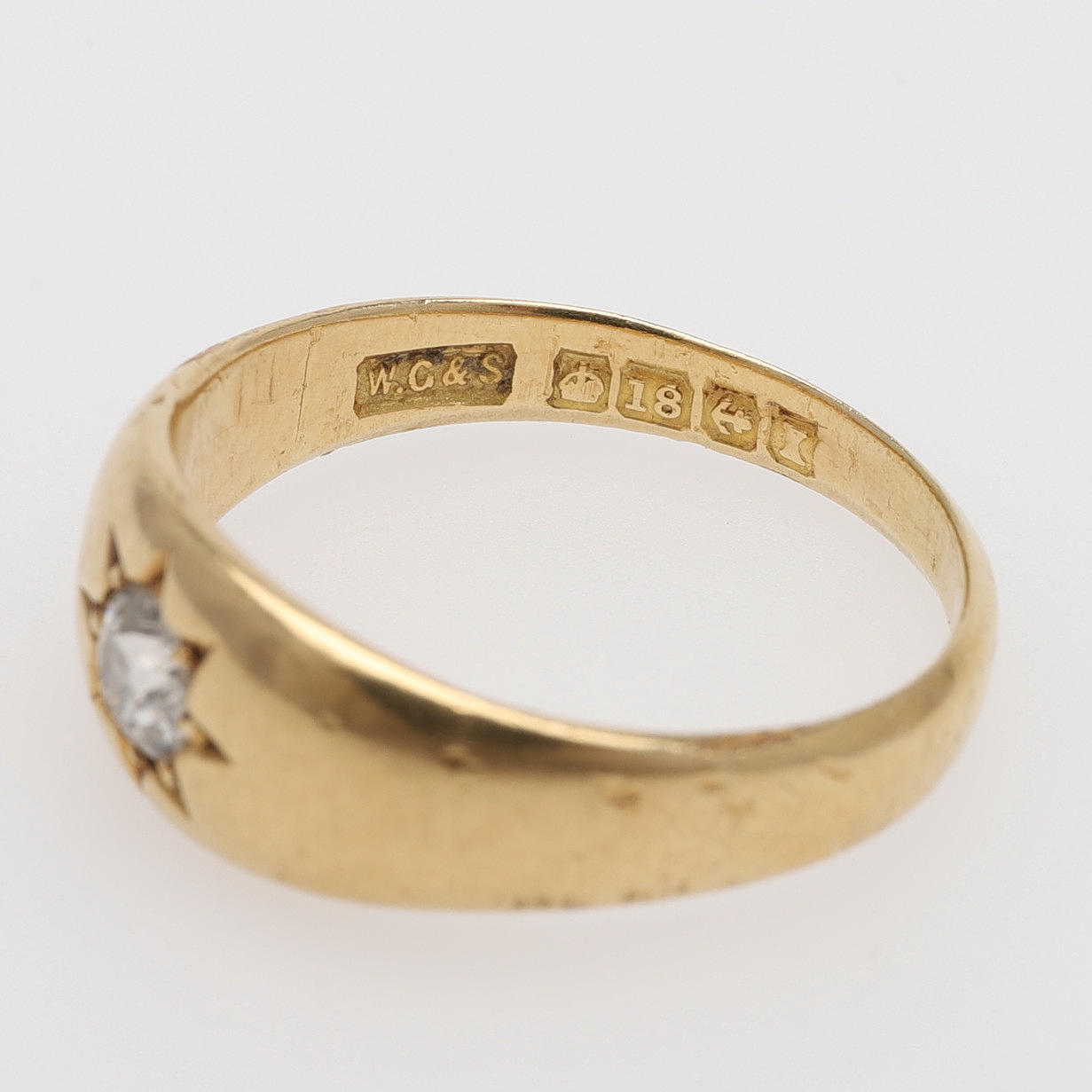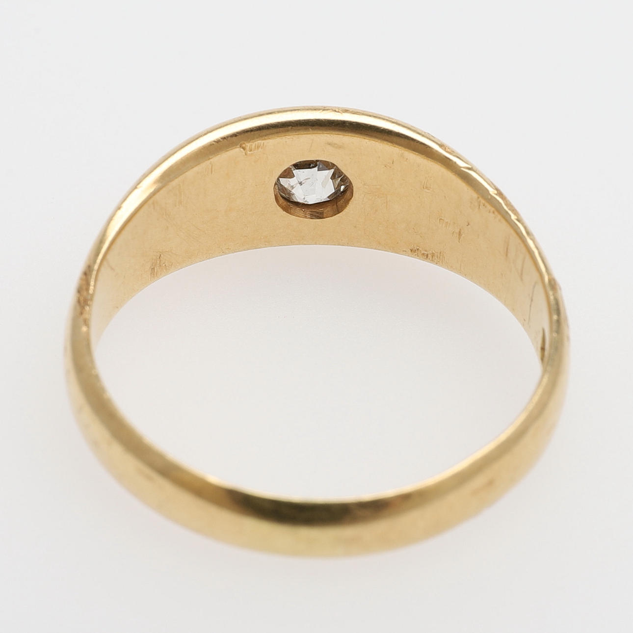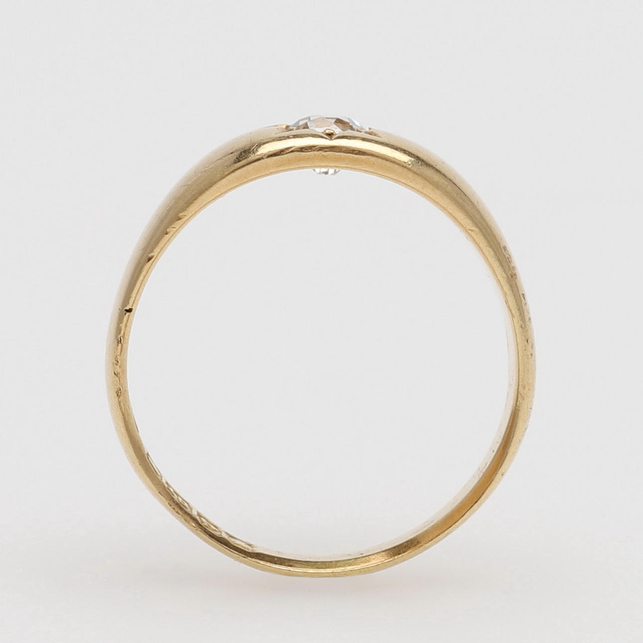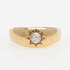 Gammalslipad diamant med avslipad kulett, ca 4 mm, fattad i ringskena av 18k guld med brittiska stämplar, storlek 19, vikt 5,9 gram.