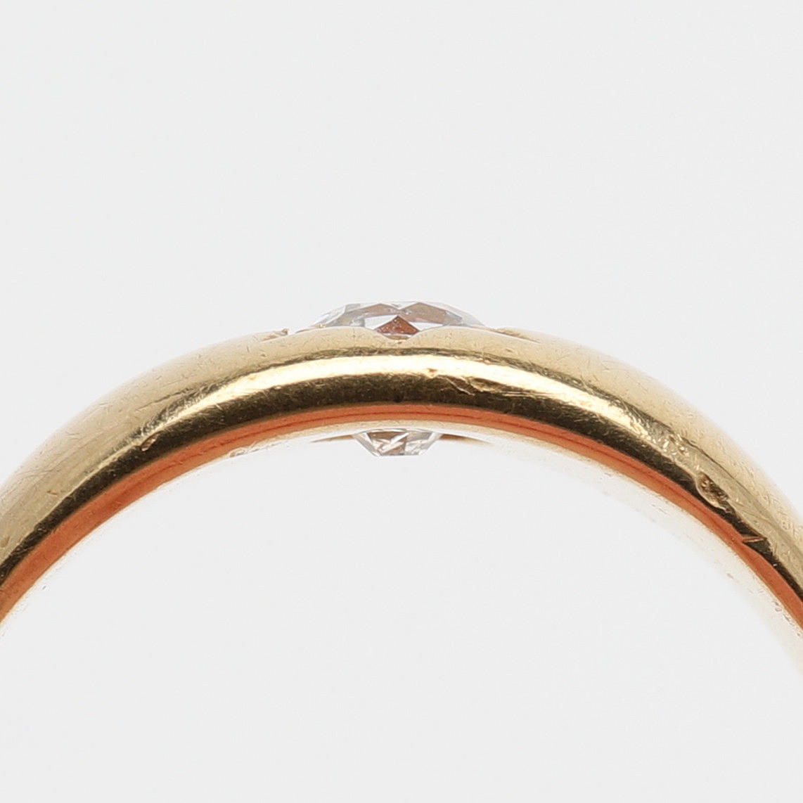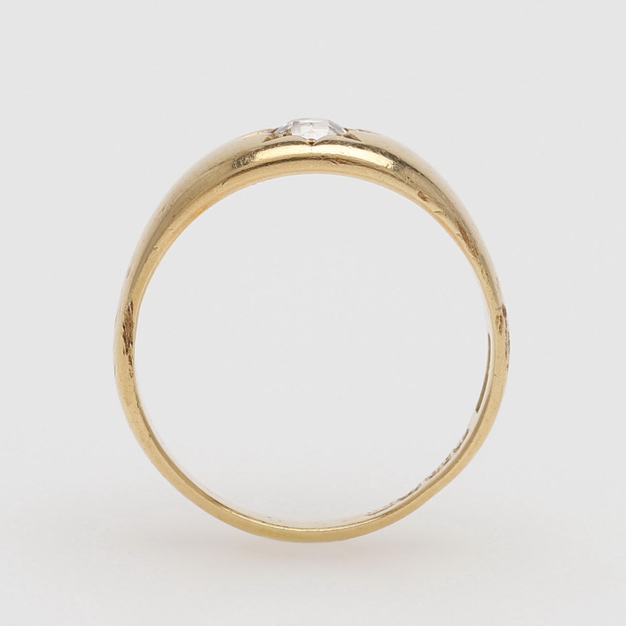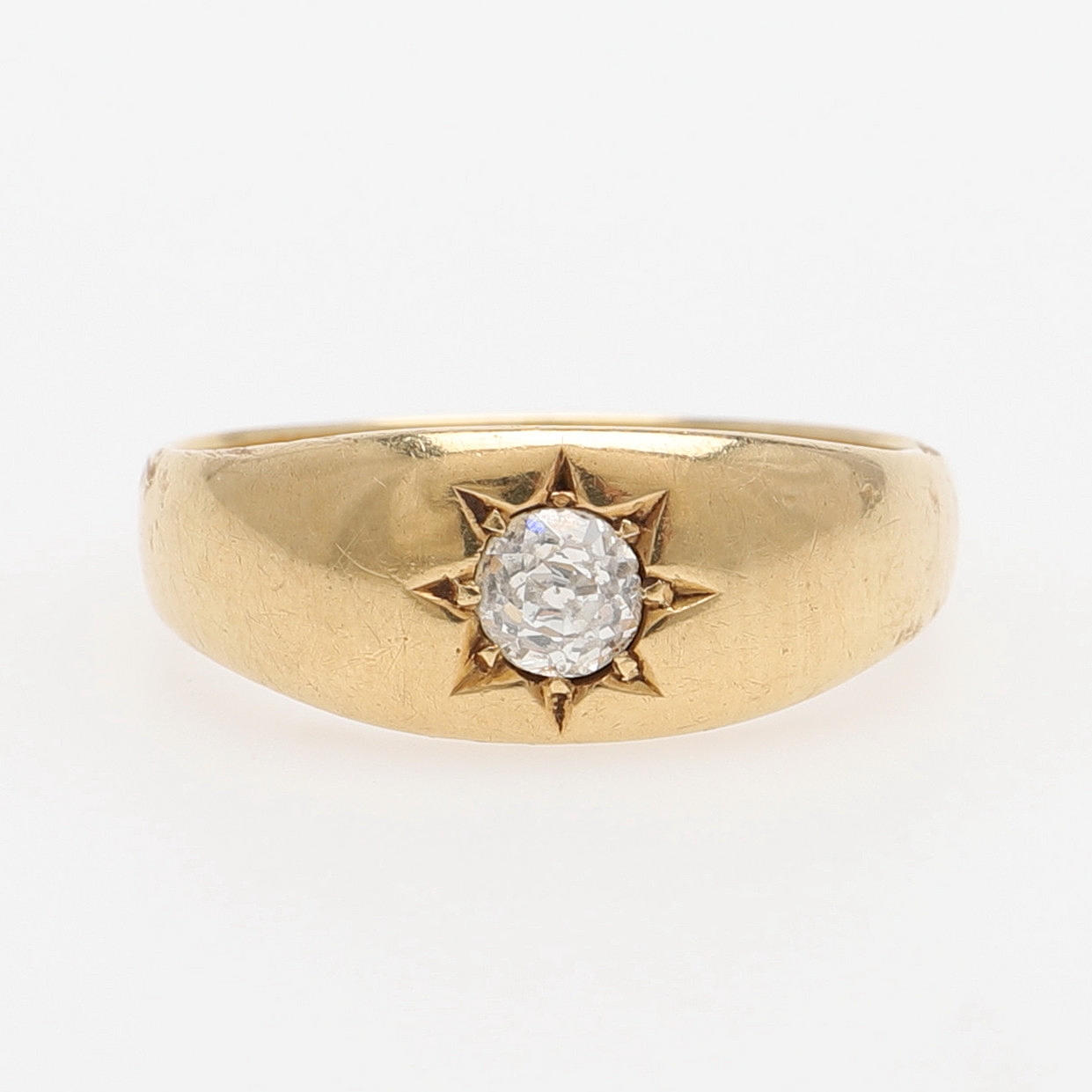 Gammalslipad diamant med avslipad kulett, ca 4 mm, fattad i ringskena av 18k guld med brittiska stämplar, storlek 19, vikt 5,9 gram.
