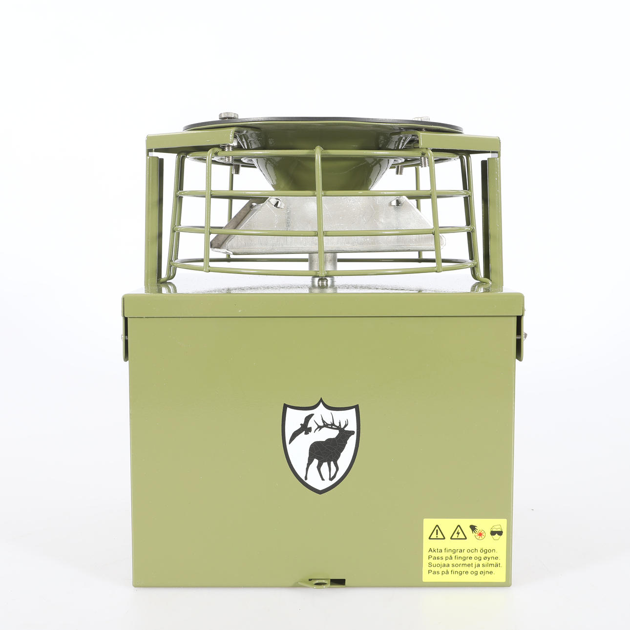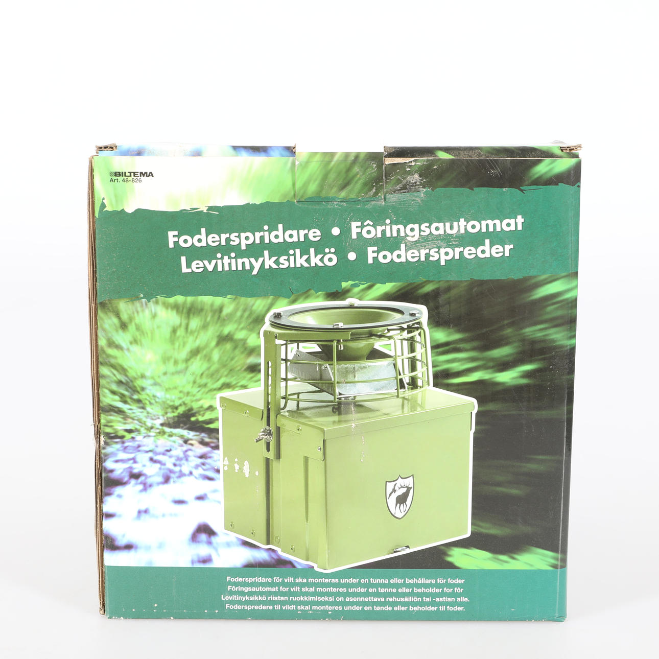 Foderspridare för vilt ska monteras under en tunna eller behållare för foder.
