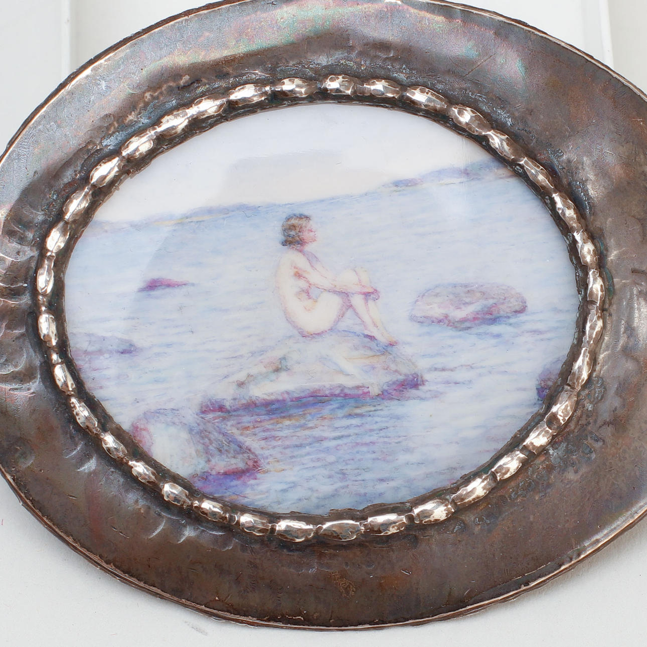 "Virvelmask", längd 13,5 cm. Brosch med miniatyrmålning, längd 7,5 cm.