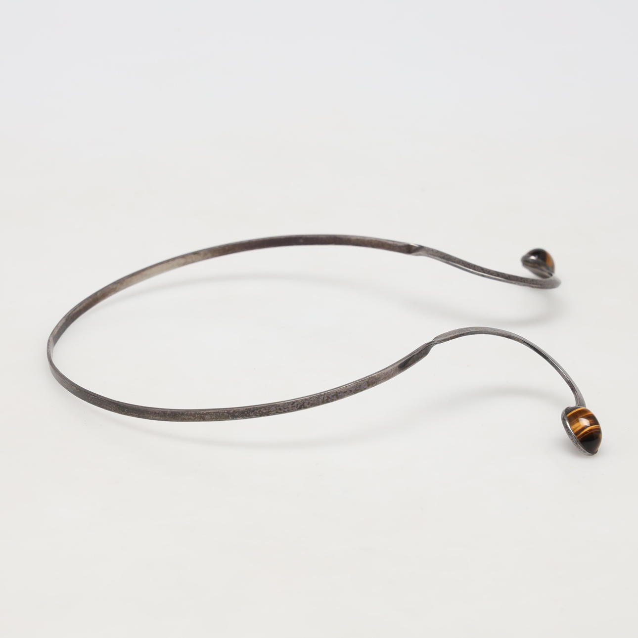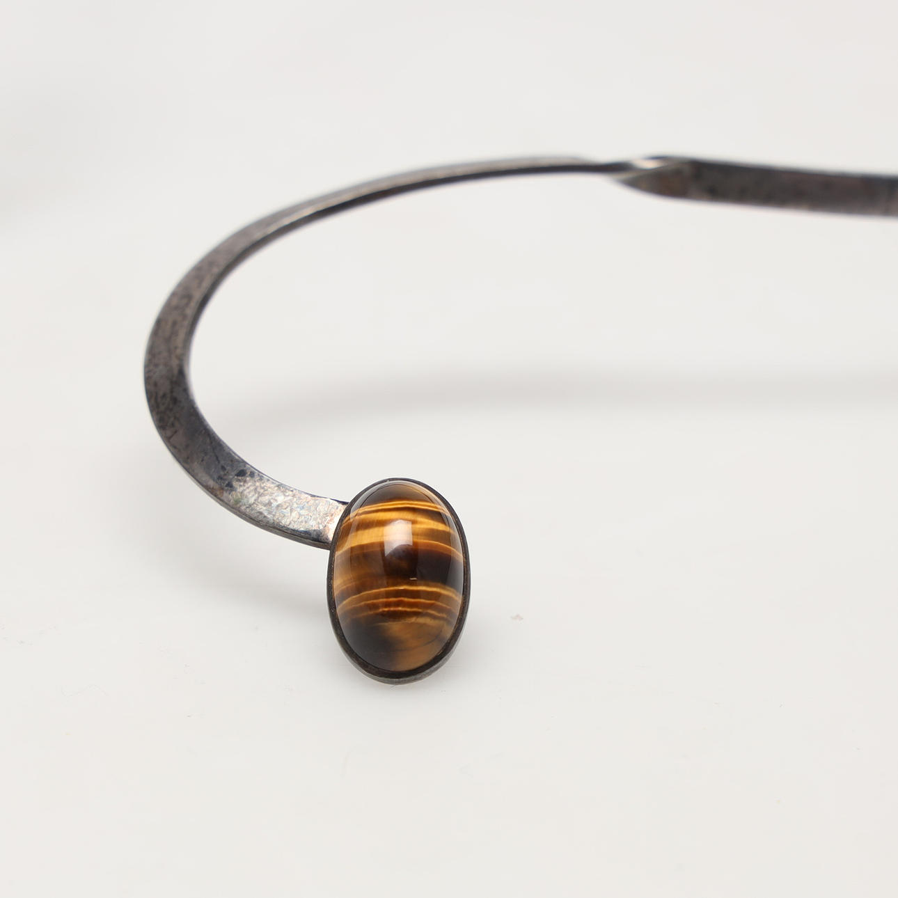 Med cabochonslipade tigeröga. H ca 18 cm. B ca 12,5 cm. Vikt ca 37 gram.