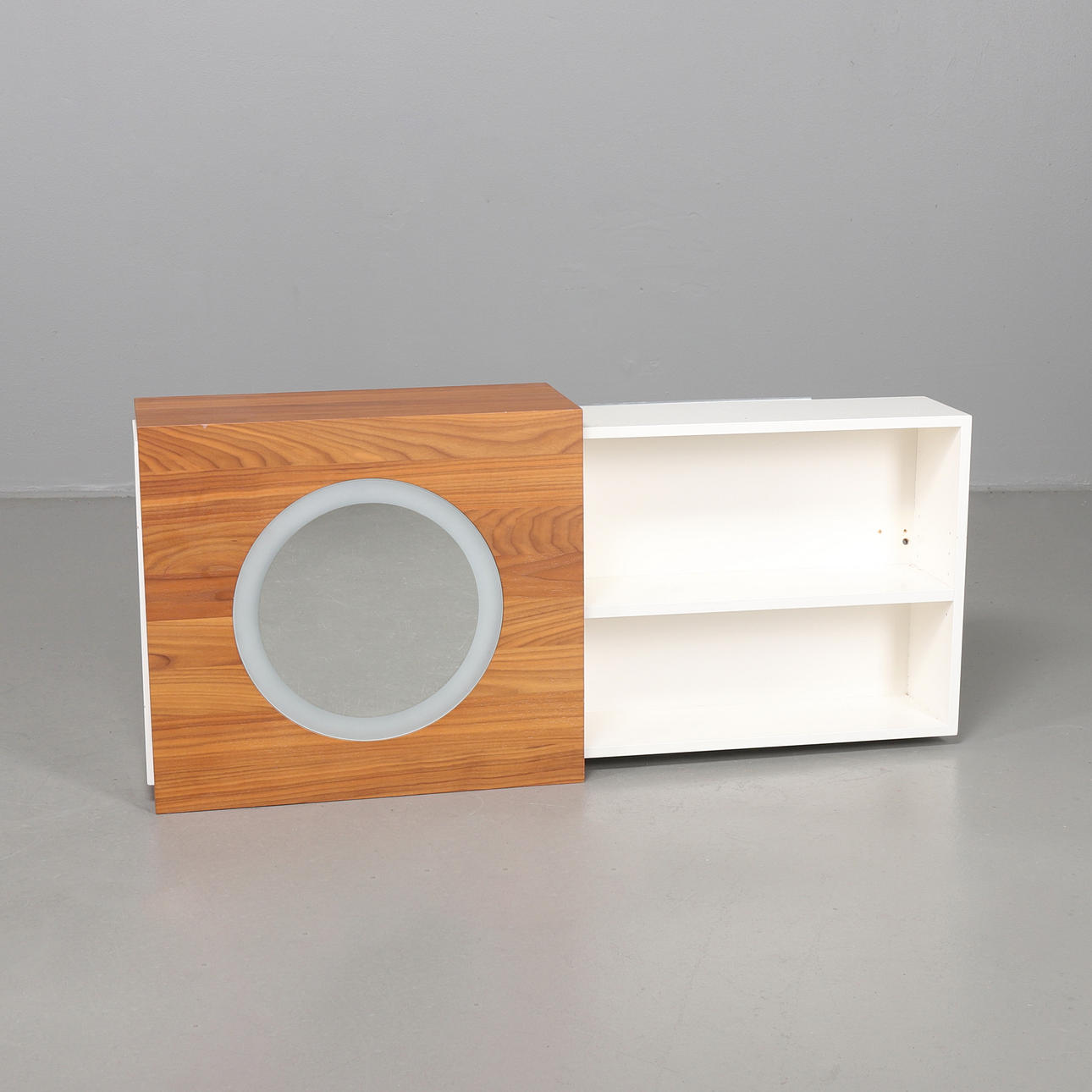 Spegelförsedd skjutdörr, inredning med ett flyttbart hyllplan.