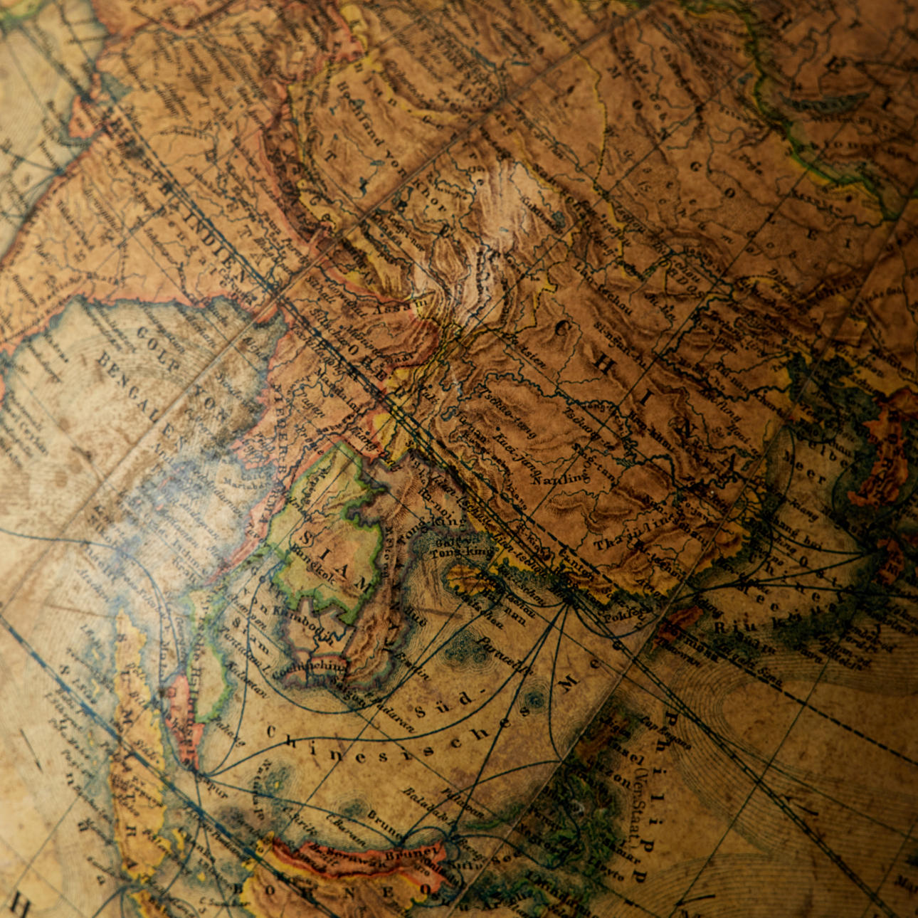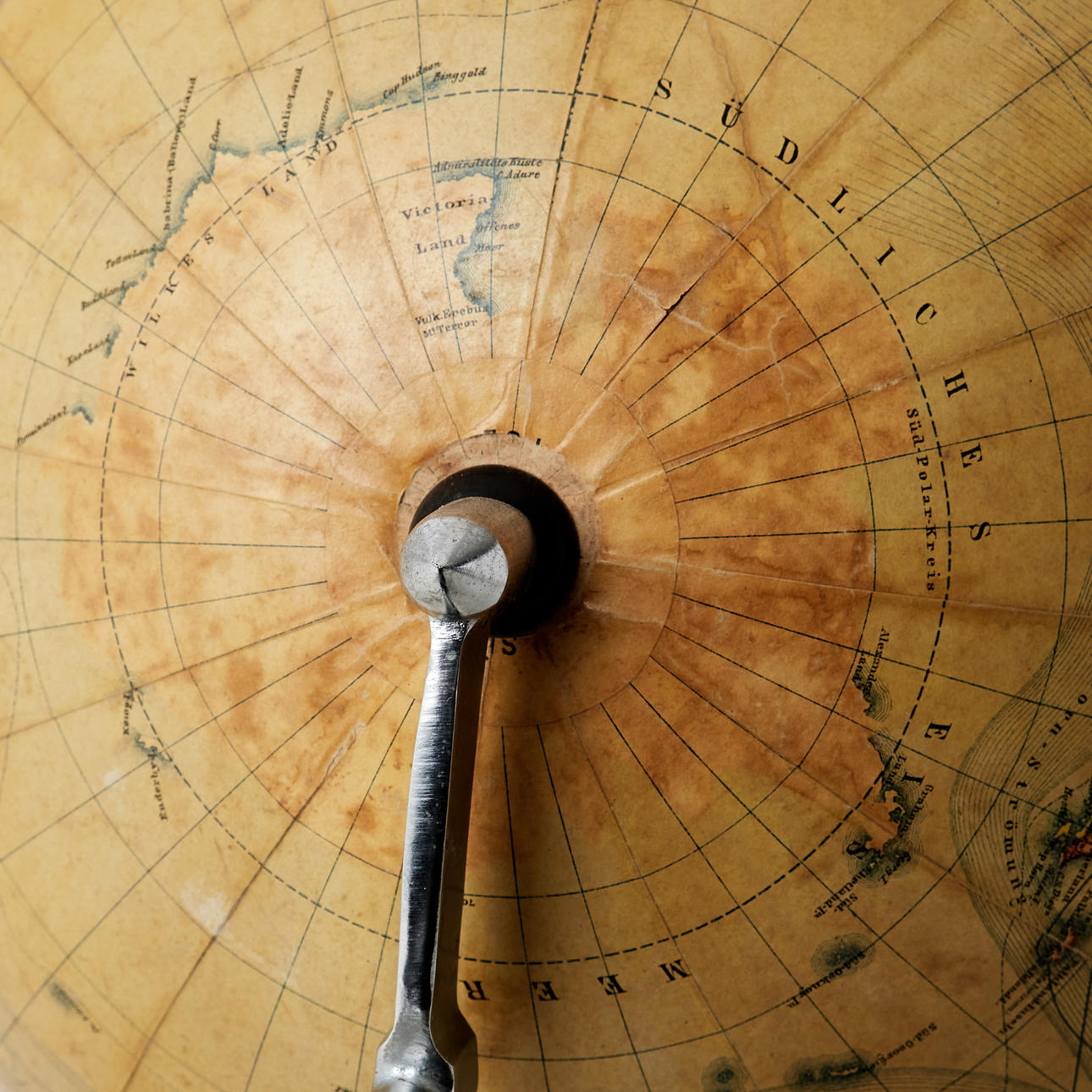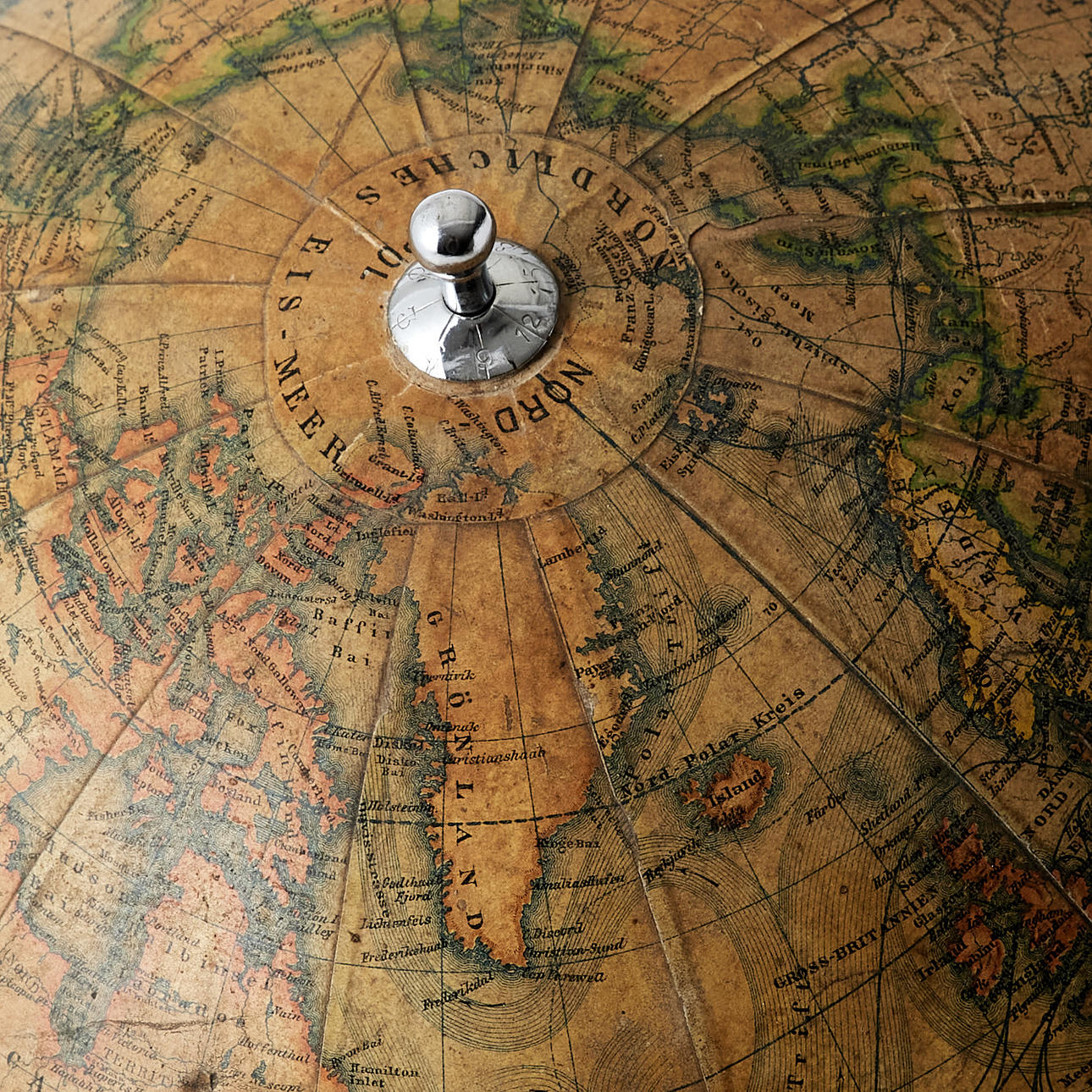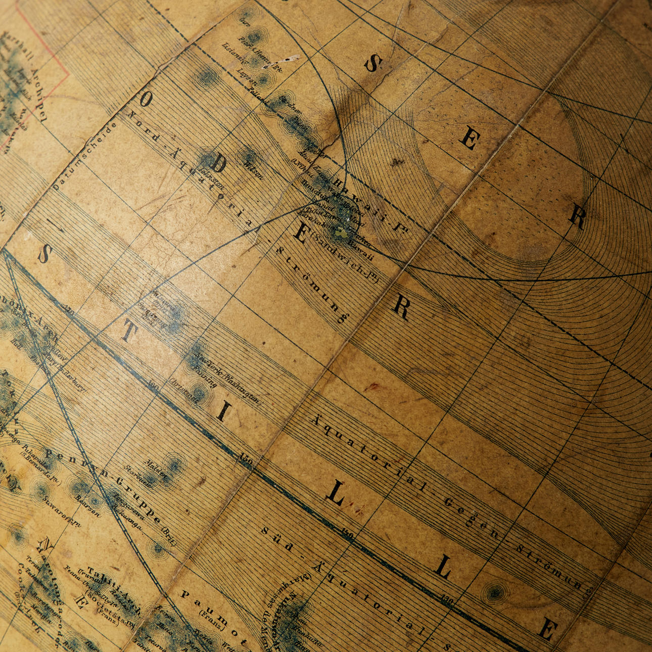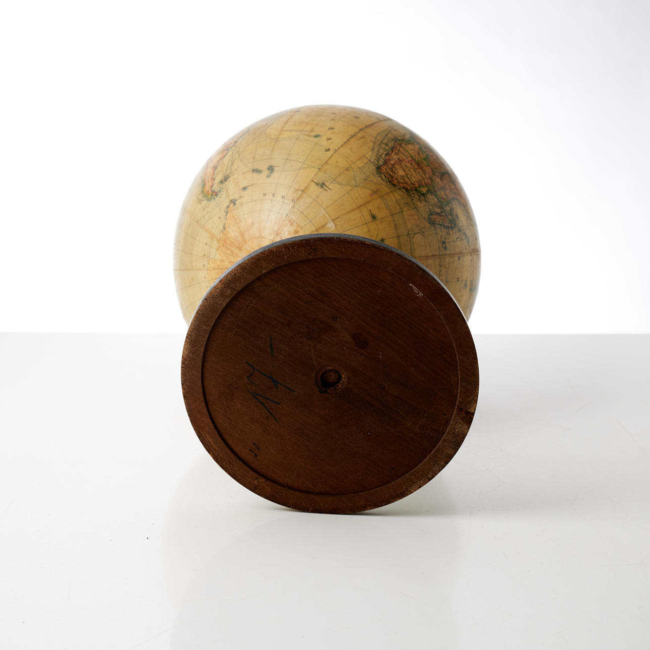 12 chromolithographed globe gores mounted on cardboard sphere.