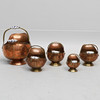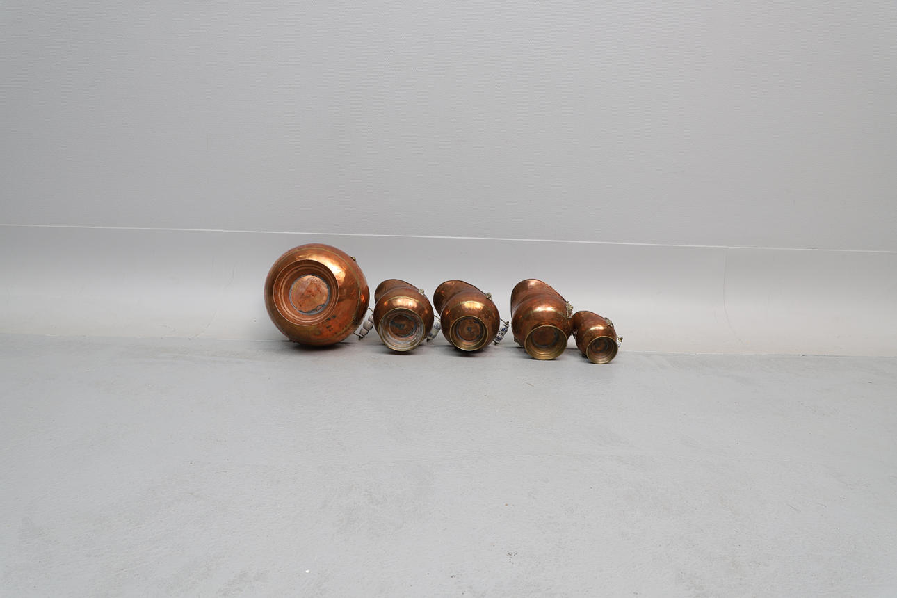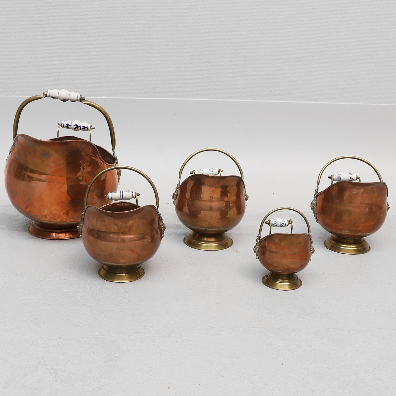 Glaserade handtag och dekor av lejonhuvud. Höjd från ca: 16 till 32 cm. Diameter från ca: 12 till 31 cm.
