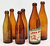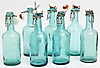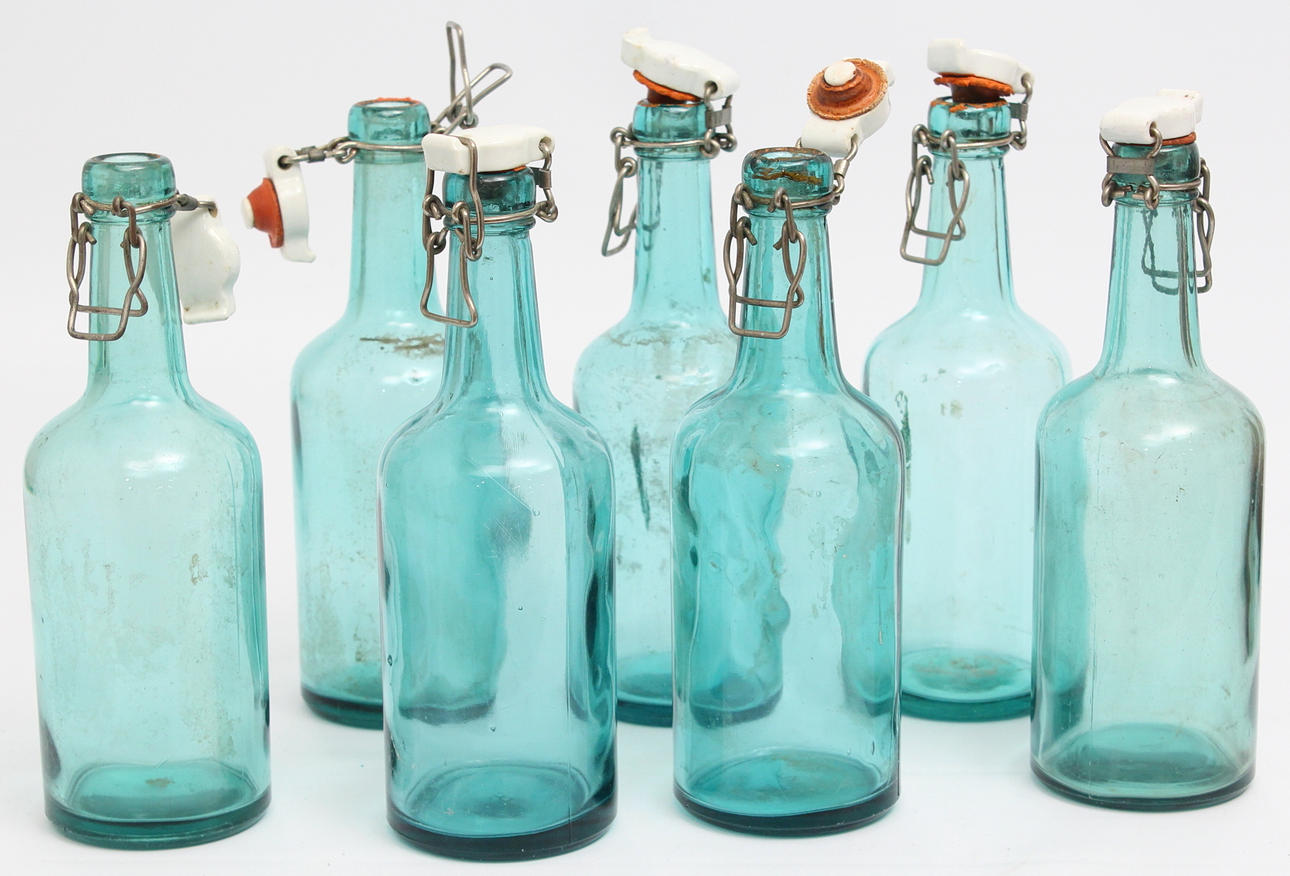 Träback med 7 st. flaskor med kork, 6 st. pilsnerflaskor, Årsnäs glasbruk.