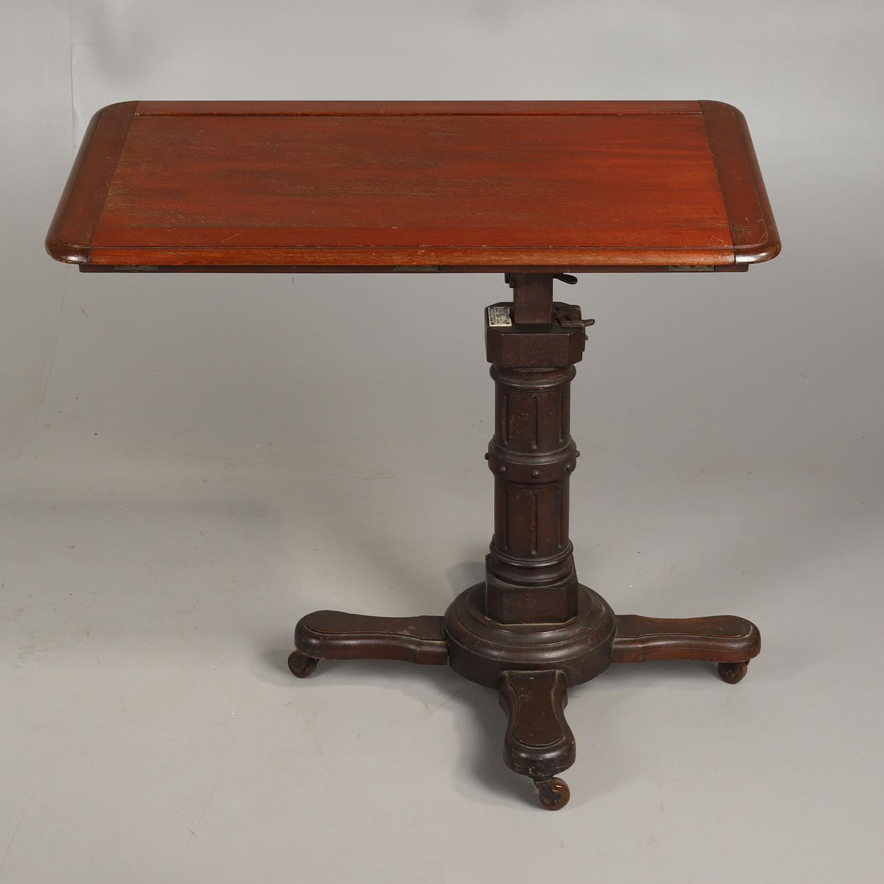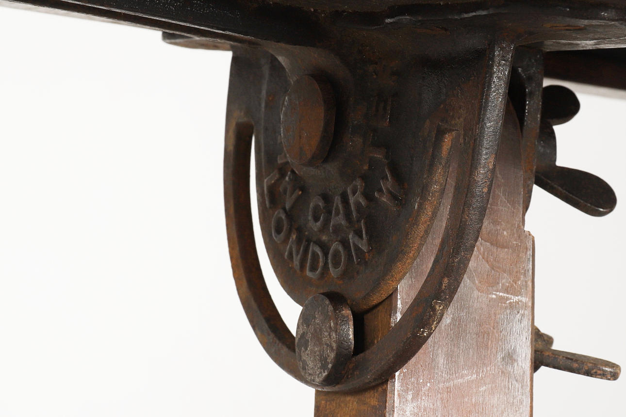 Den rundade ovala toppen med fällbara gångjärn sidostöd på gjutjärn justerbart fäste märkt John Carter London och numrerad 11197, på justerbart spärrstöd på quatrefoil bas och bruna keramiska hjul,