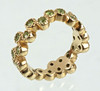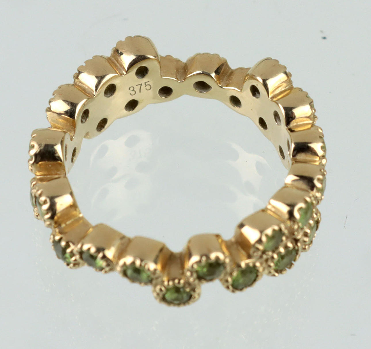 Stämplad 375 gult guld (9 karat), ca. 6.15 gram, modern ring gjord i en enkel och dubbel rad arrangemang, med 28 demantoids (Madagaskar) på ca. 2,2 mm diameter plus 1,54 ct. Briljantslipad, individuellt inramad, RG 54, innerdiameter 17,2 mm, med smyckesintyg.