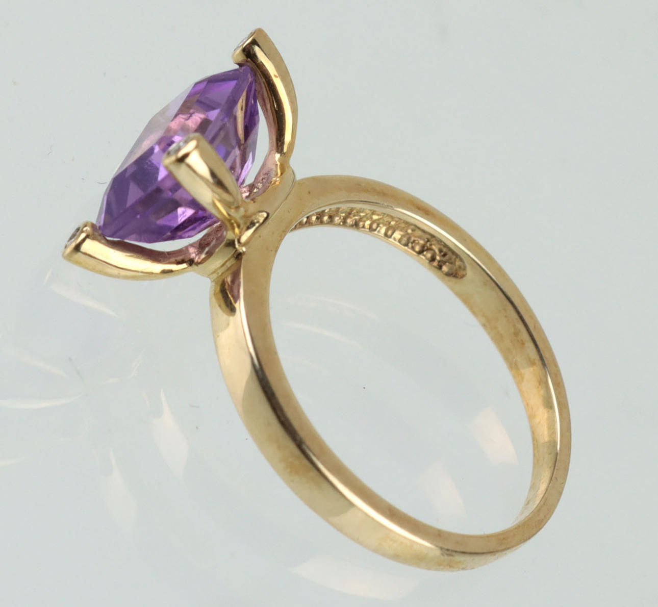 Stämplad 375 gult guld (9 karat), ca. 3.65 gram, elegant damring med upphöjt ringhuvud, med ametrin (Bolivia) på ca. 10 x 8 mm ca. 2,63 ct. Åttkantslipade stift och 4 briljantslipade diamanter ca 1,3 mm diameter ca. 0,046 ct. (Afrika), RG 54/55, innerdiameter 17,3 mm, med smyckecertifikat.