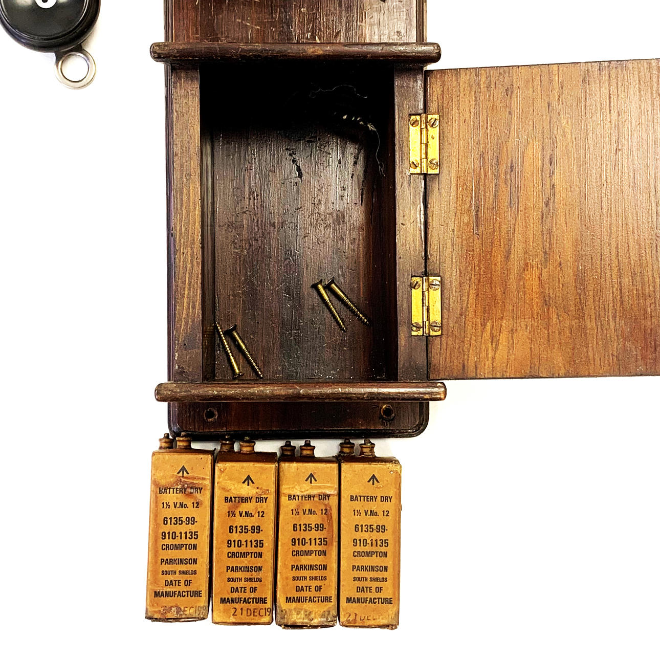 En antik väggtelefon med fyra originalbatterier, L. 54cm.