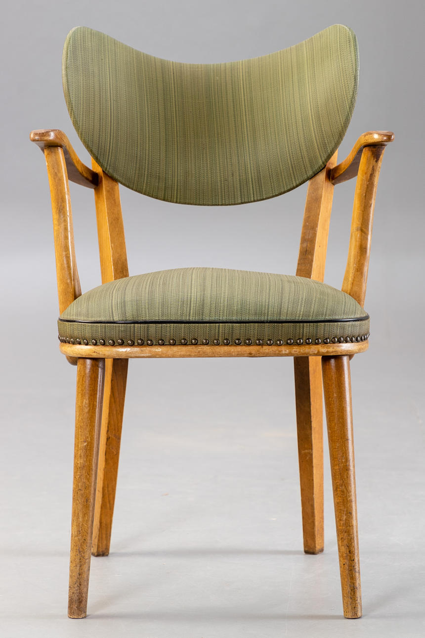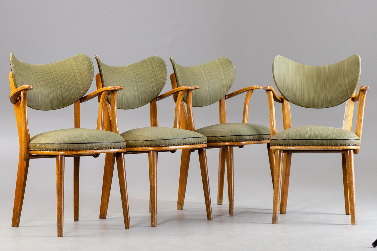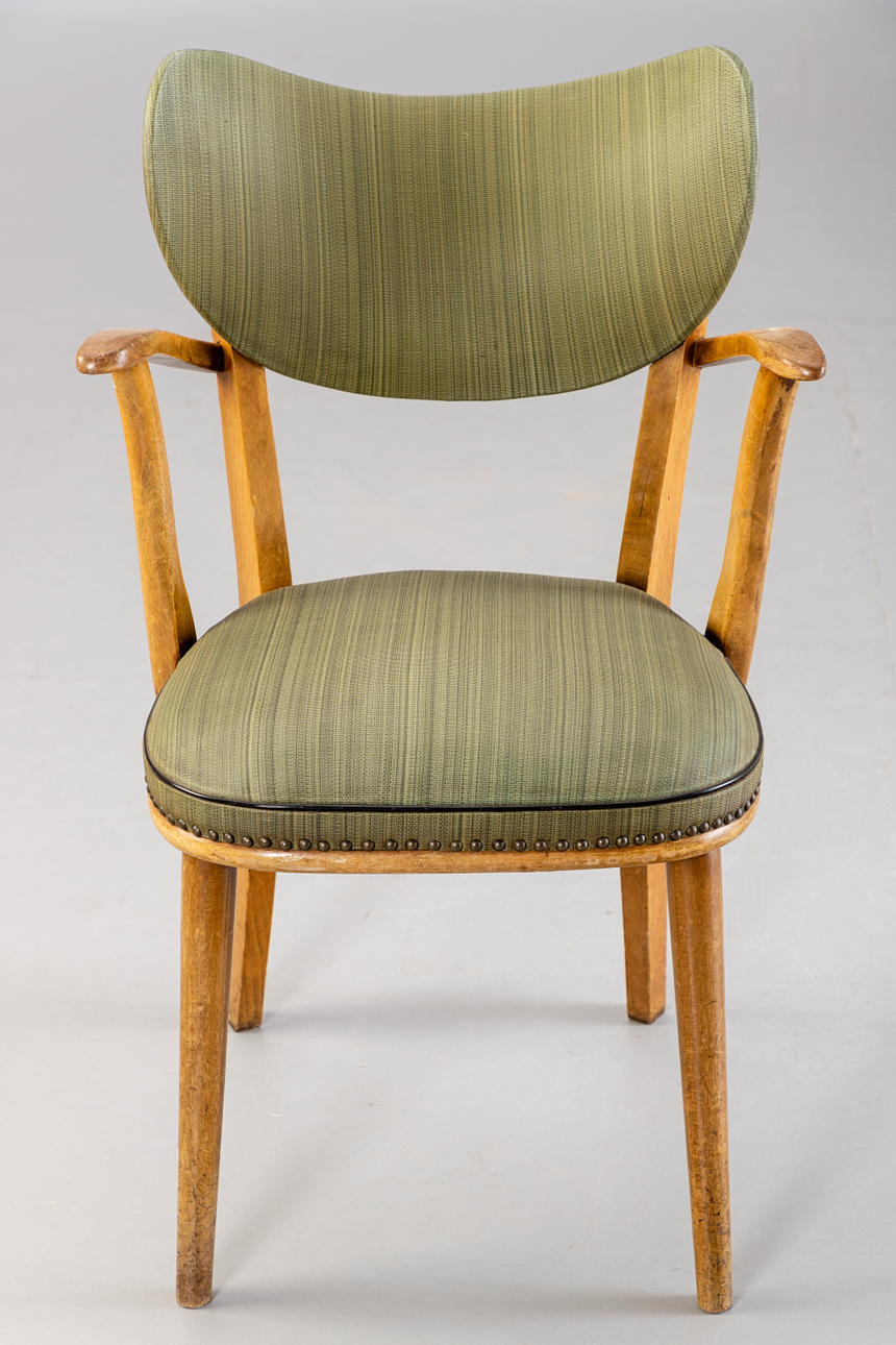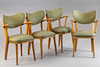 4 fåtöljer från 1950-talet, träram. Ryggstöd och sits täckt med grön randig vinyl och klädselspikar fästa. Vadderad innerfjäder