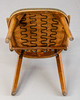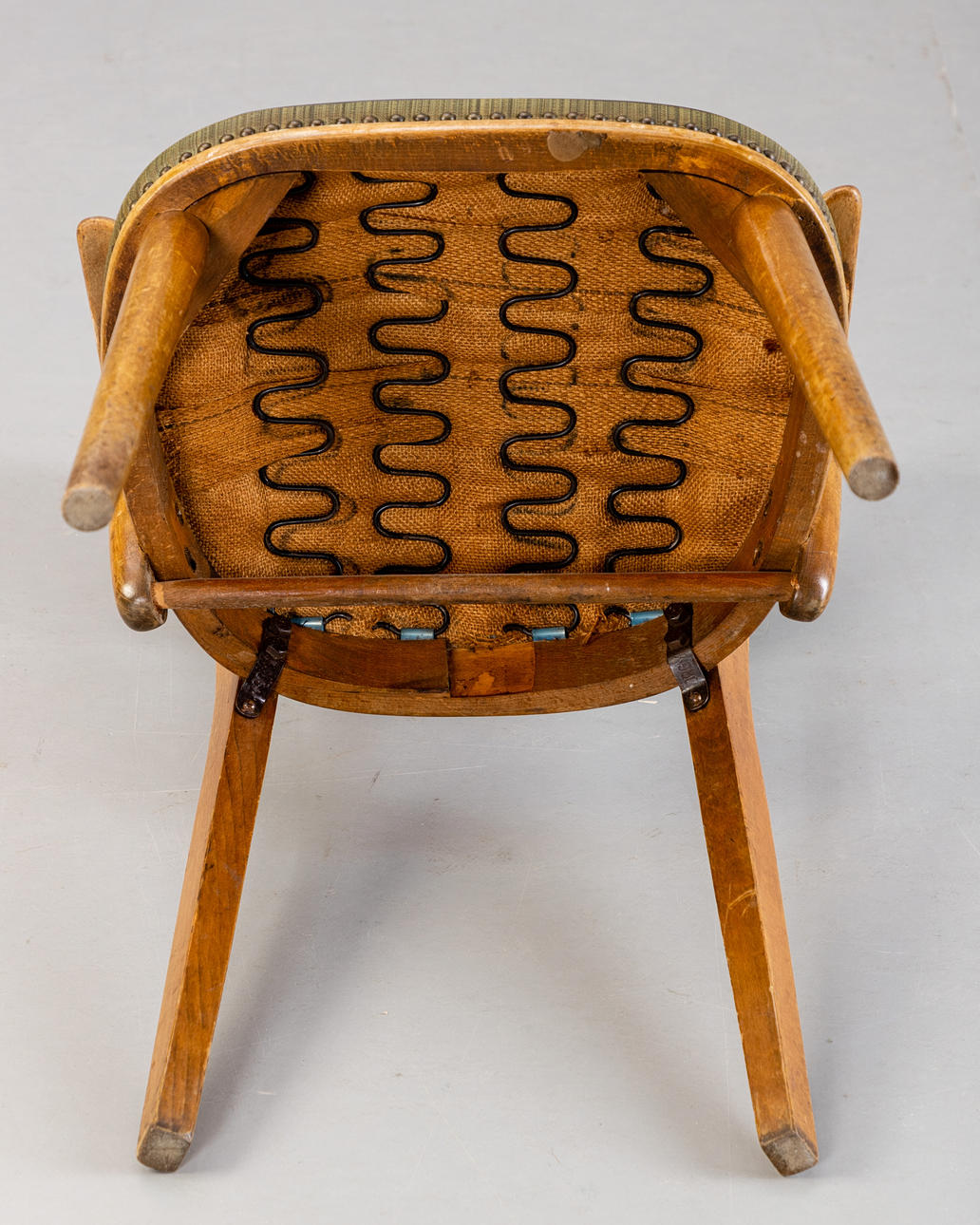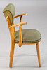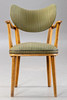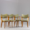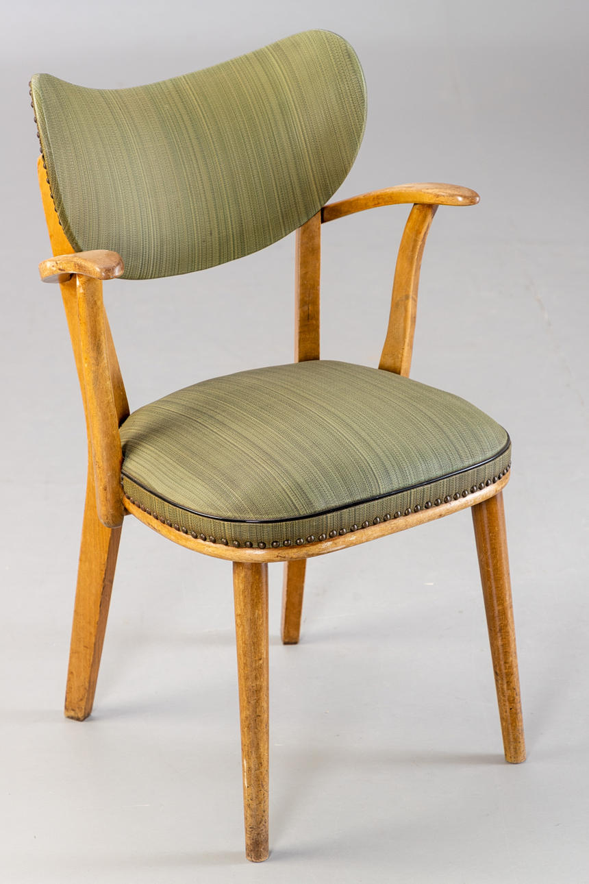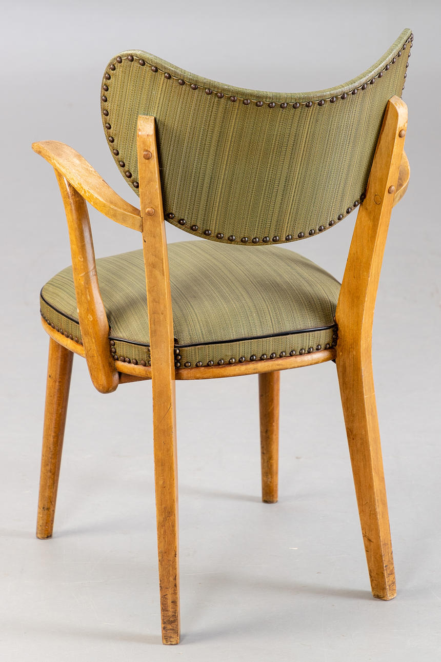 4 fåtöljer från 1950-talet, träram. Ryggstöd och sits täckt med grön randig vinyl och klädselspikar fästa. Vadderad innerfjäder