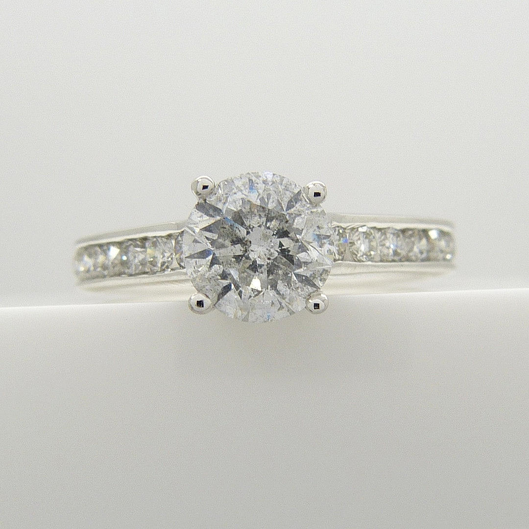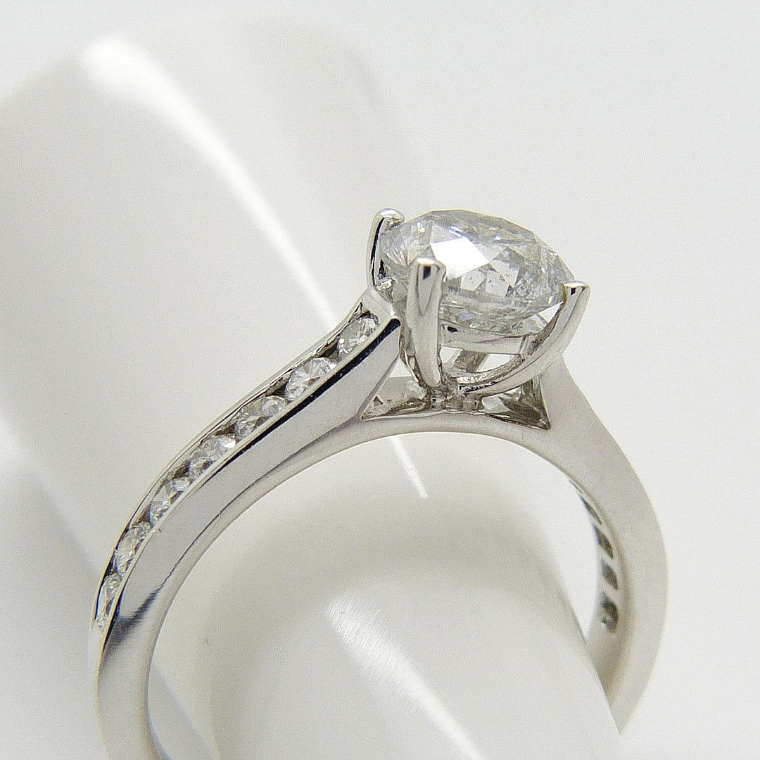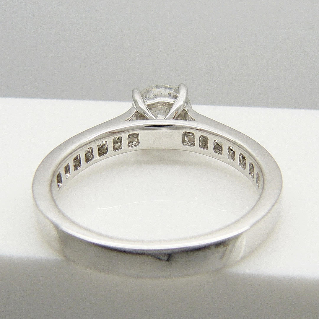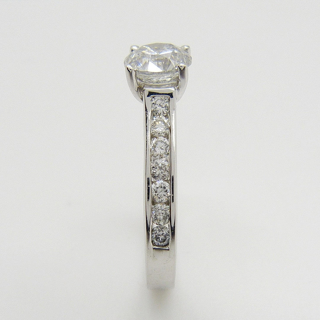 ENSTENSRING med certifierad diamant med en central rund briljantslipad diamant och 14 kanal-set diamanter nerför axlarna.