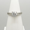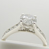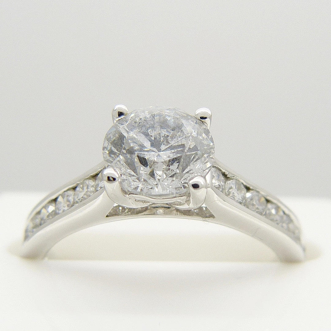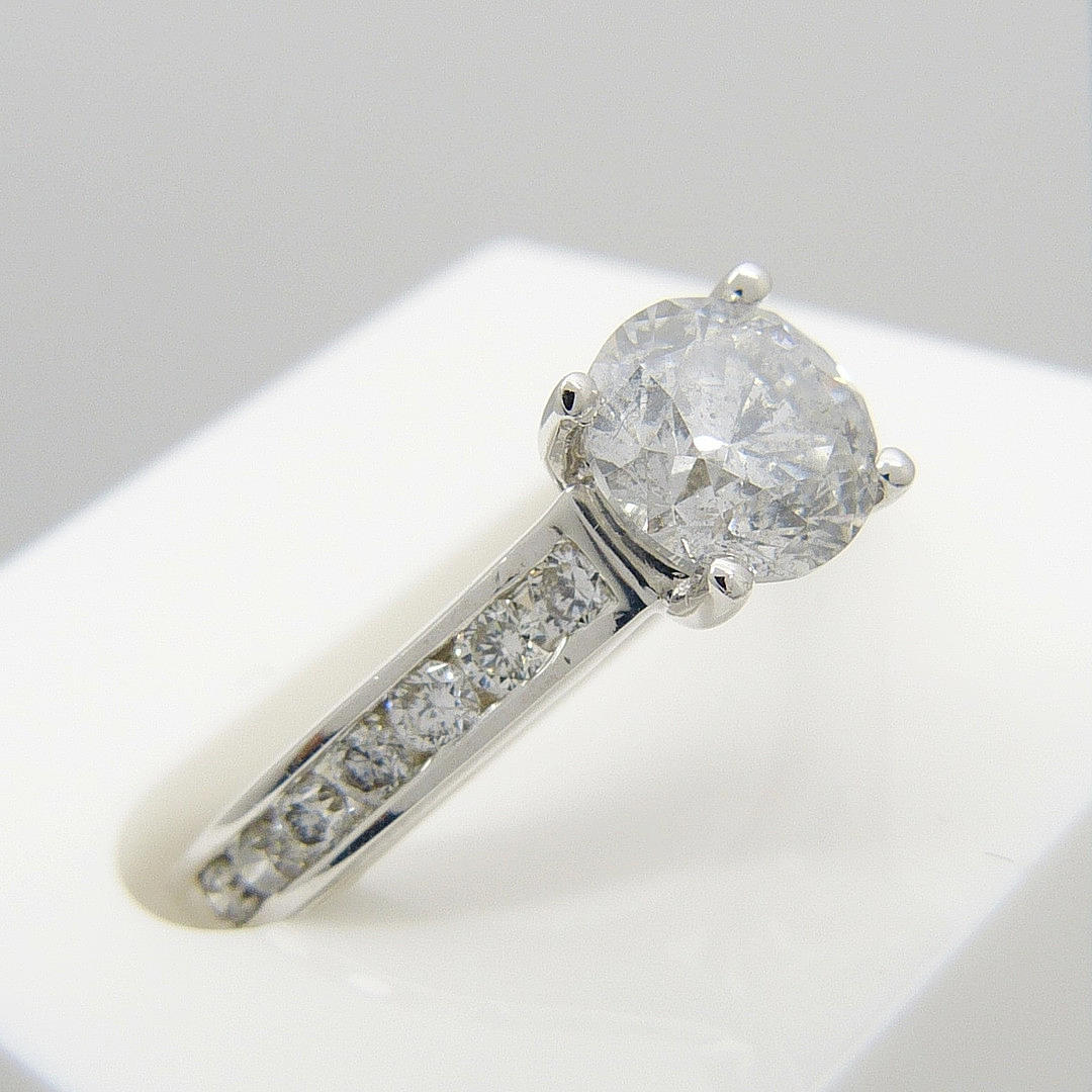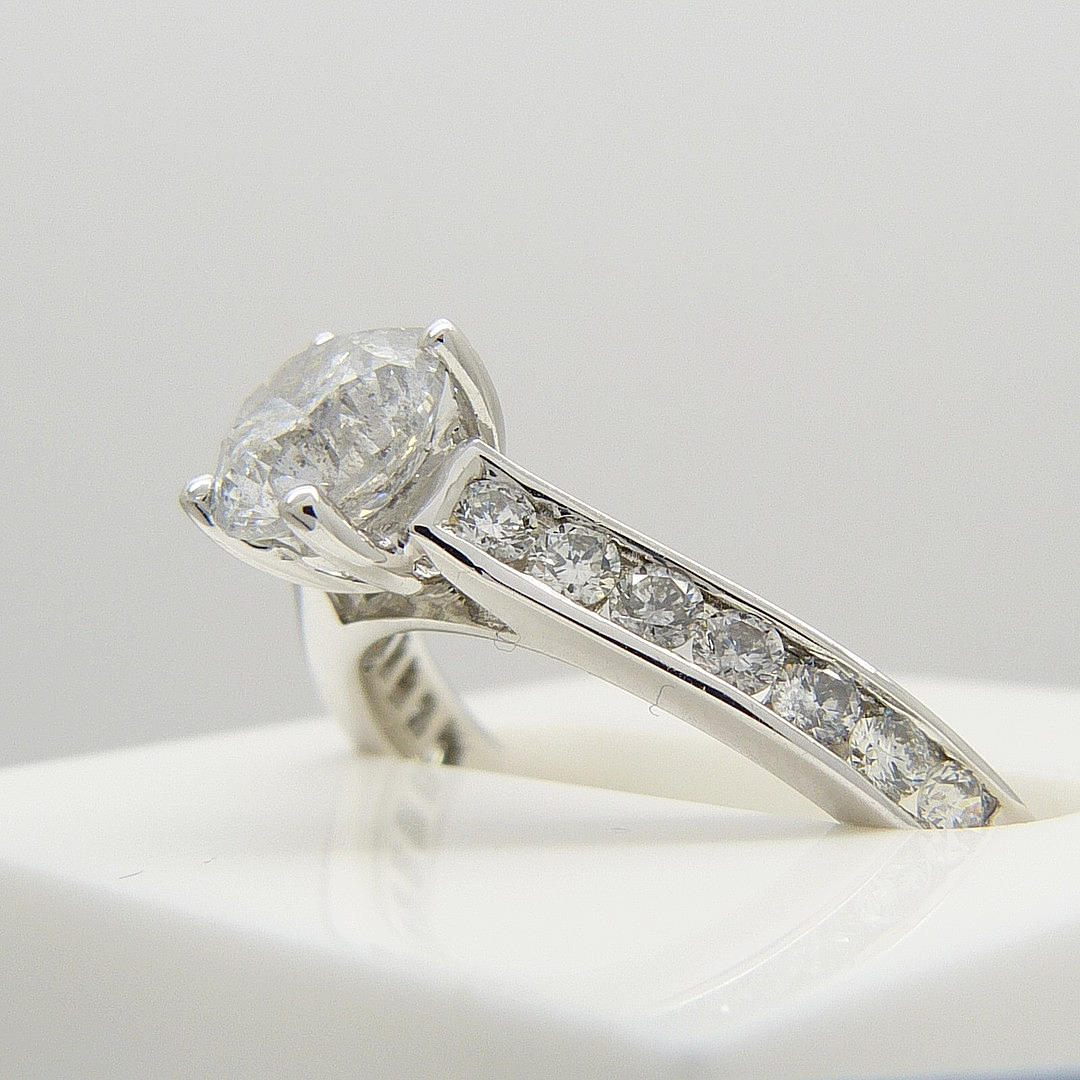 ENSTENSRING med certifierad diamant med en central rund briljantslipad diamant och 14 kanal-set diamanter nerför axlarna.