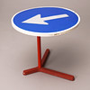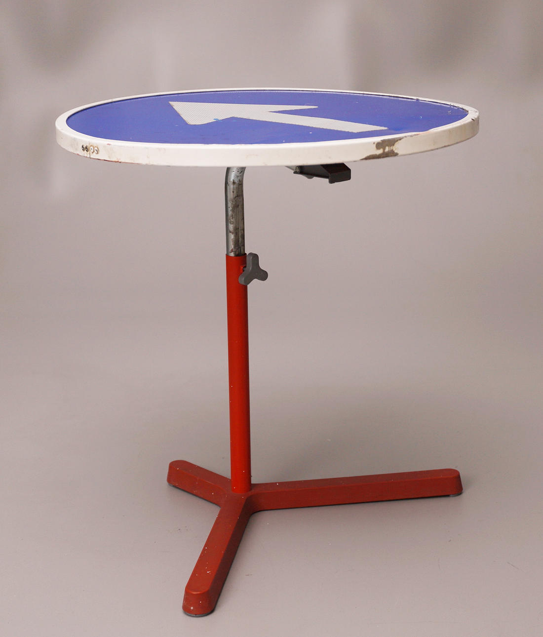 Trafikskylt med fot i röd patinerad metall. Tre ben.