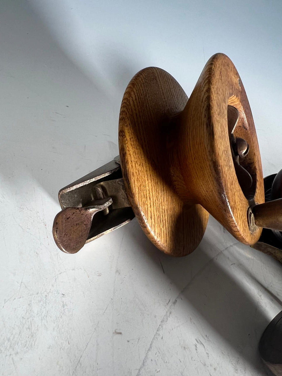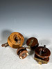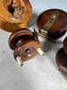 En samling antika fiskerullar. trä, mässing (4).