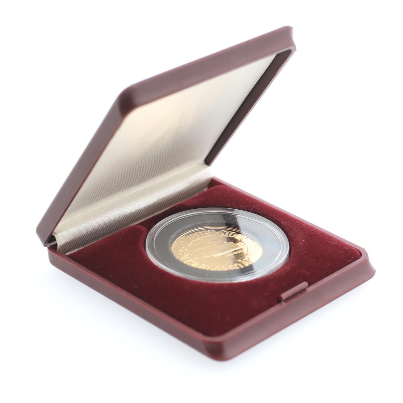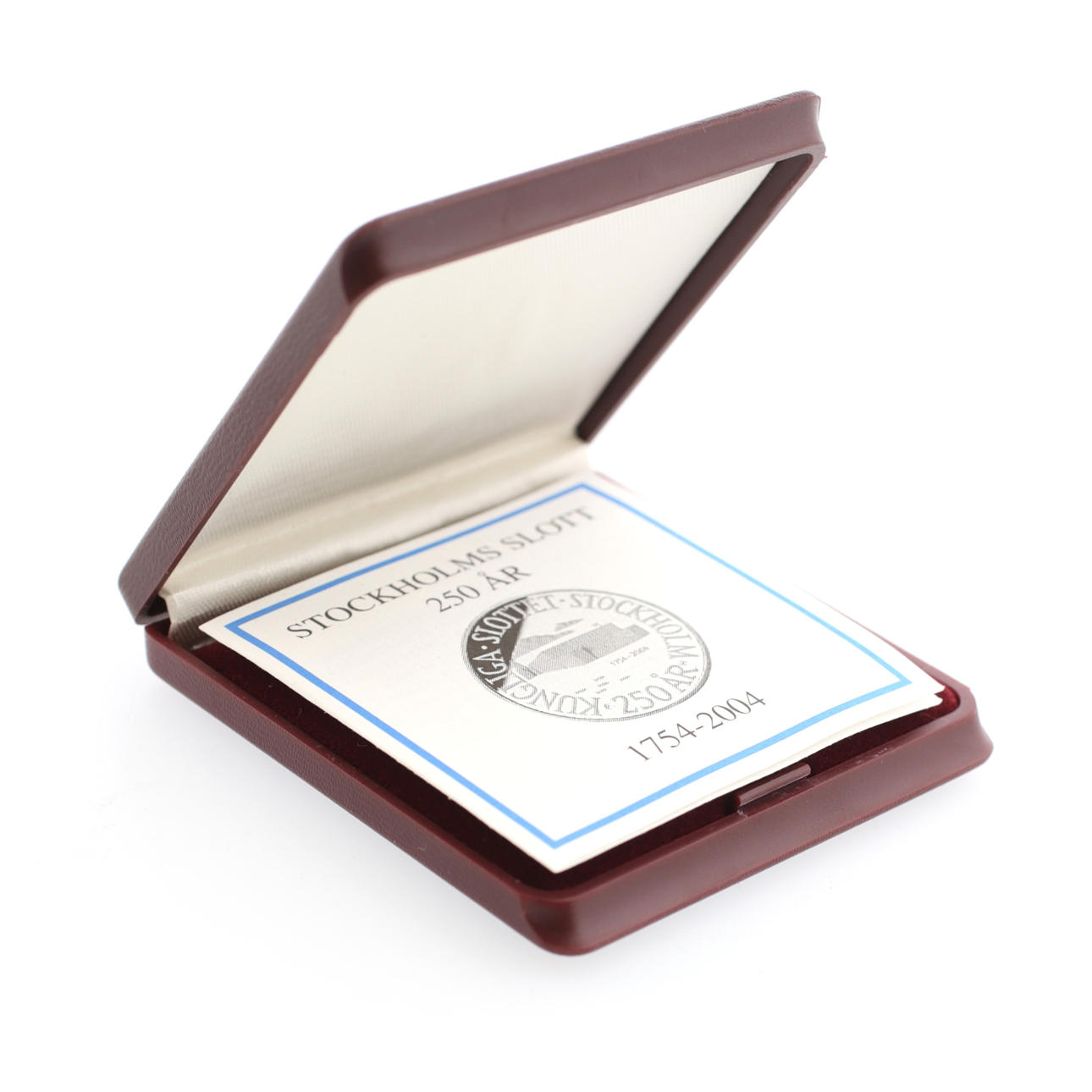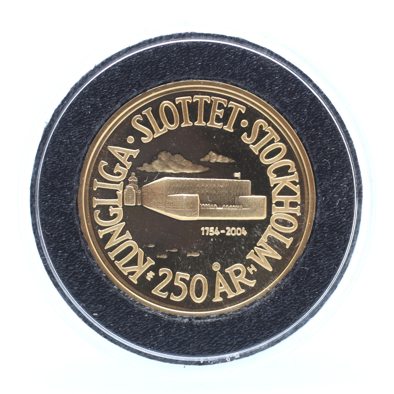 21,6k guld, 900/1000, valör 2000 kr, diameter 26 mm, vikt 12 gram, med etui.