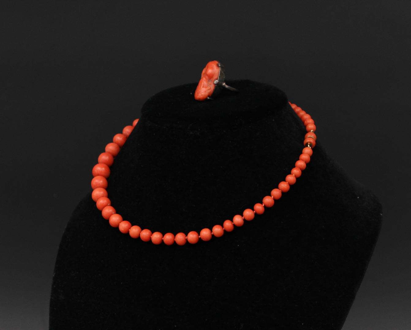 22916. HALSBAND samt RING, korall.
