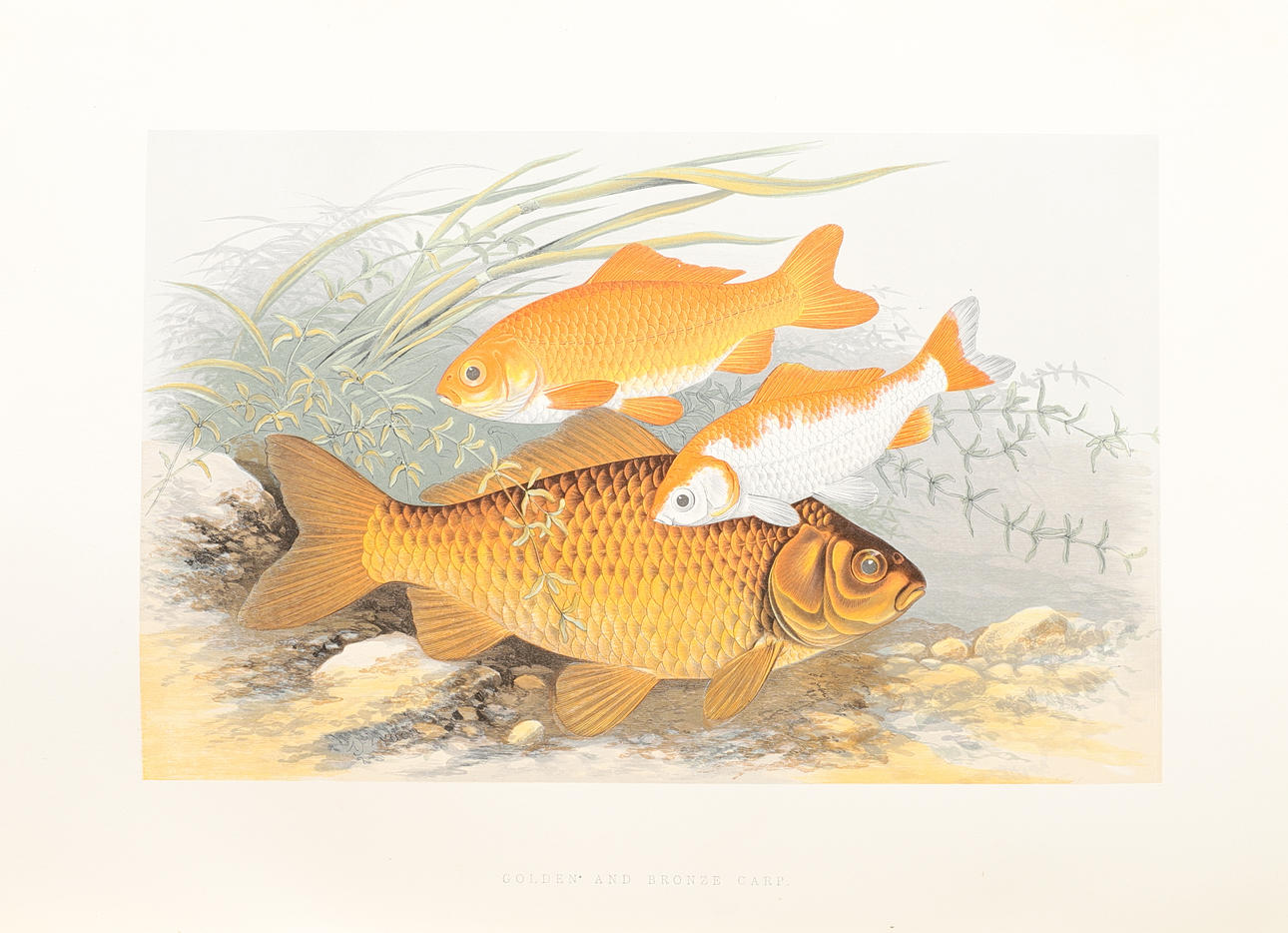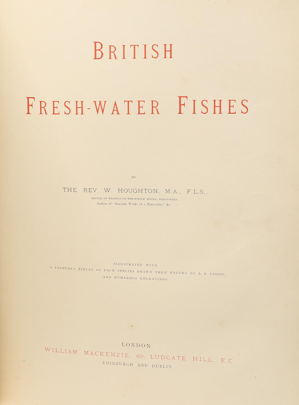 Groombridge & Söner, #1879. Folio. Endast en volym (av två), tegelrött tyg, blockerat i förgyllt och svart med fiskemblem, t.ex. xylograferade fiskplattor av A.F. Lydon efter Benjamin Fawcett, textilustrationer.
