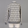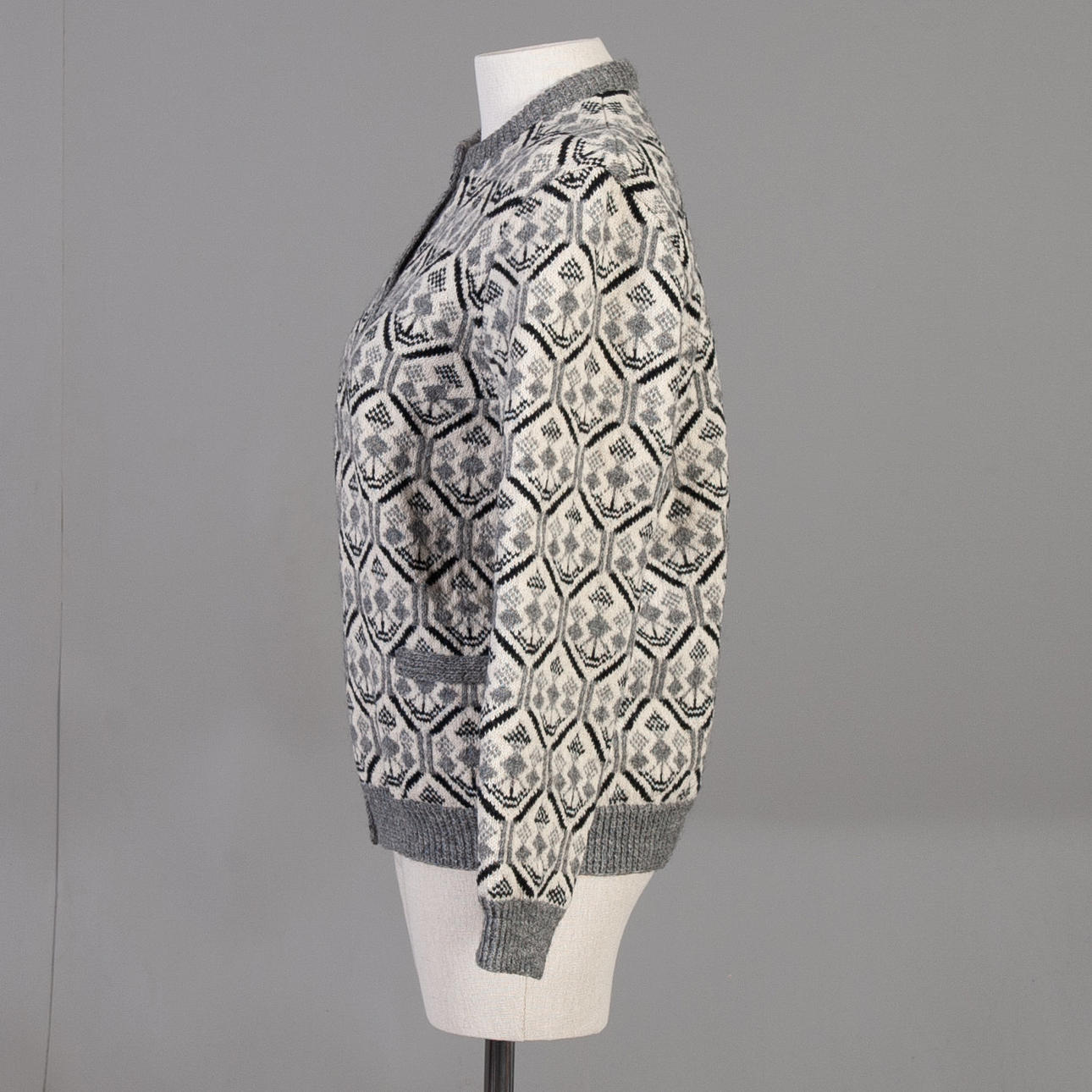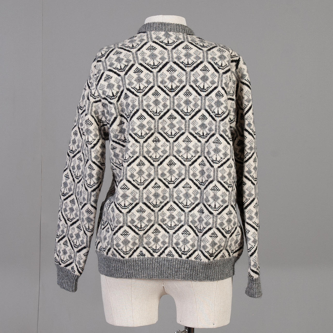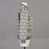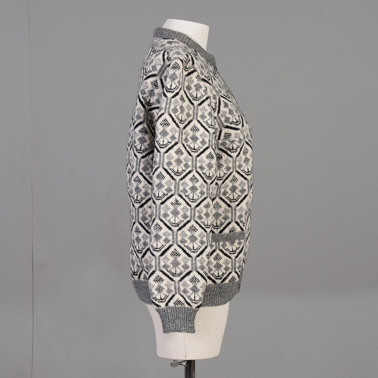 Stiliserat mönster i grått och svart på gräddvit botten. Två utvändiga fickor
