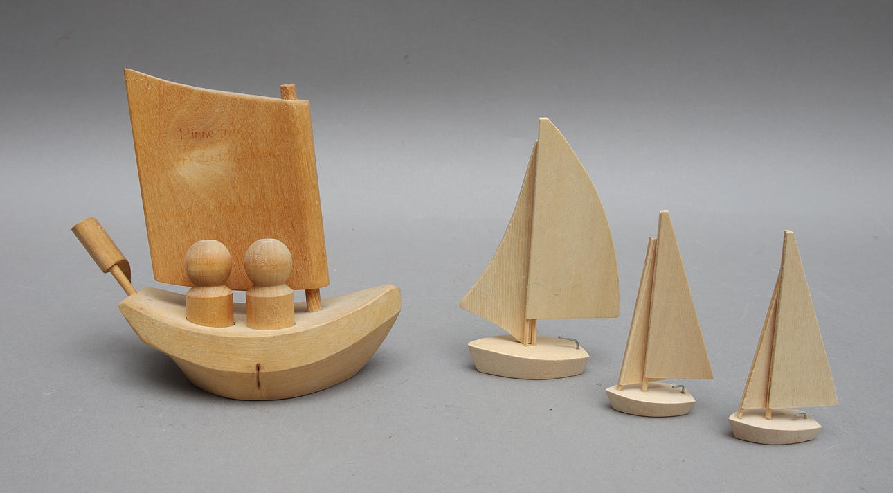 Blekinge ekan, vikingaskepp, segelbåtar, skepp, båtpussel. Höjd från ca: 9 cm till 36 cm. Längd från ca: 4 cm till 46 cm.