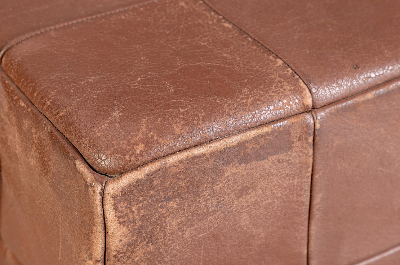 Tecken på slitage, kraftig gnidning, sprickor och repor i läder. Sömmar lösta i botten av en pall.