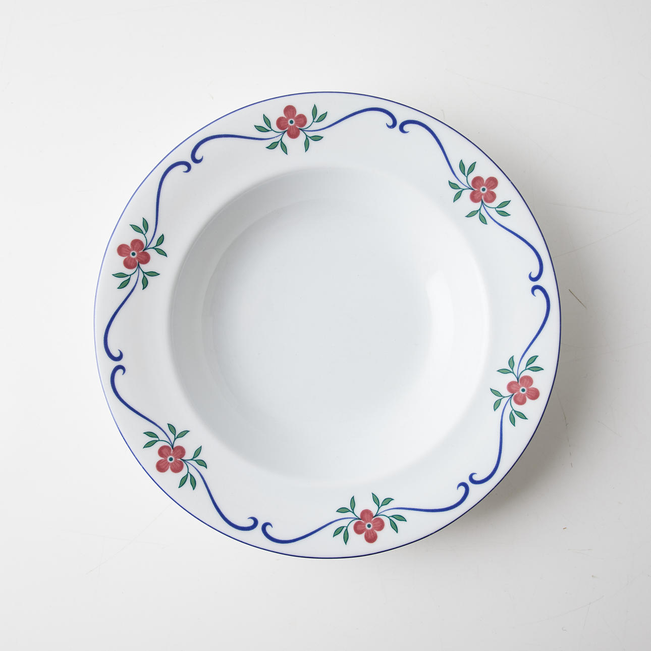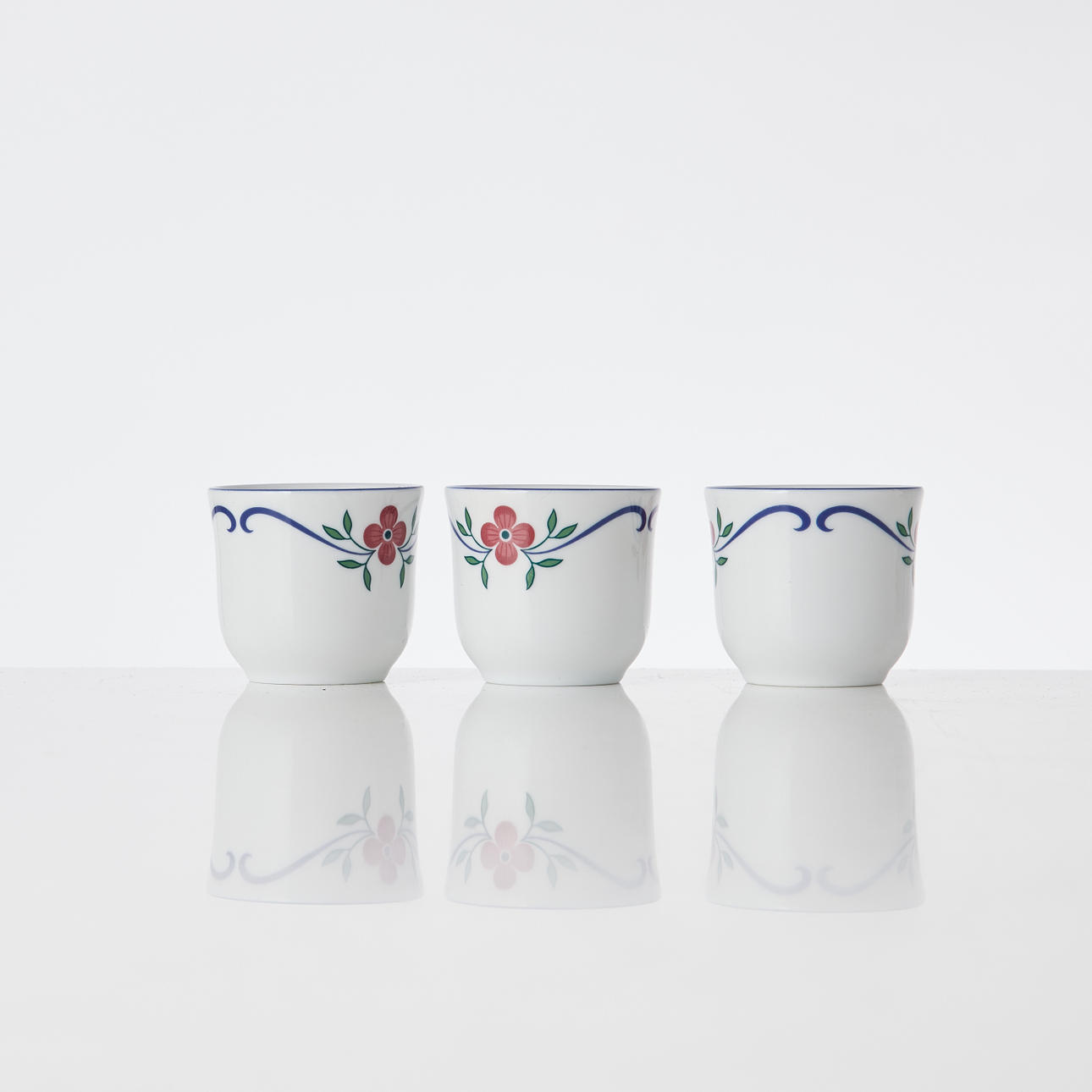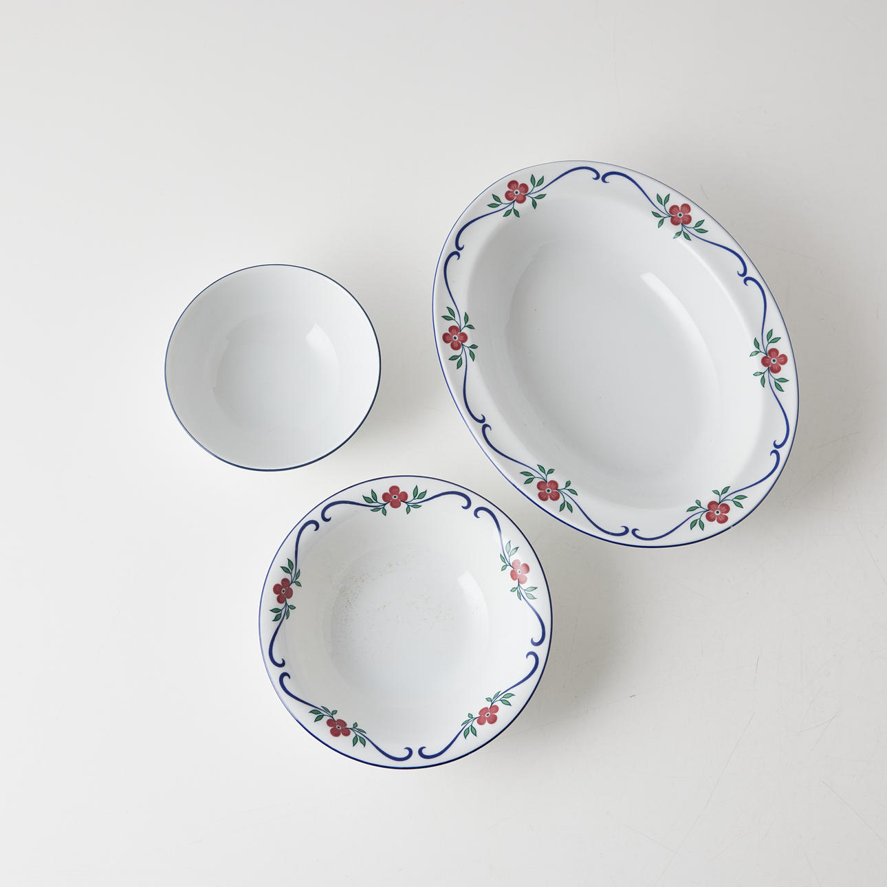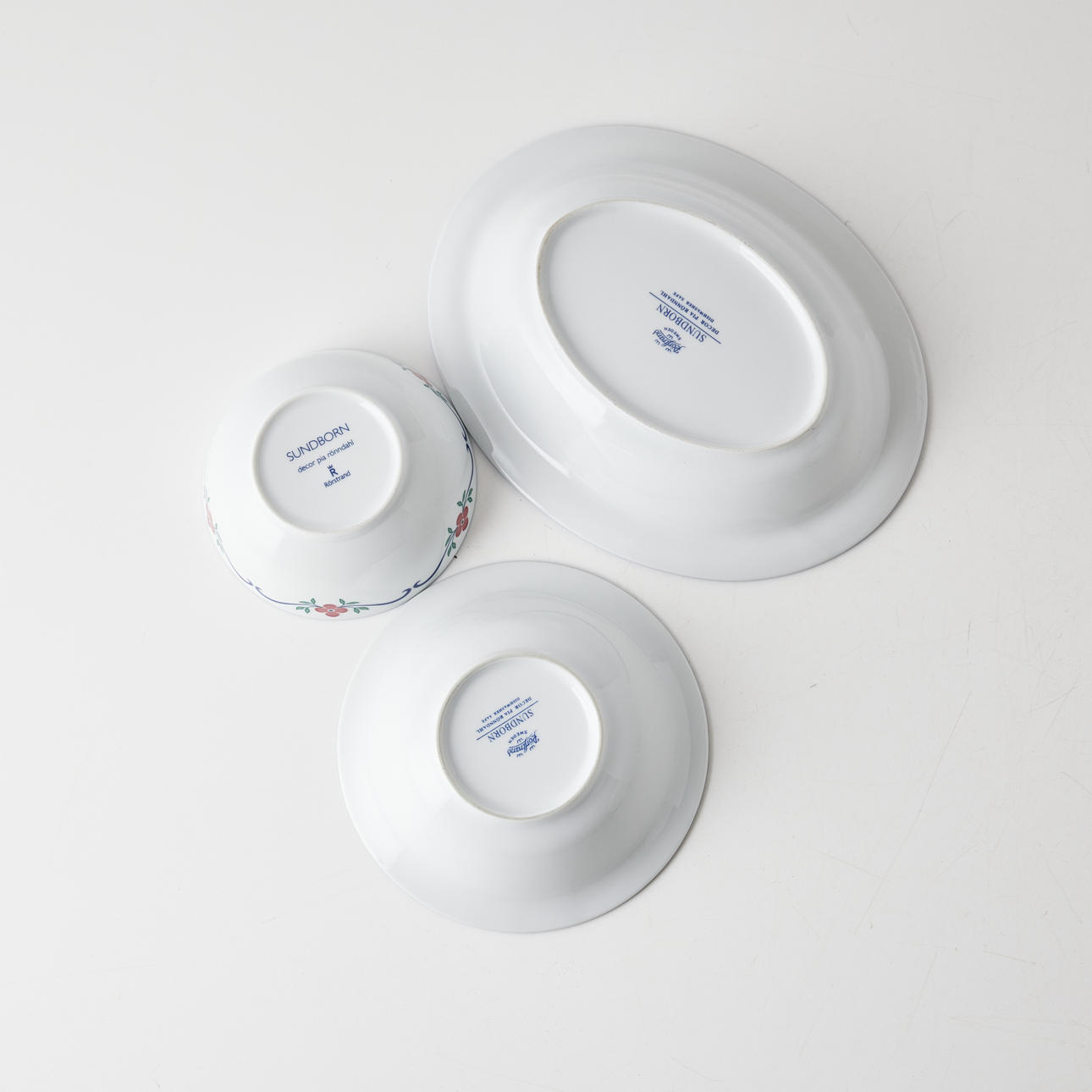 Bestående av: 3 äggkoppar, 3 koppar, 6 assietter, 5 mattallrikar, ett uppläggningsfat, 3 djupa tallrikar, 2+2 skålar olika typ.