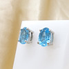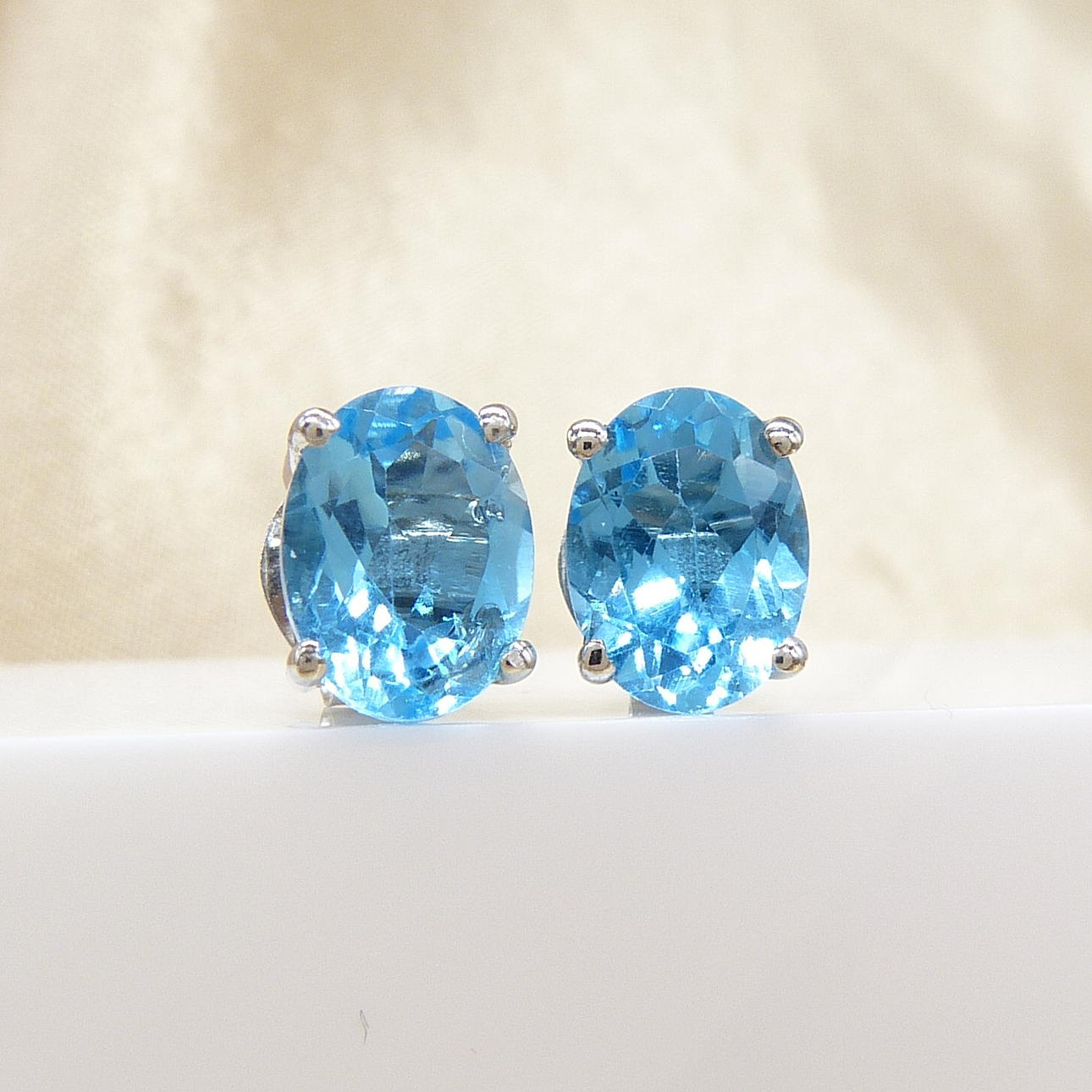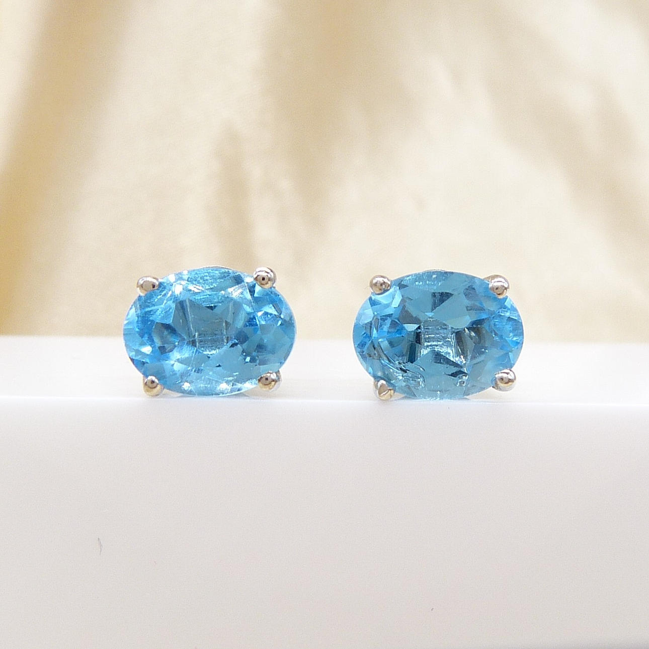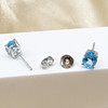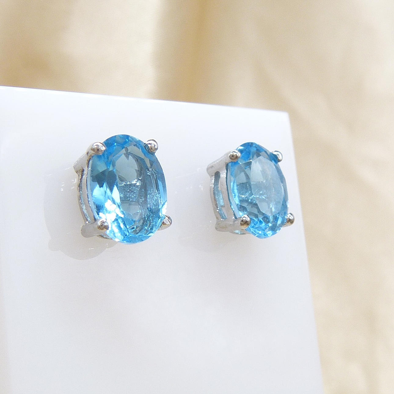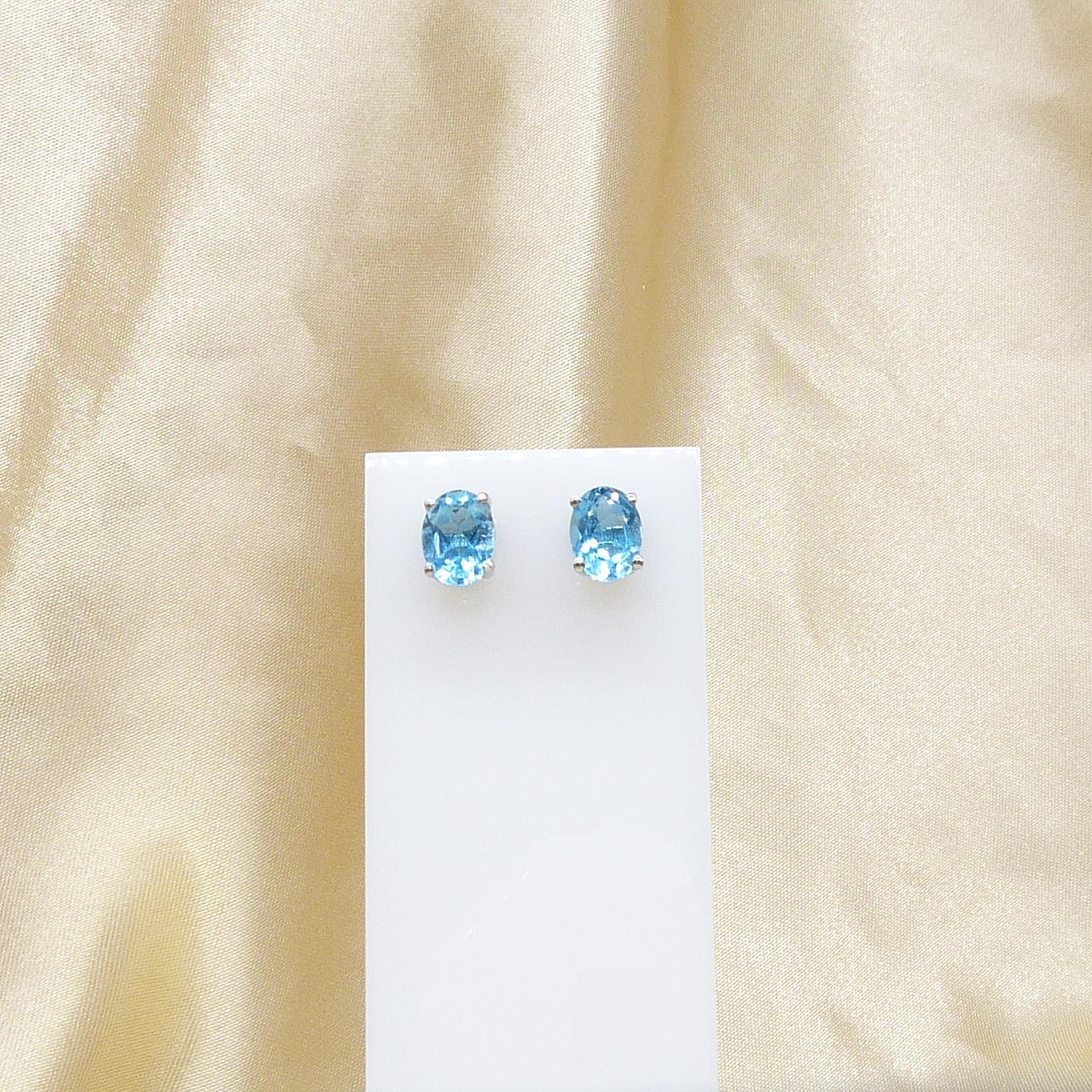 Varje tapp i detta par är inställd med en oval skuren blå topas ädelsten som mäter 8 x 6 mm.