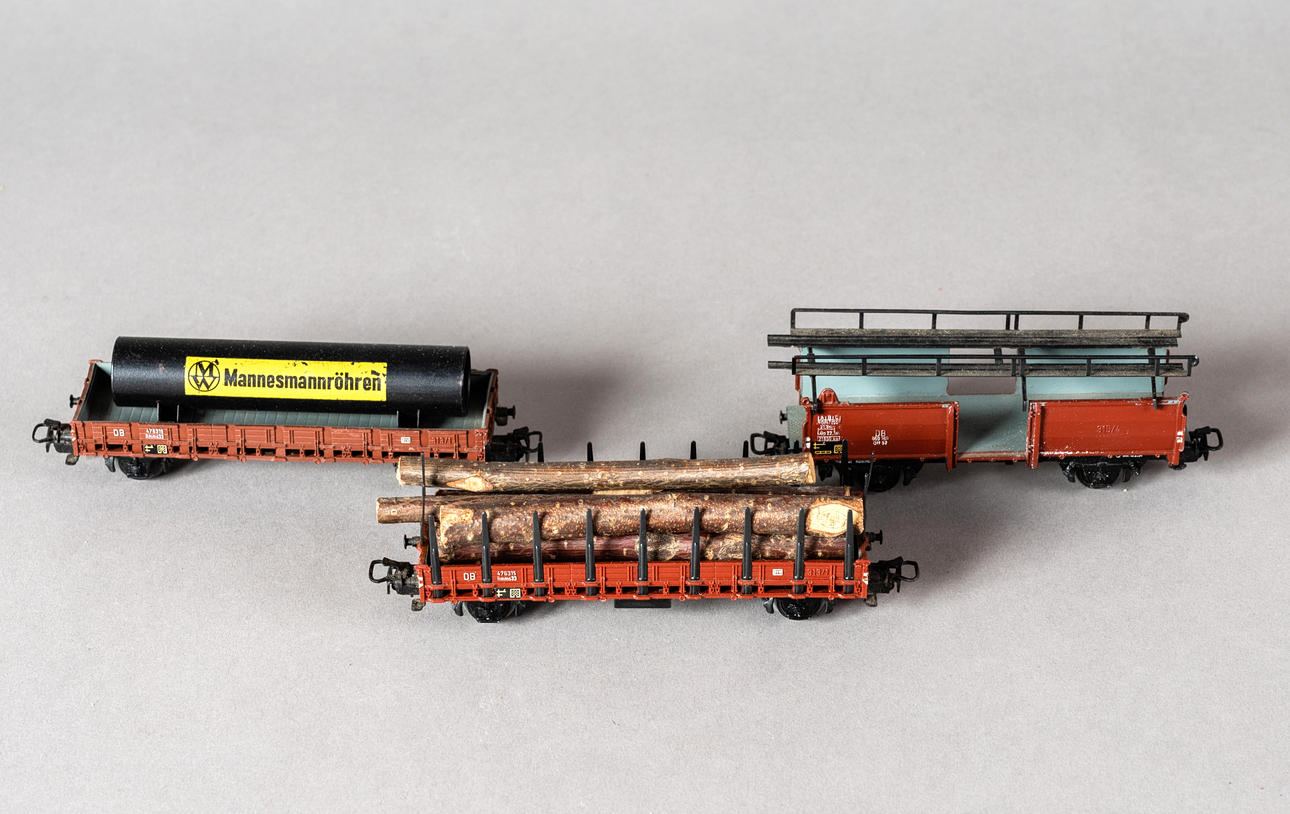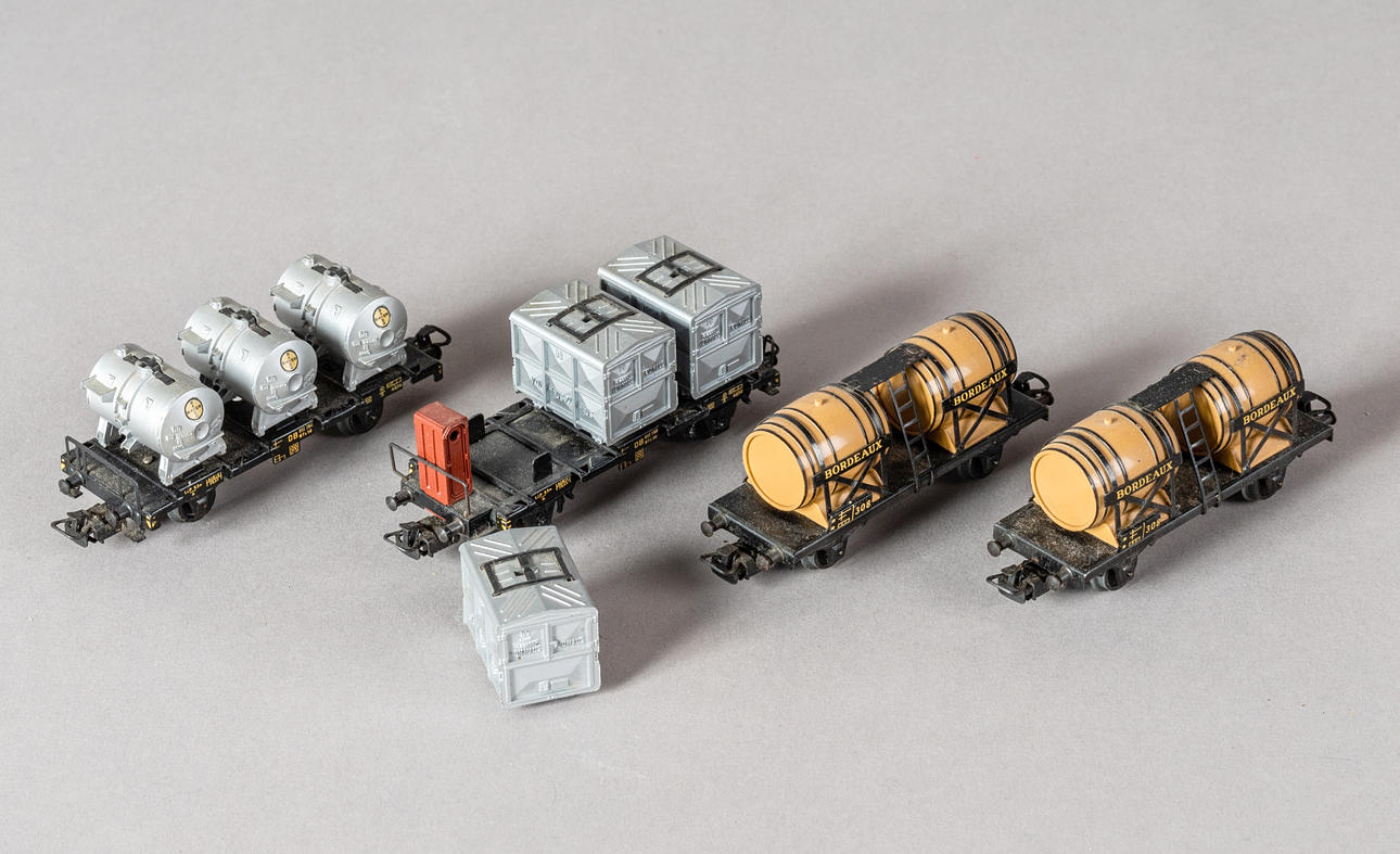 22 olika godsvagnar, inklusive trä, vinfat och olika tryck.