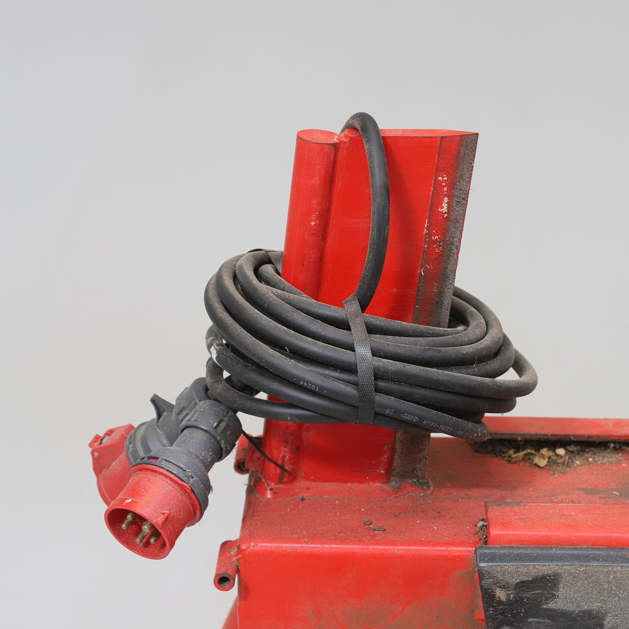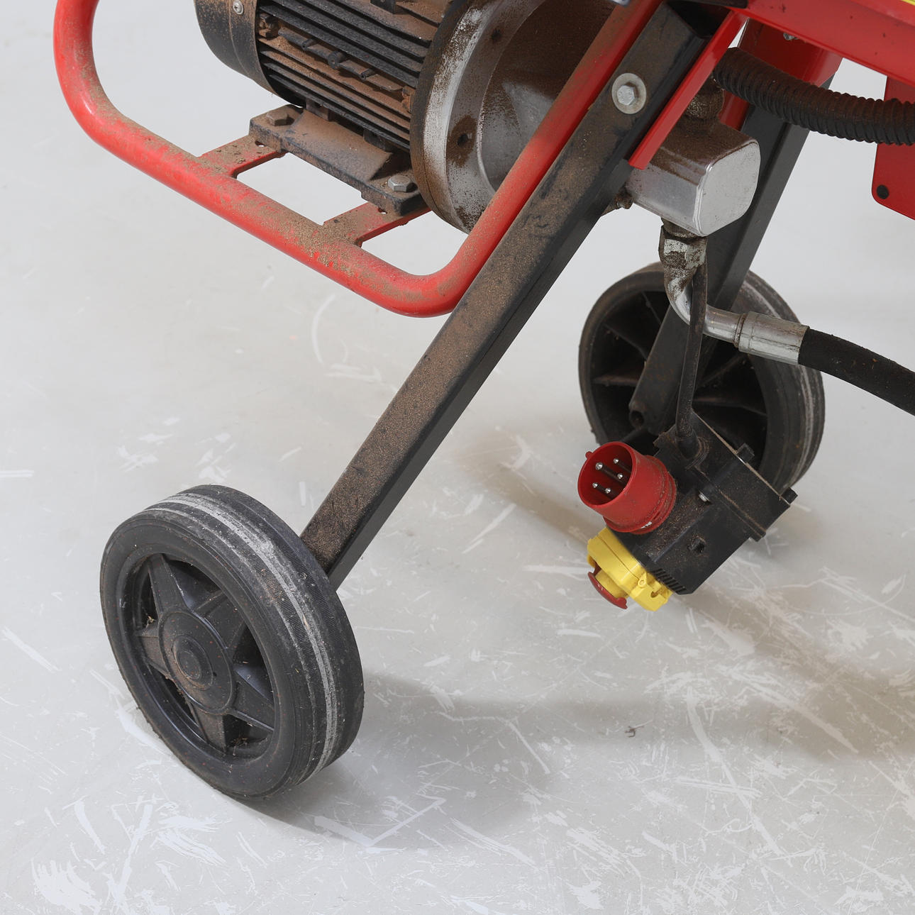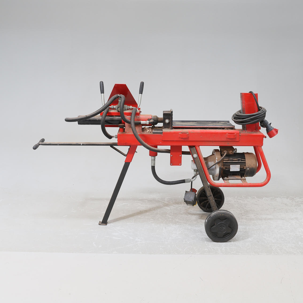 Drivs elhydrauliskt. Ett sidobord och handtag medföljer. Klyvlängd 30-70 cm. Fast klyvkil. Total längd ca 170 cm.
