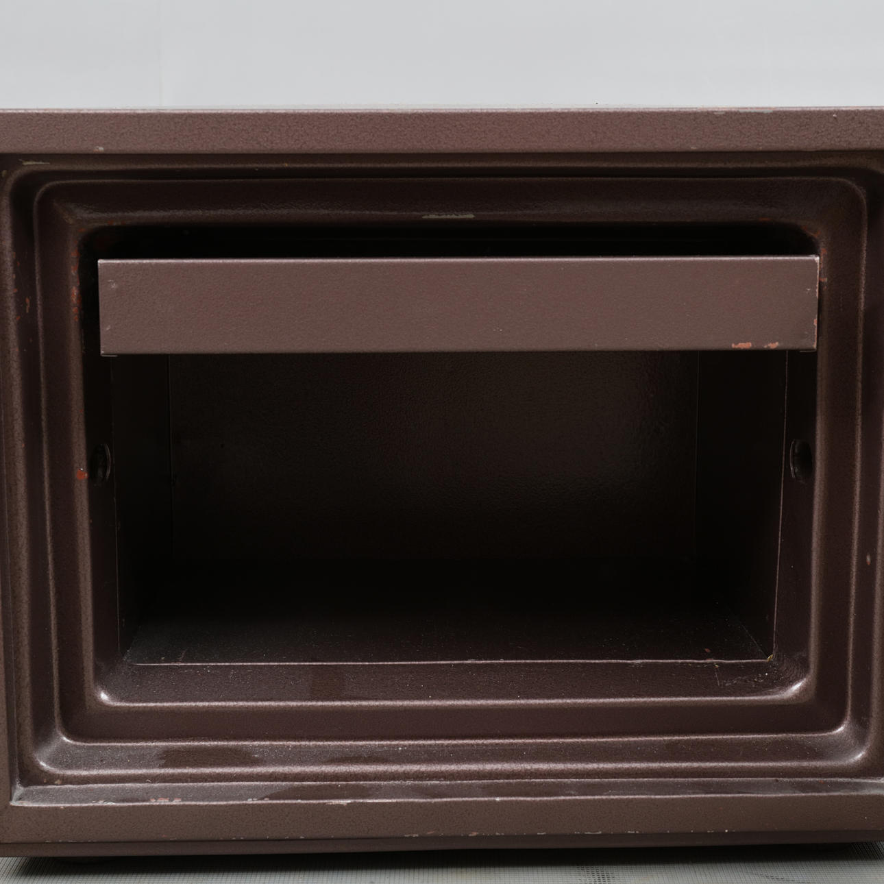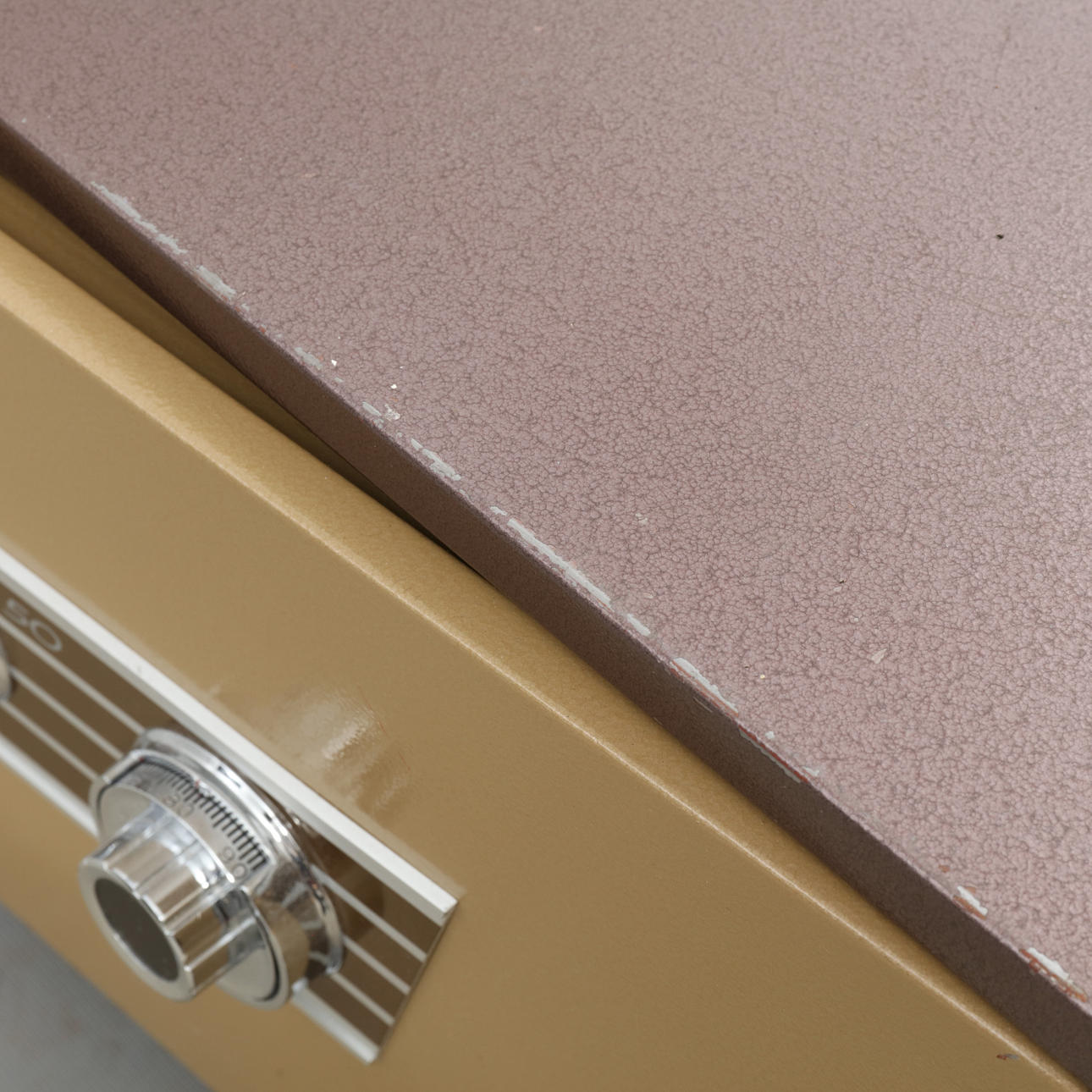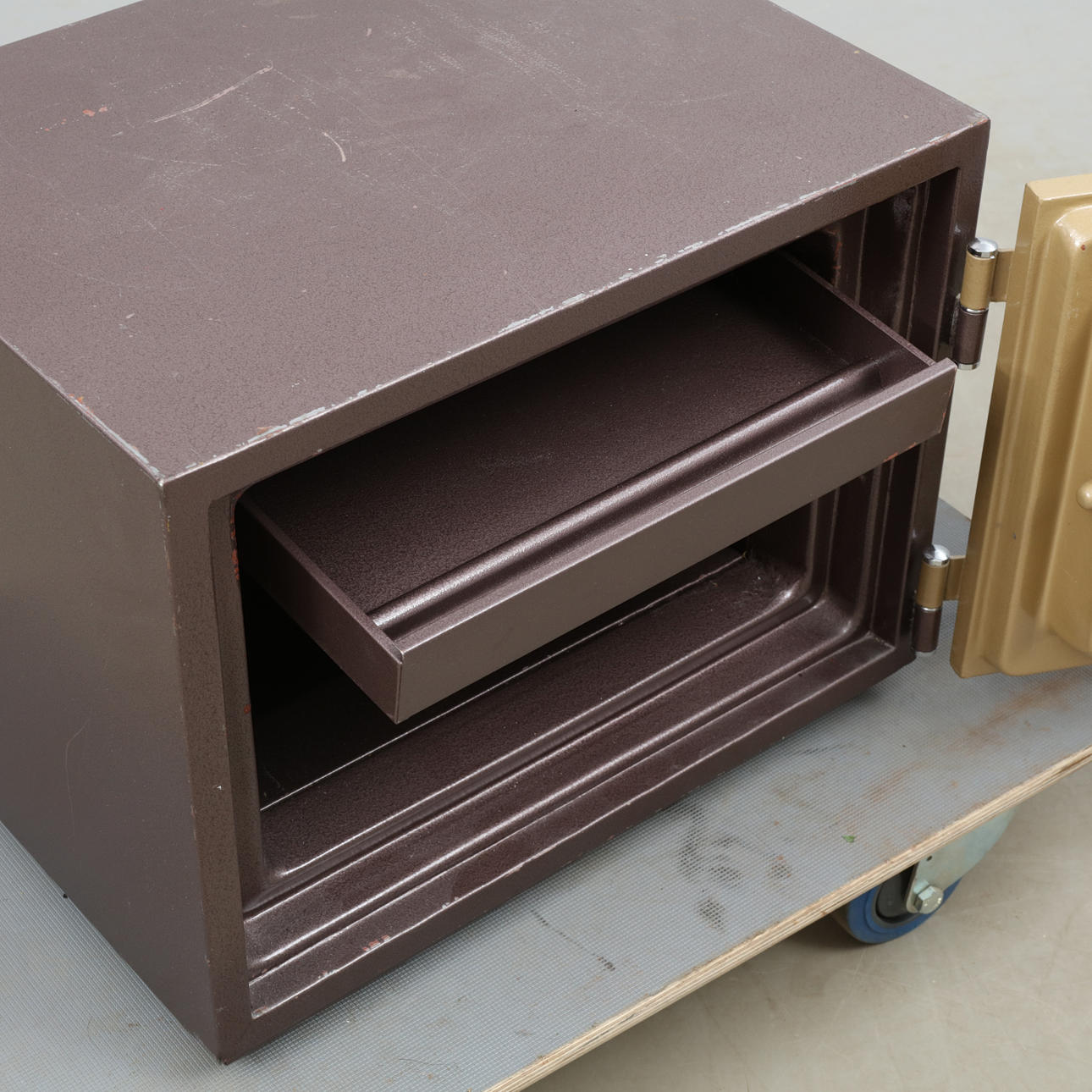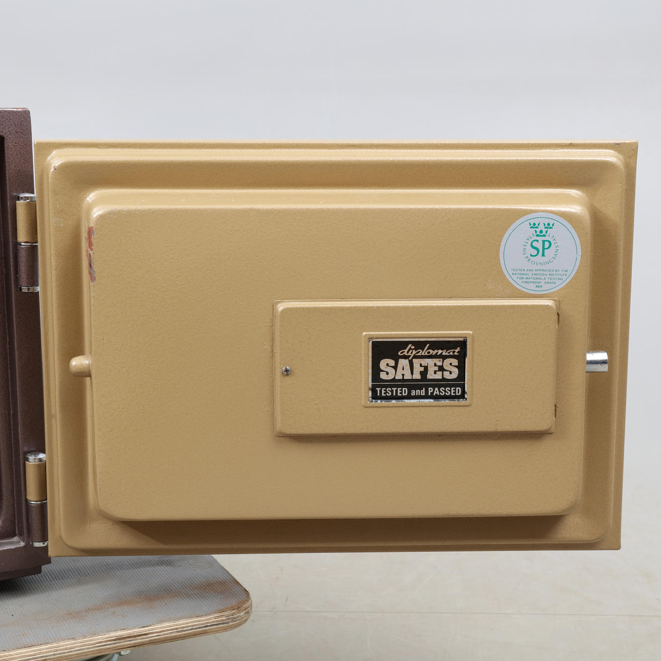 Låses med nyckel samt kod. Två nycklar samt papper med kod medföljer. Längd ca 41, bredd 38, höjd 34 cm.