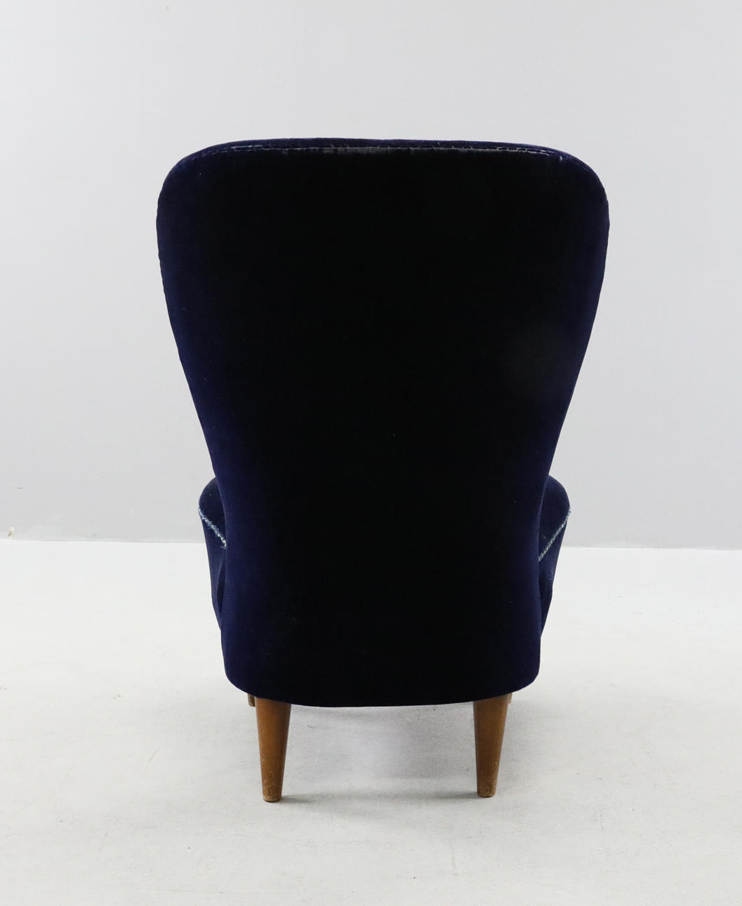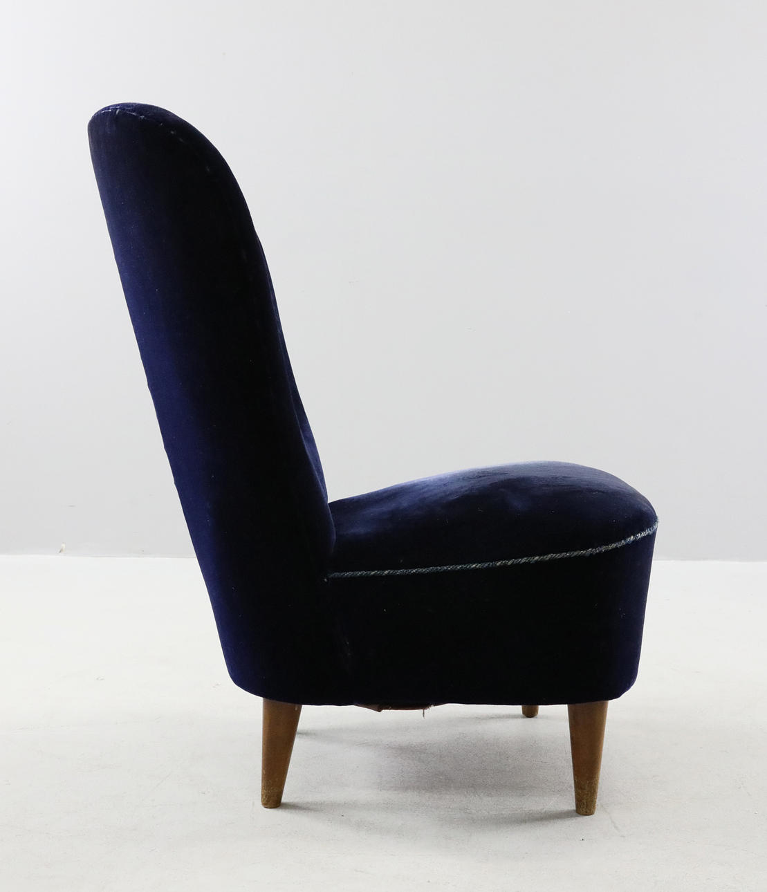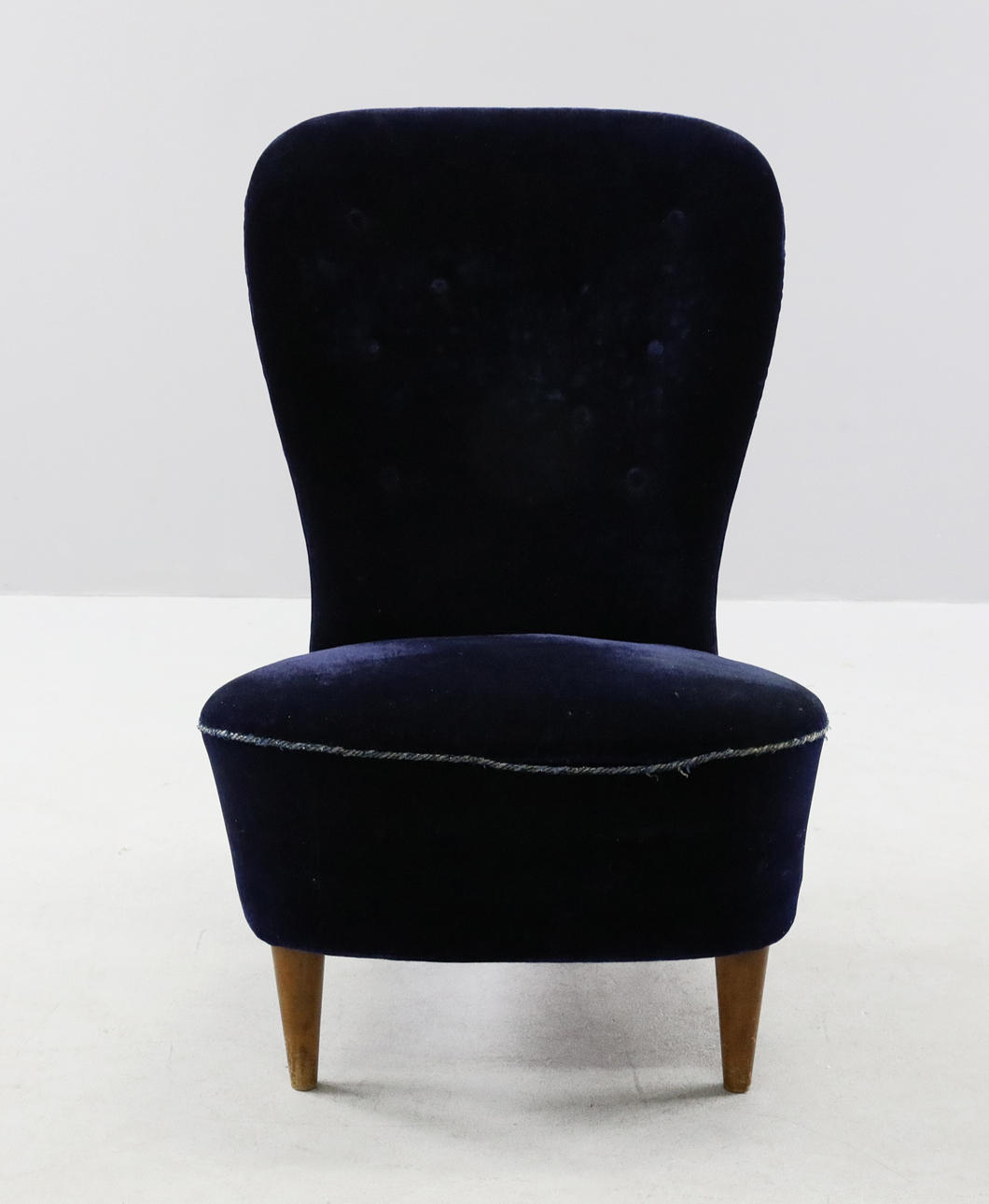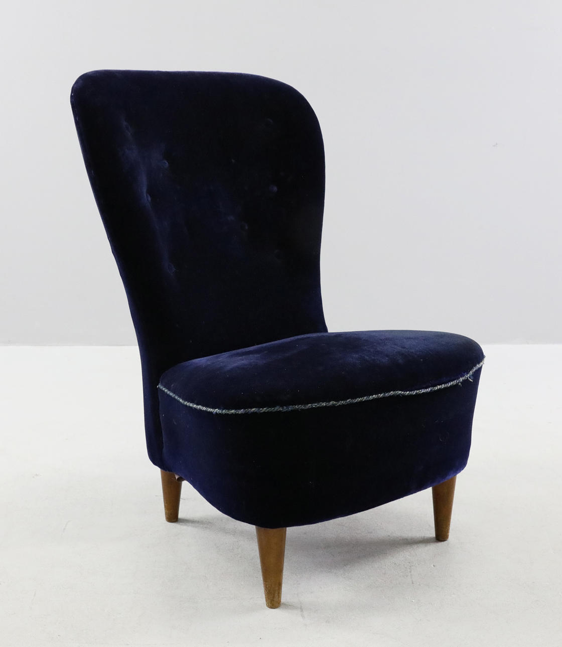 Fast stoppad klädsel, blå sammet. Höjd 87 cm sitthöjd 40 cm bredd 58 cm.