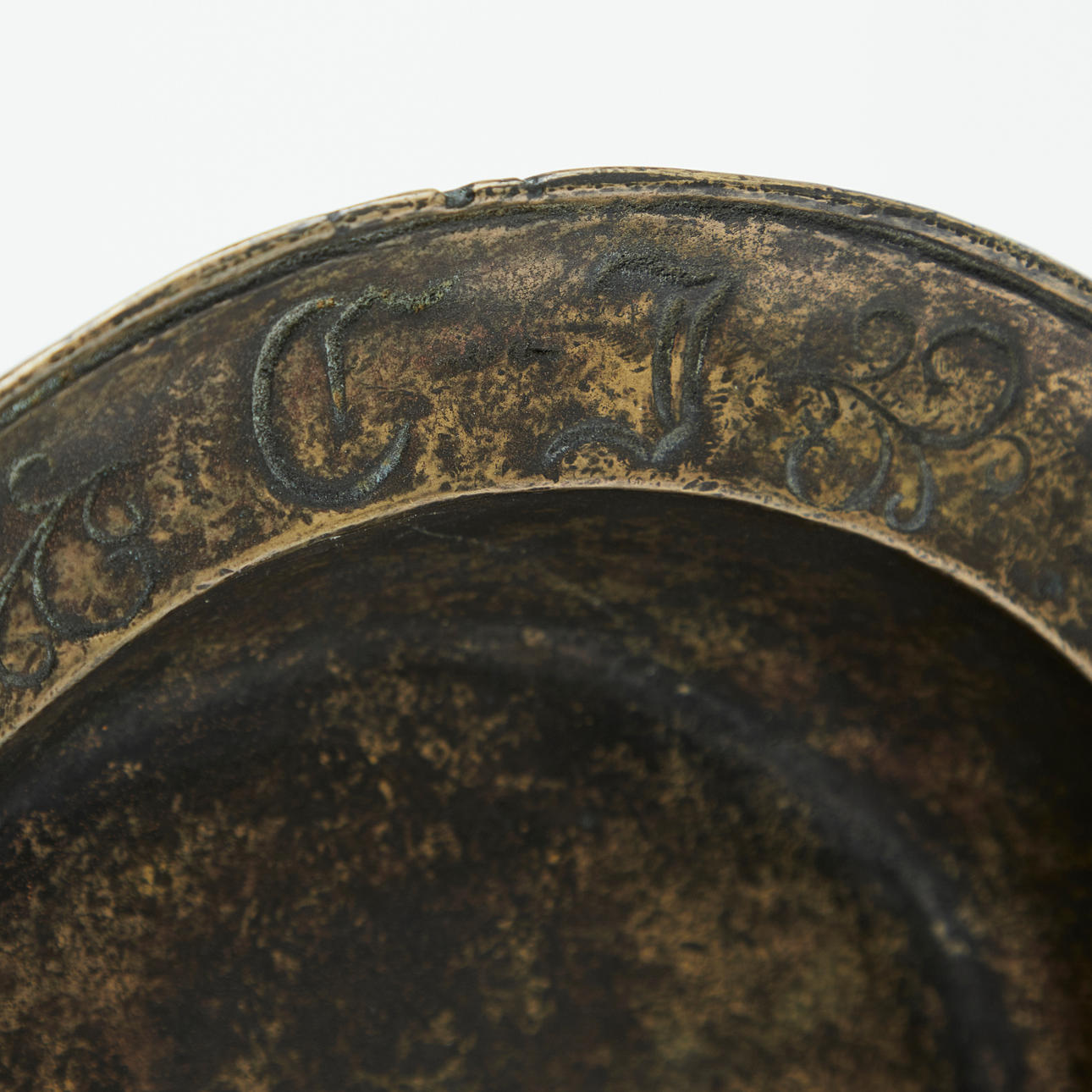 skal, brons. Rund bronsskål med kragekant med präglad inskription 'C. J. ', h. 6,5 cm, d. 27,5 cm.