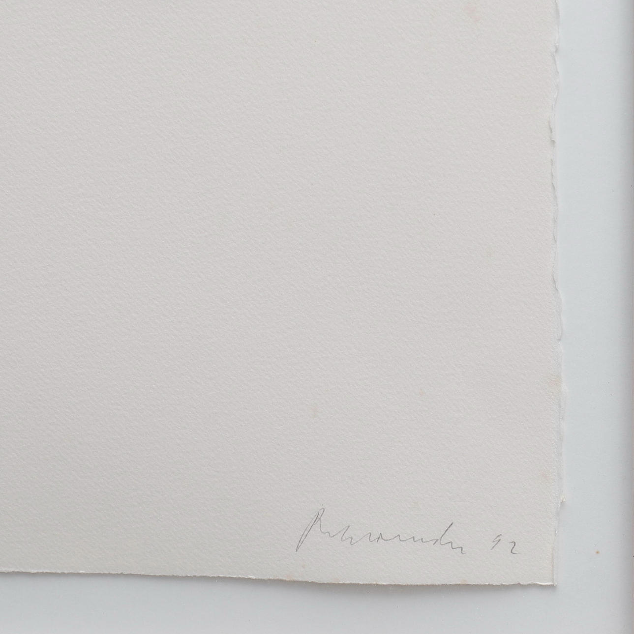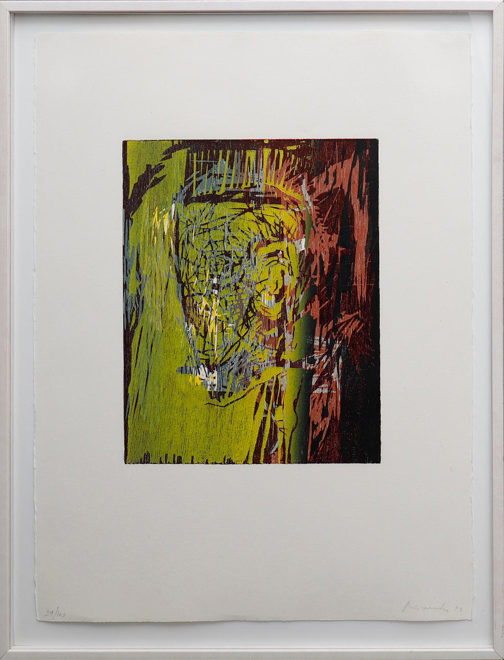 Signerad, daterad 92, numrerad 29/160, färgträsnitt på fritt liggande inramat papper, bildyta ca 42x33 cm.