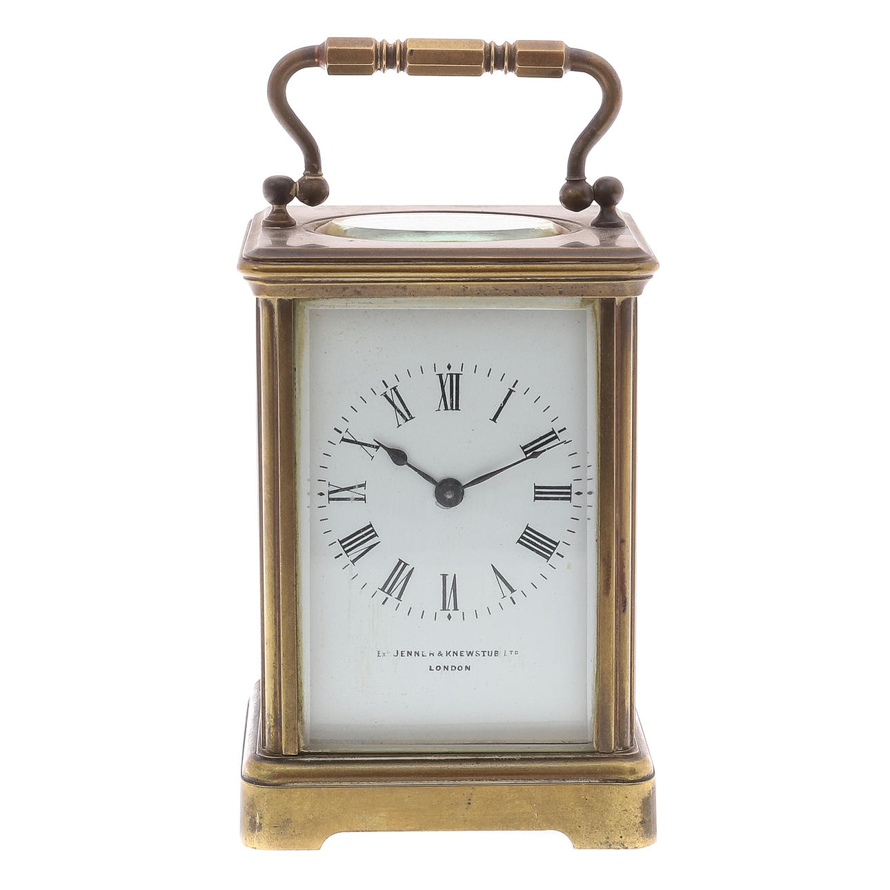 Exd. Jenner & Knewstub Ltd, London, ersättning spak plattform gång, vit emalj urtavla med romerska siffror, 15cm hög, med en nyckel.