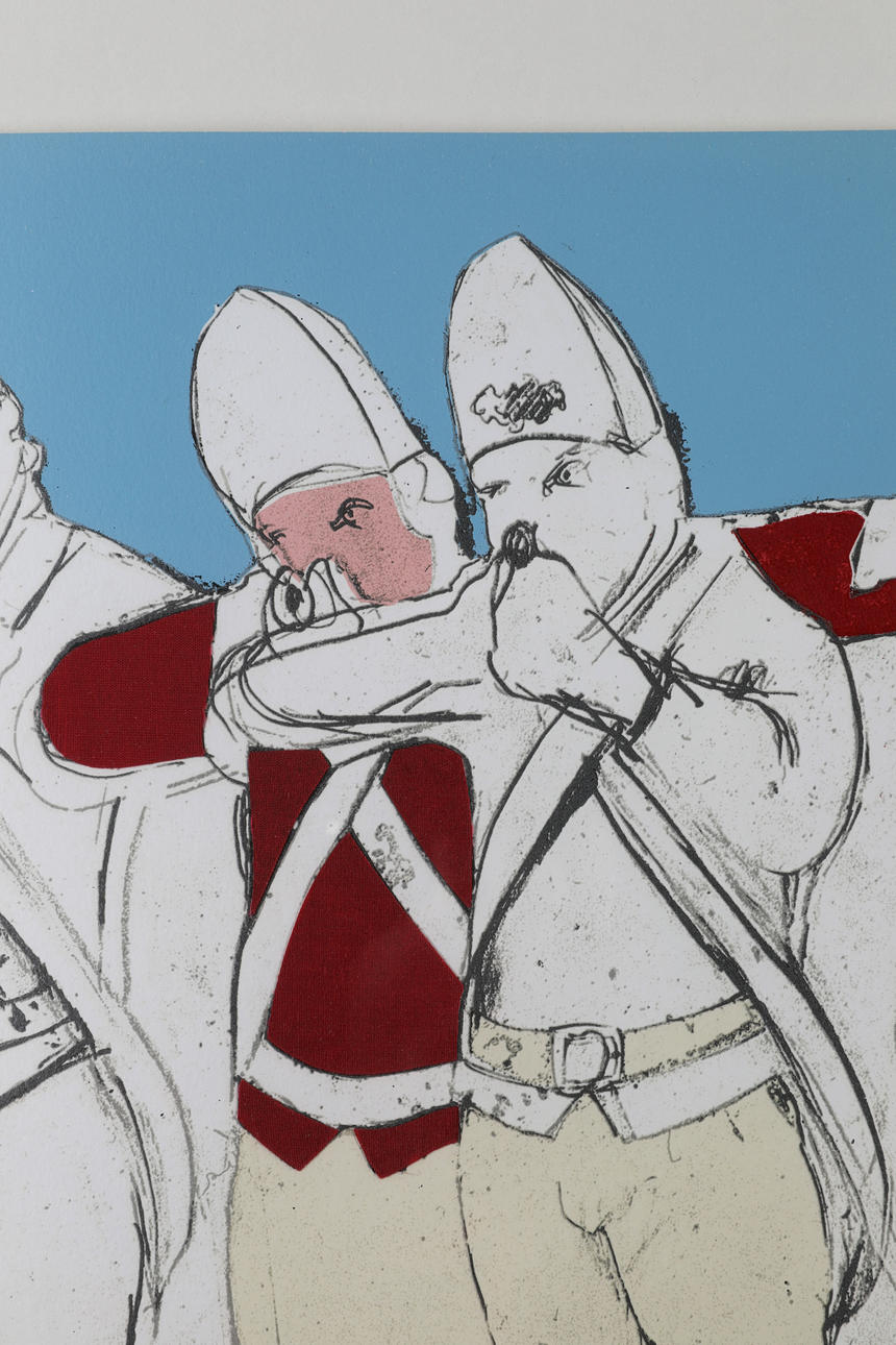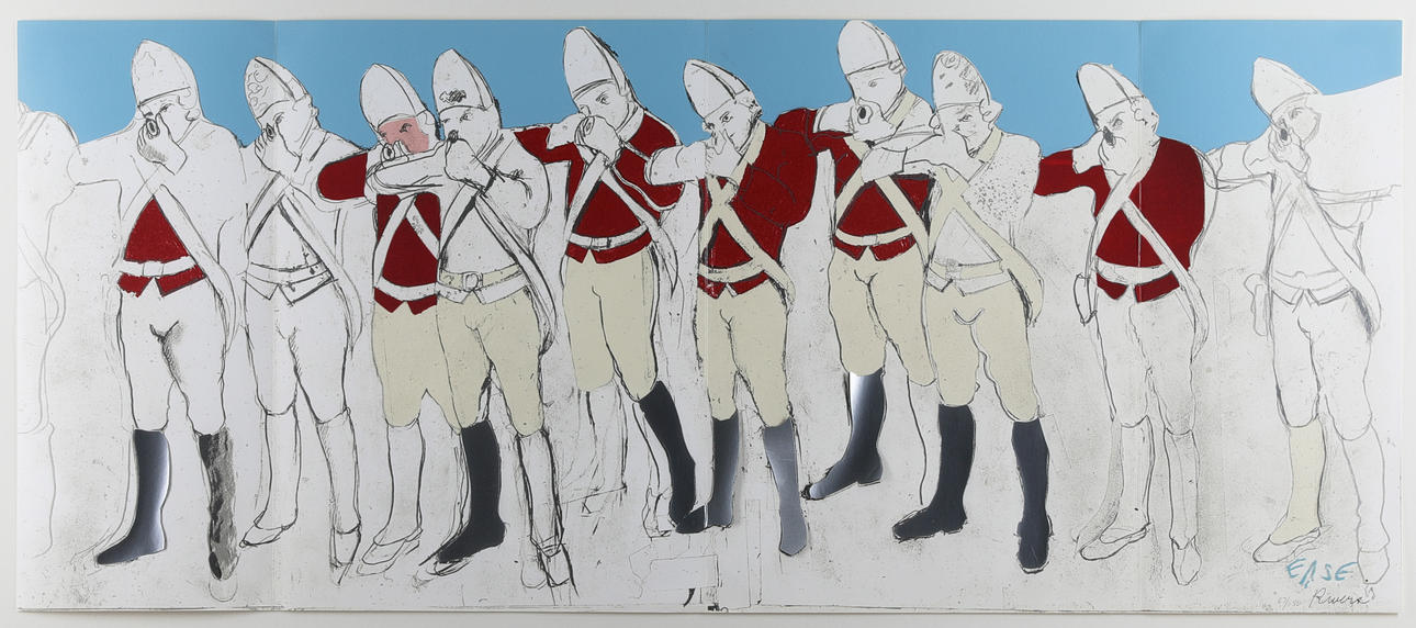 Redcoats (vika ut format). 1970. Silkscreen tryckt i färger och collage. 48 x 113,5 cm Numrerad och signerad nedre högra: 67/150. Floder. Inramad bakom glas.