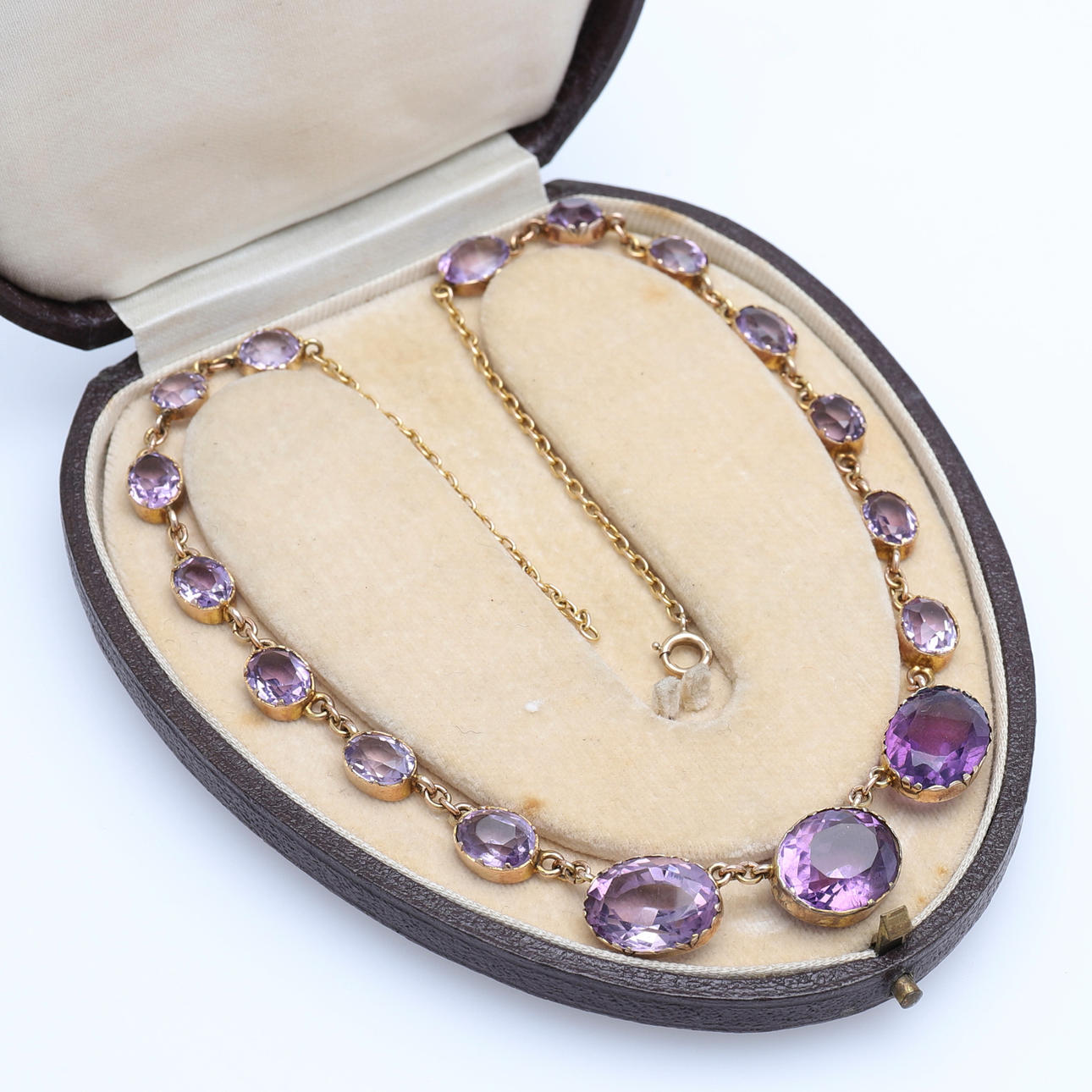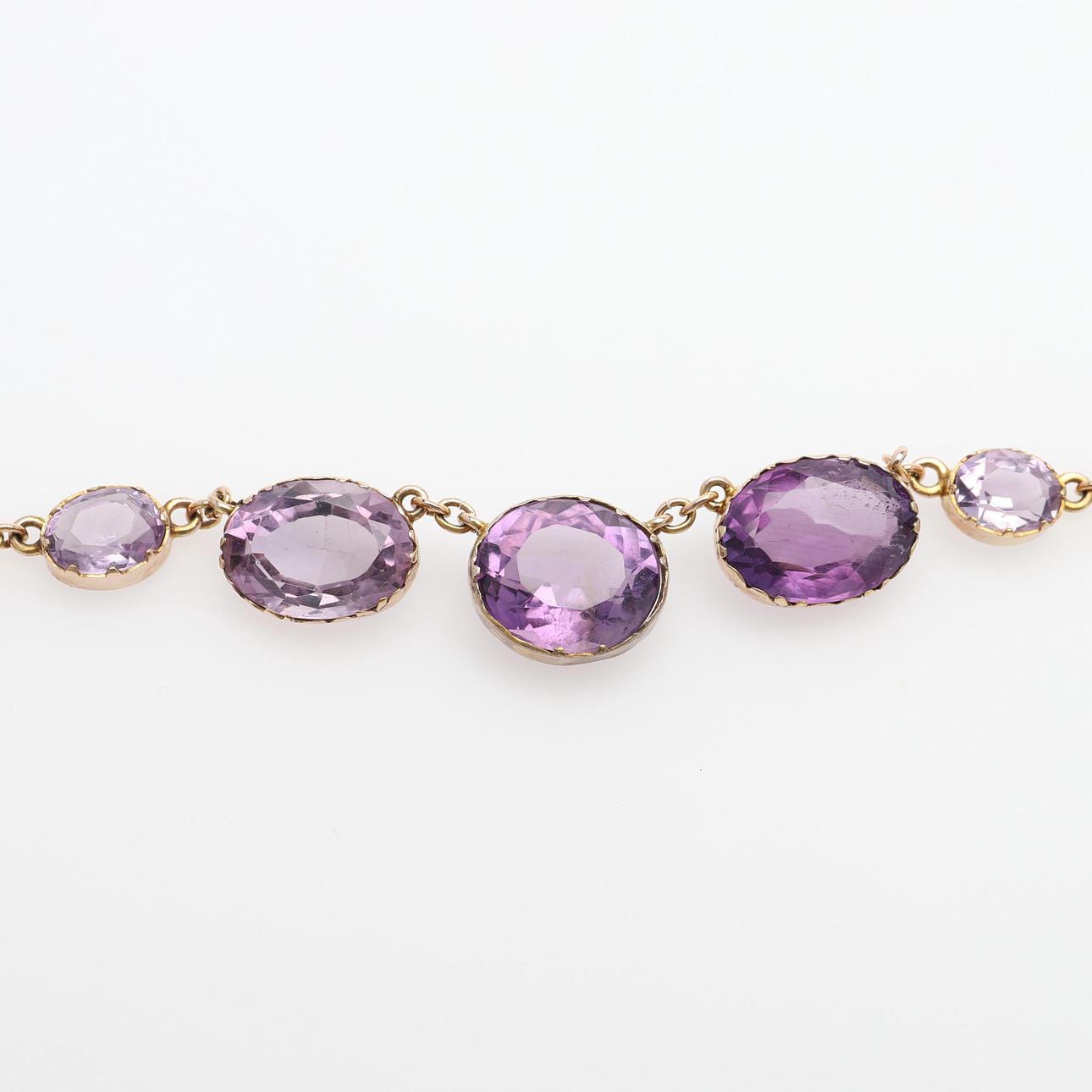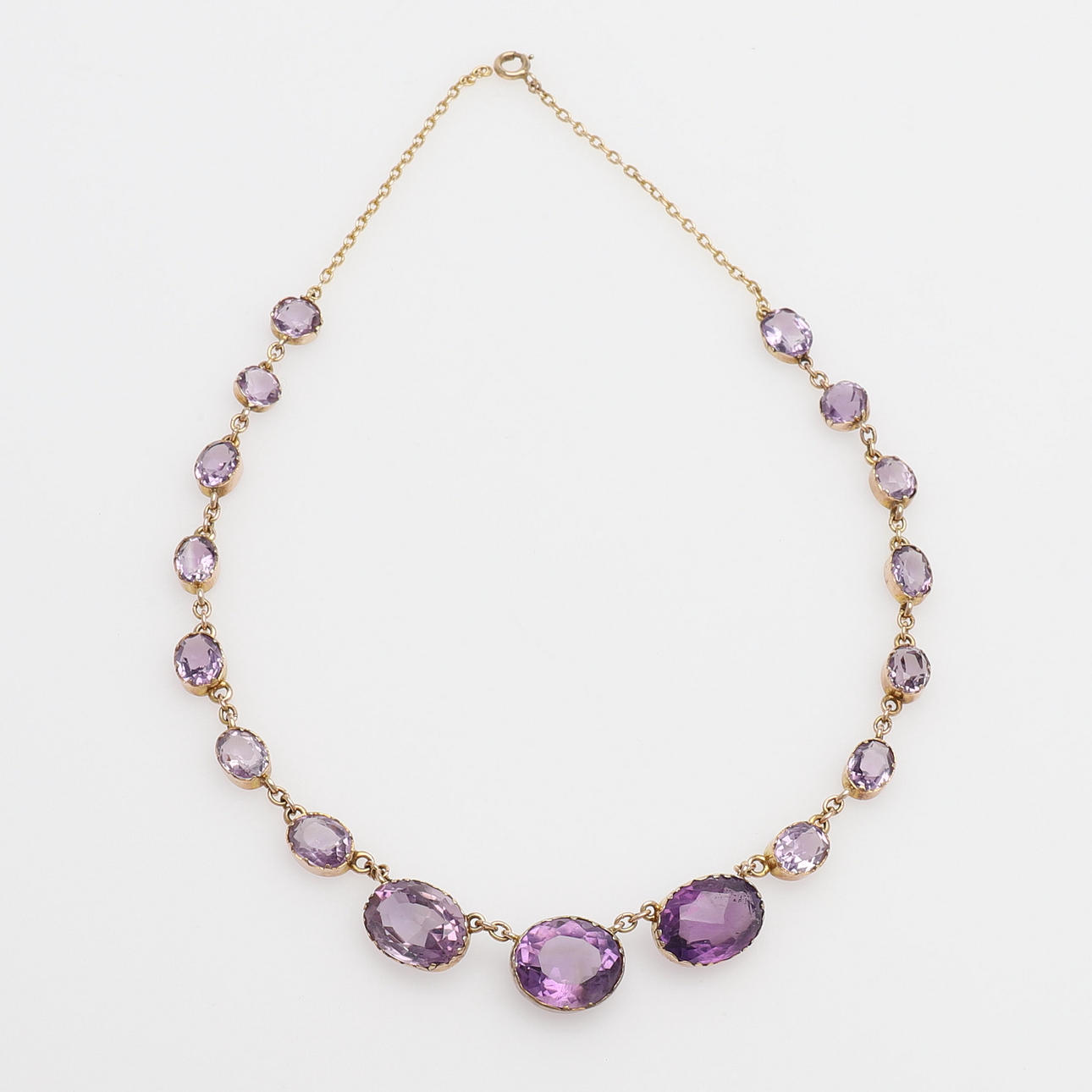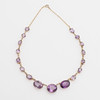 17 ovalt slipade ametister fattade i 14k guld med springring av förgyllt silver, längd 40,5 cm, vikt 16,2 gram. Etui.
