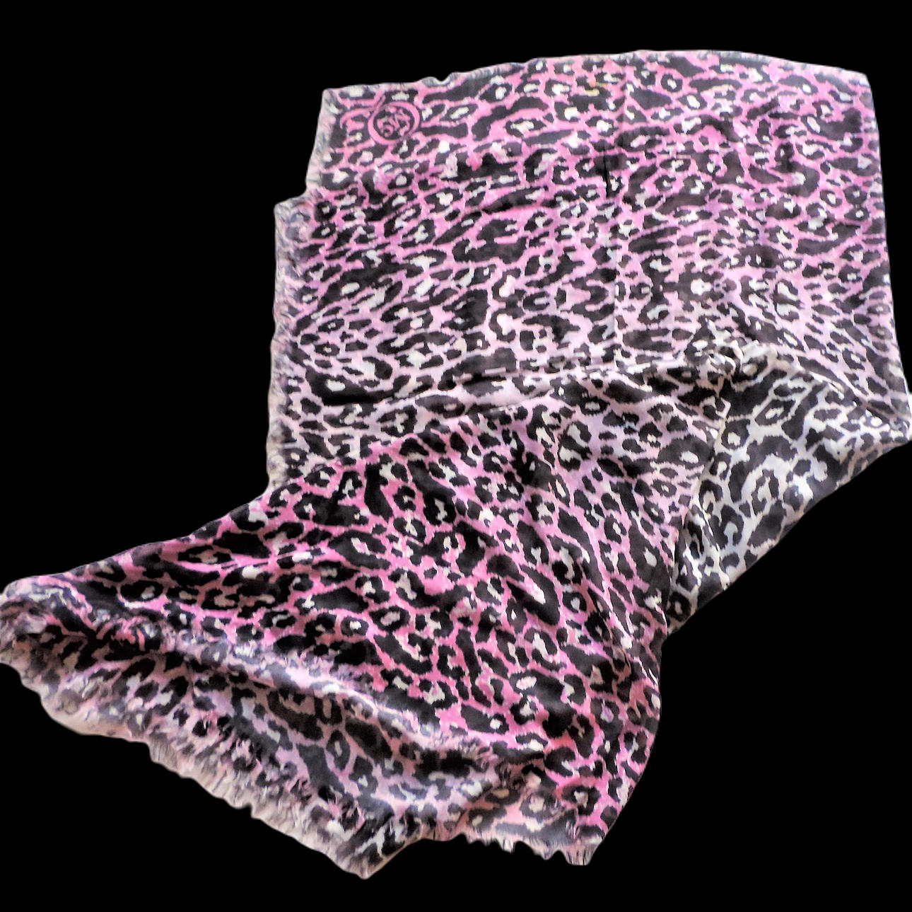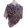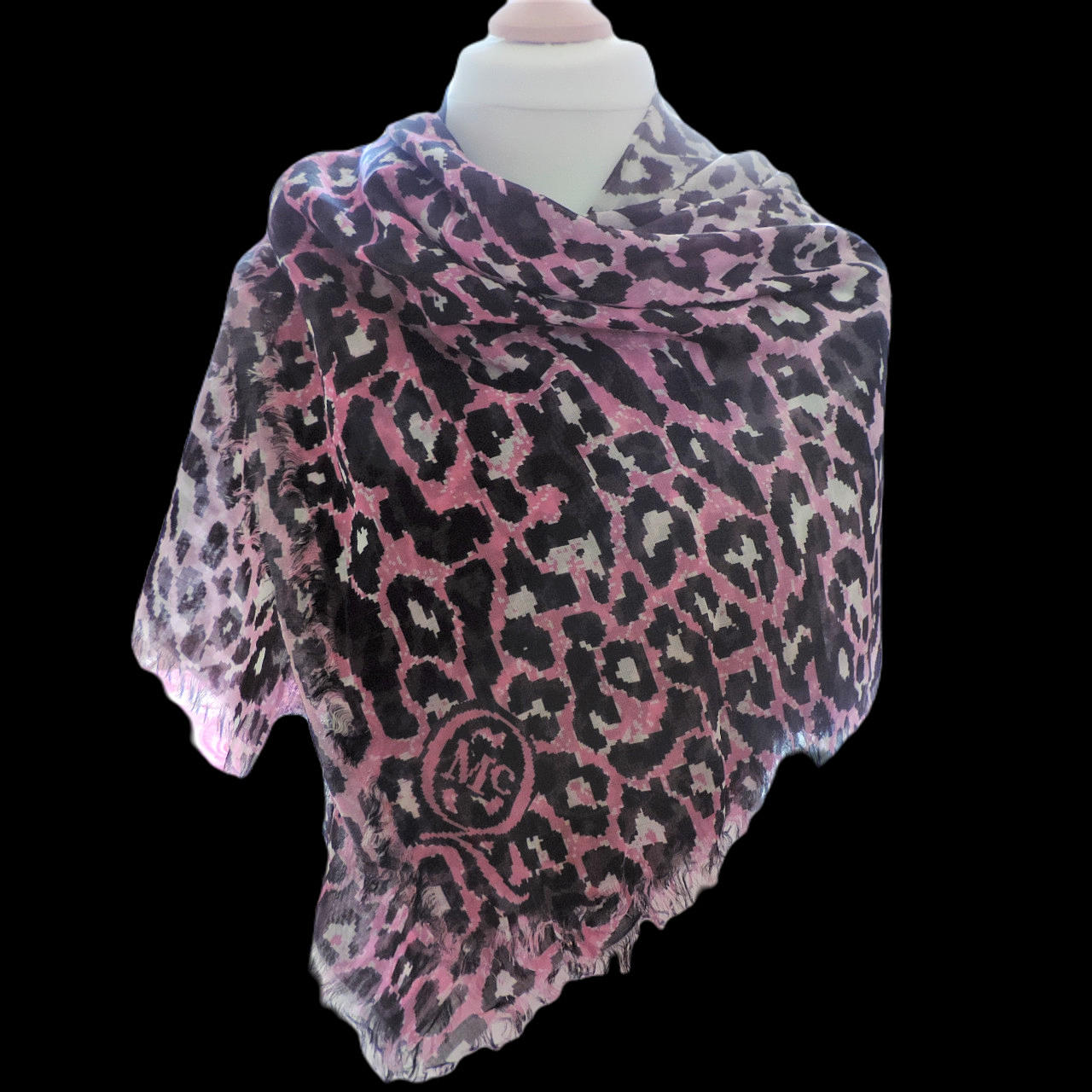 En rosa och svart leopardmönstrad halsduk/shaw med slitna fållar av designern Alexander McQueen. Den mäter 130 cm kvadrat och har MCQ Brand-logotypen på hörnet.