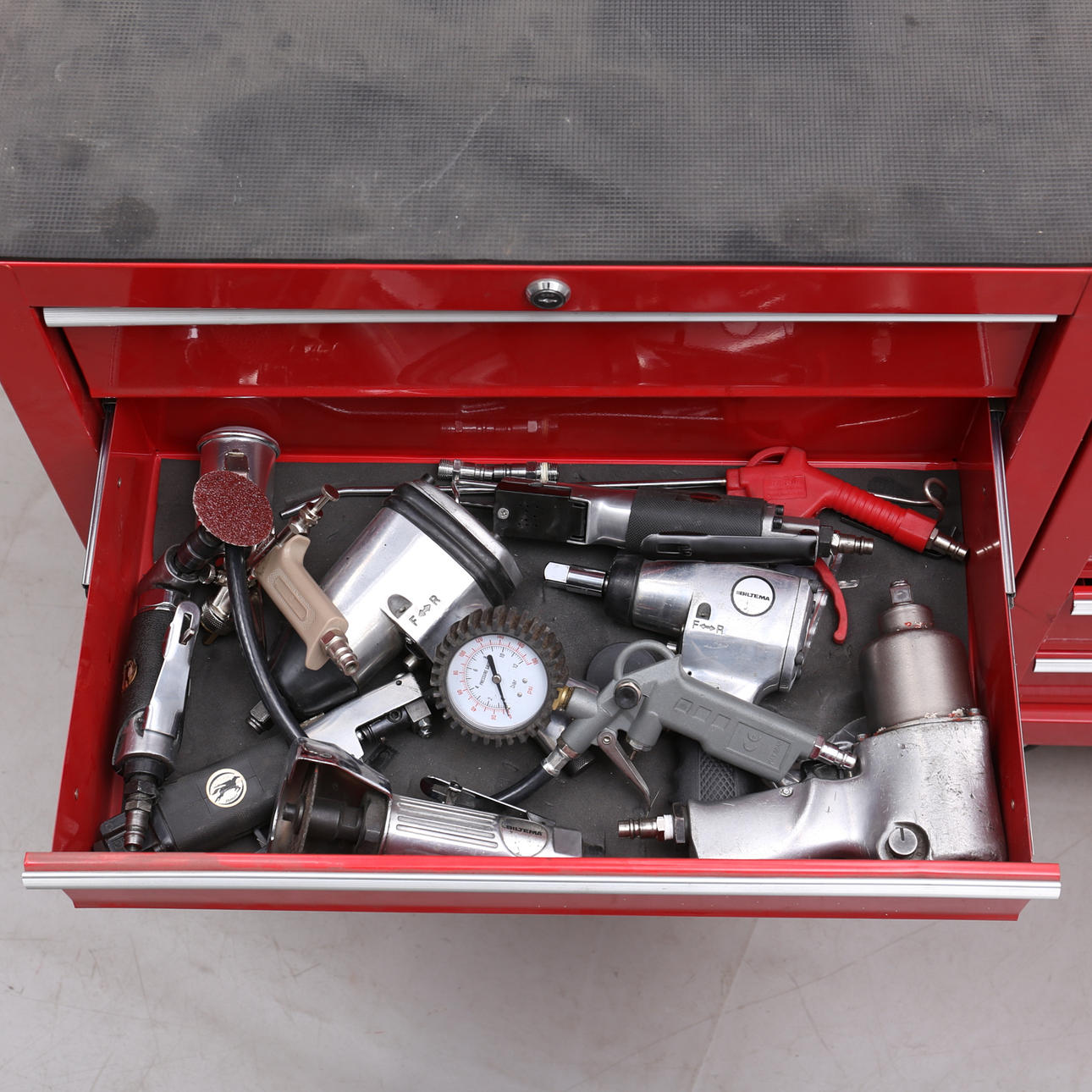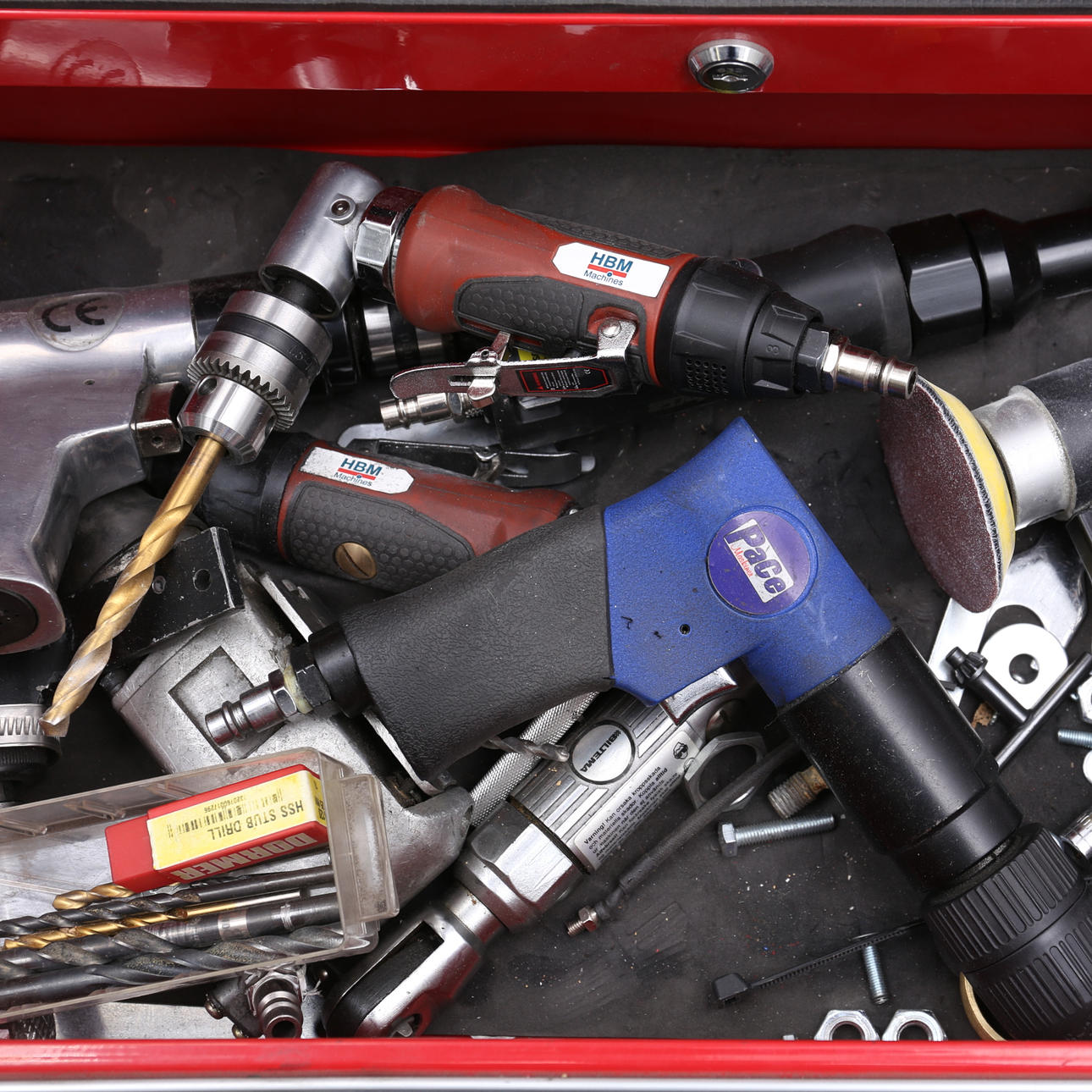 Innehåller diverse verktyg mm, bla tryckluftsverktyg, centreringsverktyg samt hammare.