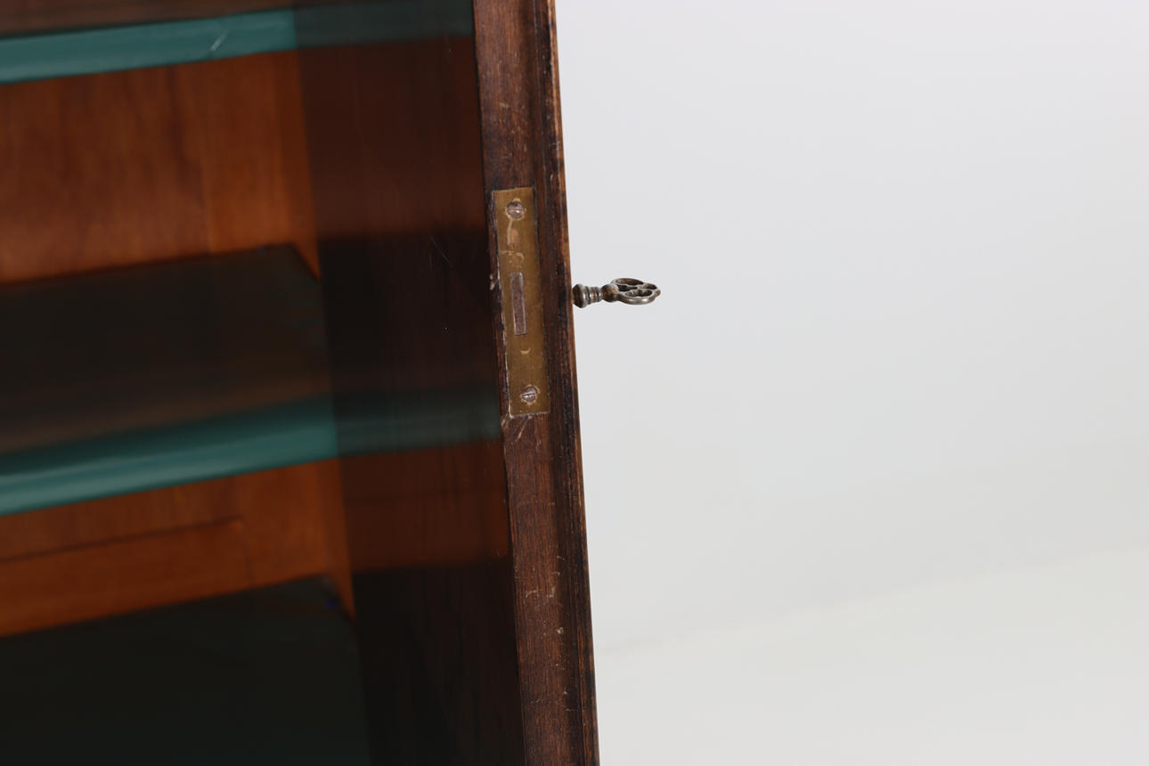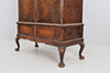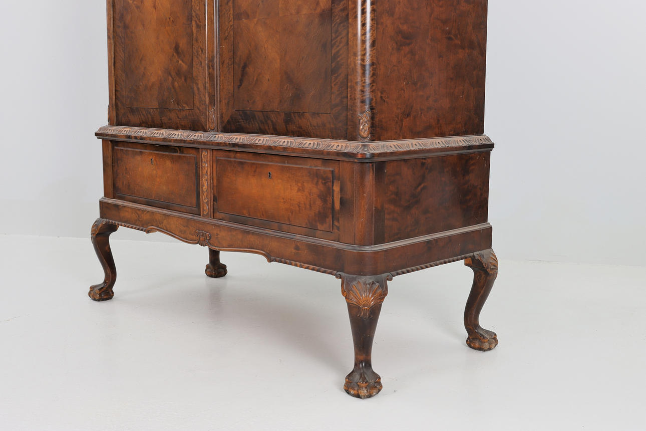 Linneskåp, bonad björk, skurna detaljer, claw ballavslut, Chippendalestil, 2 lådor, dörrpar med intarsia och bakomliggande hyllplan.