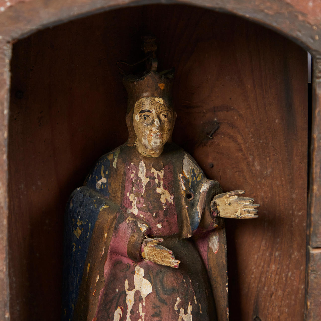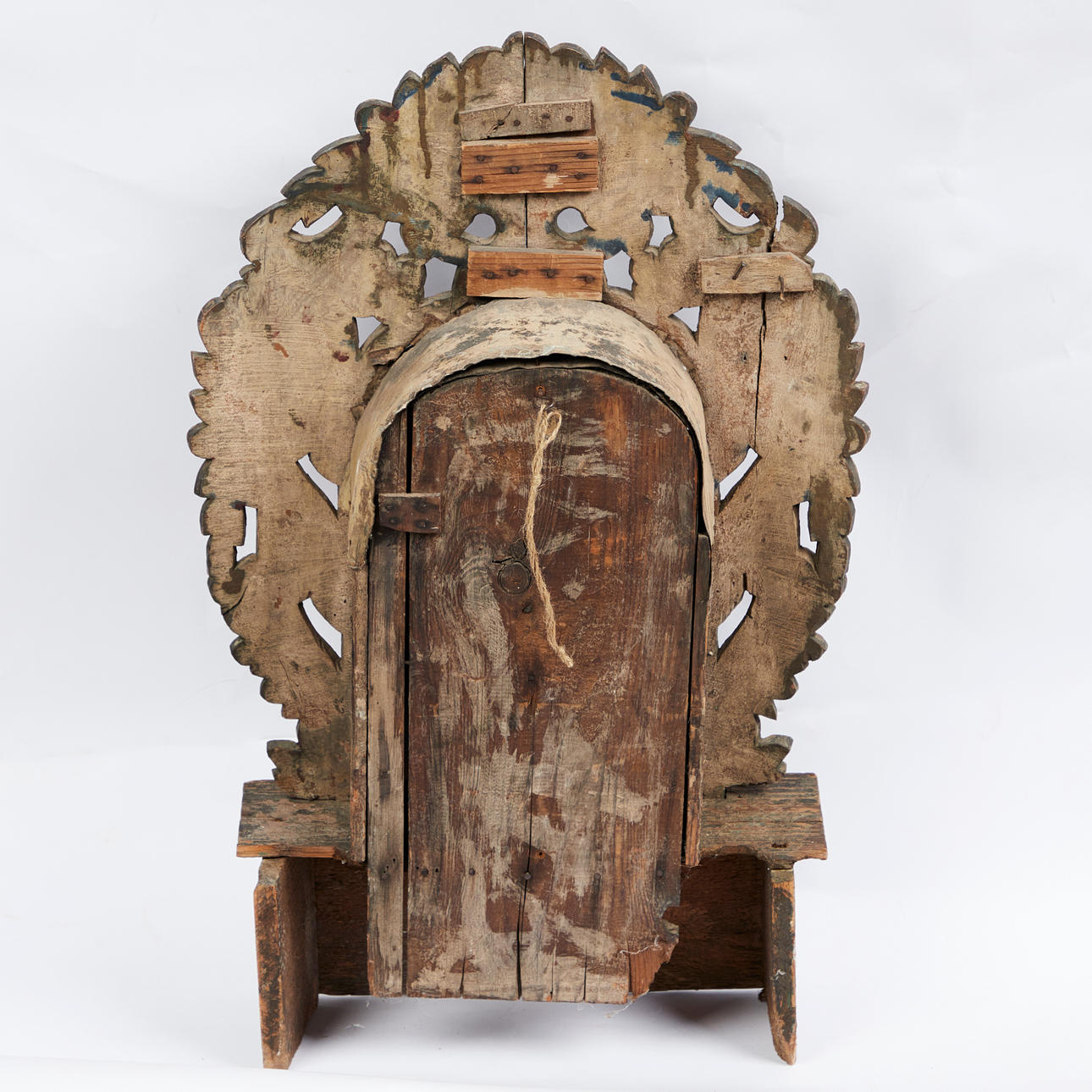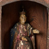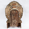 Hus altare, trä, 1890, Indien. Trä altare med en oval dörröppning och en Madonna staty med krona, dekorerad med röd och blå dekoration och blommig genombrutna ornament, tillbaka med väggmontering, H.76cm, W.47cm, D.13cm.