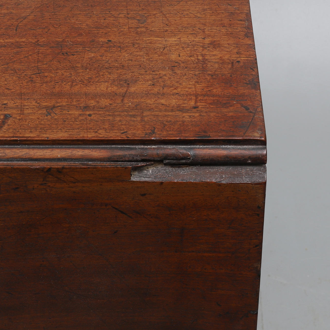 återställd, knackade, markerade, repad och färgad, ursprungligen med en ändlåda, nu saknas, och ersätts av en panel av mahogny, delar, bitar ”låt in”, element som saknas från ett av de gångjärniga bladen.
